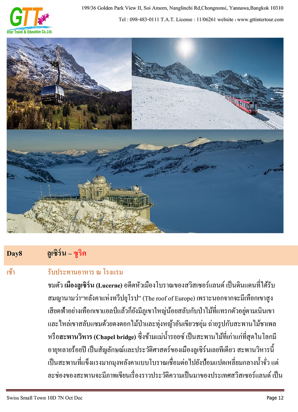 ซูริค - ไมนาว - ซังค์ กาลเลิน - วาดุซ - คูร์ – Glacier Express รถไฟสายโรแมนติก - เซอร์แมท เมืองไร้มลพิษแห่งเทือกเขาแอลป์ - นั่งรถรางกรอเนอร์เกรตชมยอดเขาแมทเทอร์ฮอร์น- Tasch - แช่น้ำร้อนที่ลูเคอร์แบด - มองเทรอซ์ - อีเวอร์ดง เล บาร์ - แกรนด์ซง – เมืองหลวงมรดกโลกเบิร์น - กรินเดอวาล - ยอดเขาฟุงเฟรามรดกโลก - เลาเทอร์บรุนเนน - ลูเซิร์น - ชาฟฟ์เฮาเซิน - Sten Am Rhine - ซูริค