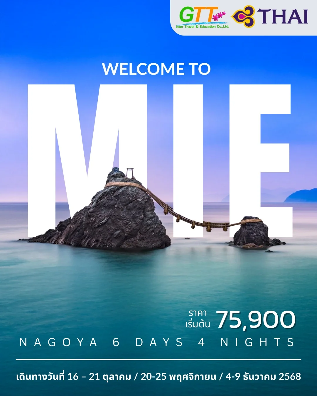 ทัวร์ญี่ปุ่นสุดคุ้ม MIE – NAGOYA 6 วัน 4 คืน พาเที่ยวครบไฮไลท์ ศาลเจ้าอิเสะ ถนนโบราณโอคาเกะโยโคะโจ เกาะไข่มุกมิกิโมโตะ รถไฟนินจา นาบานะโนะซาโตะไฟประดับ ปราสาทนาโกย่า พร้อมช้อปปิ้งเต็มอิ่ม ต.ค.–ธ.ค. 68 นี้