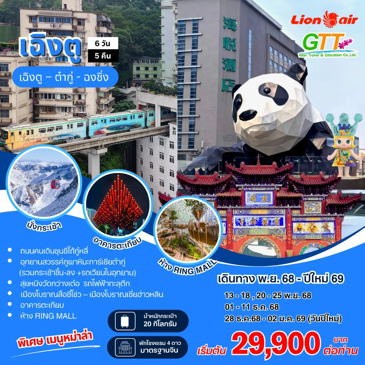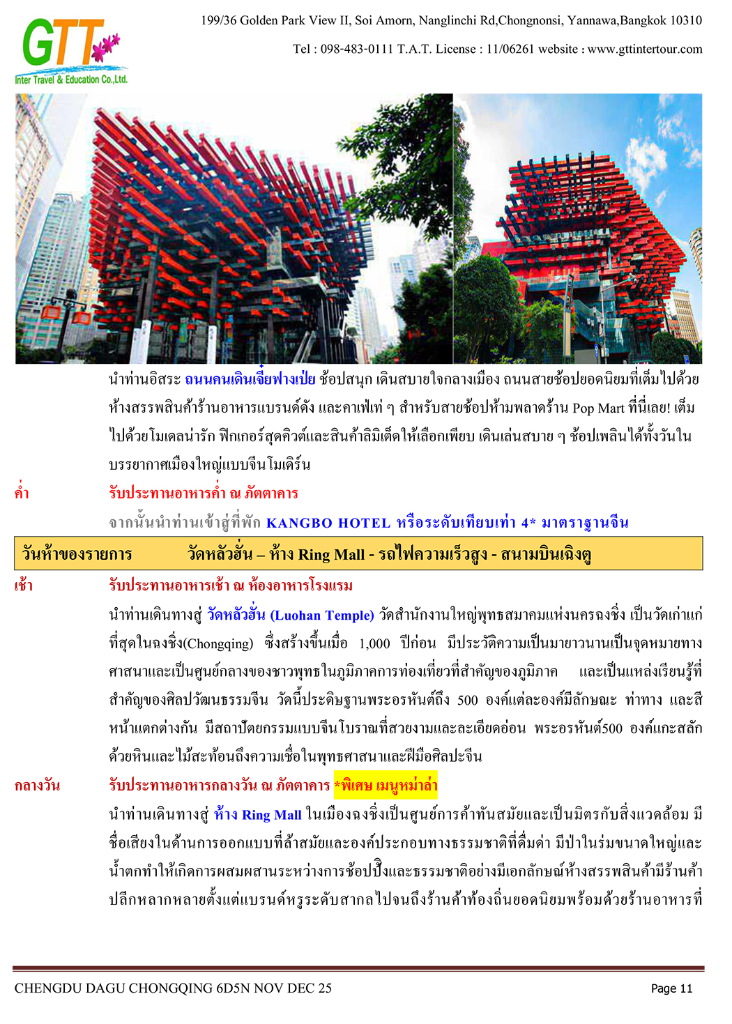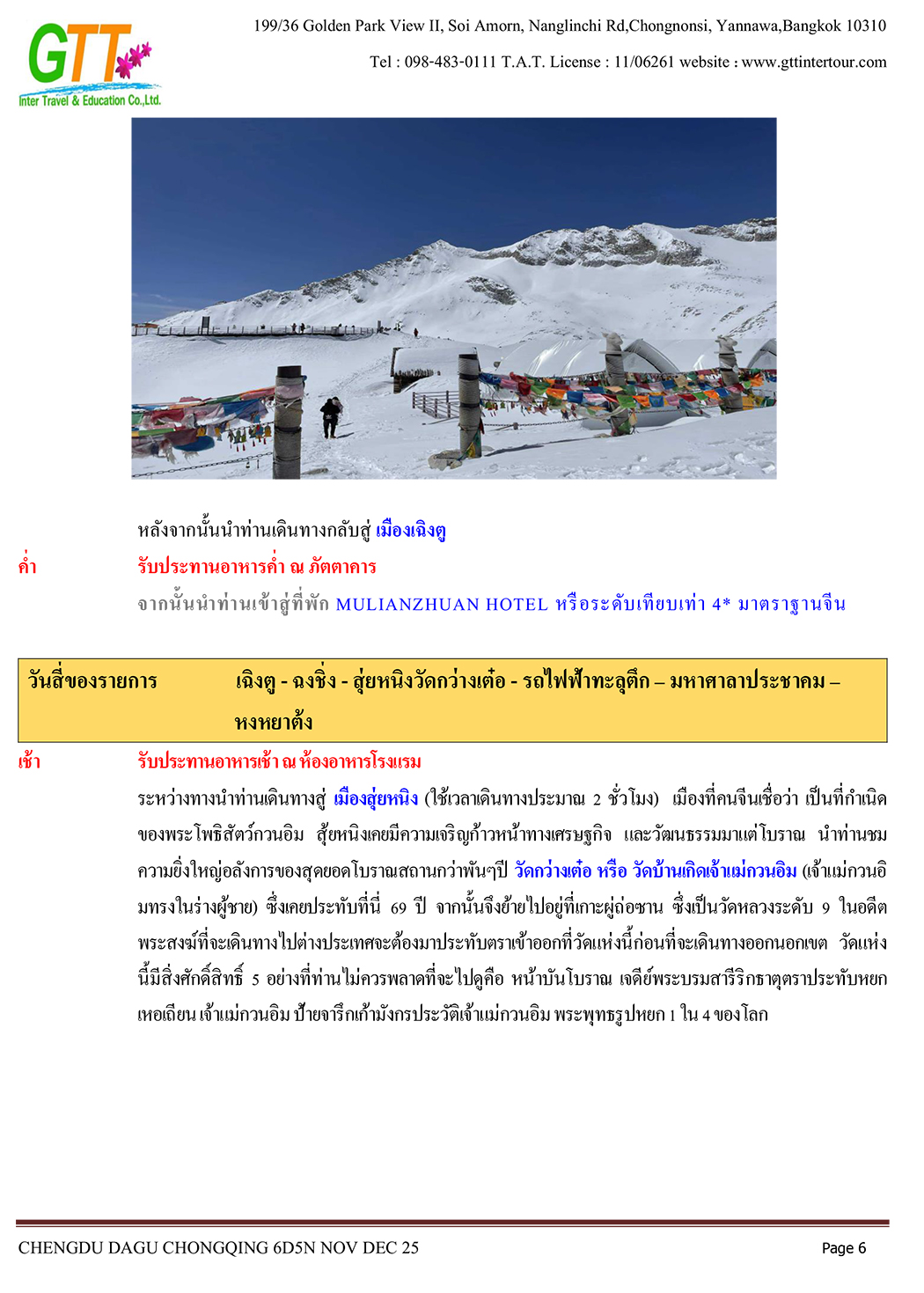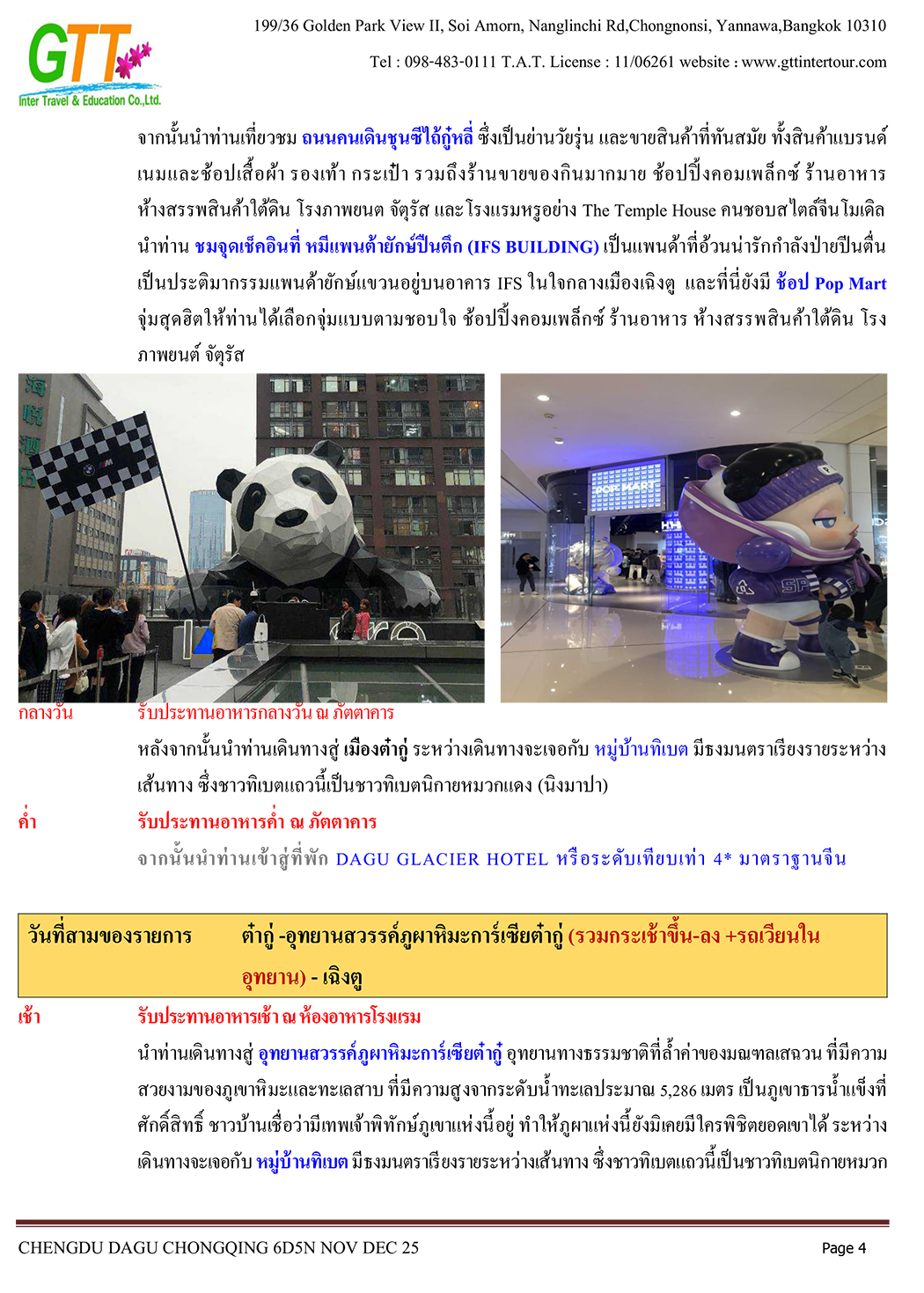 เฉิงตู - ไท่กู่หลี่ - ถนนคนเดินชนซีลู่ - สวรรค์ภูผาหิมะการ์เซียต๋ากู่ (รวมรถประจำทาง+กระเช้า) - สุ่ยหนิงวัดกว่างเต๋อ - นั่งรถไฟฟ้าทะลุตึก - หงหยาต้ง - เมืองโบราณสือซี่โข่ว - เซี่ยห่าวหลี่ - ฉงชิ่ง - อาคารตะเกียบ - ถนนคนเดินเจี่ยฟางเป่ย - วัดหลัวฮั่น - ห้าง Ring Mall