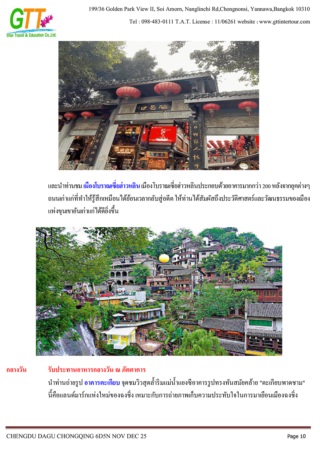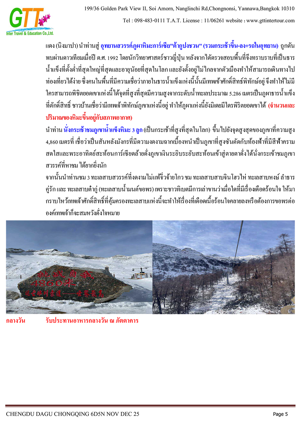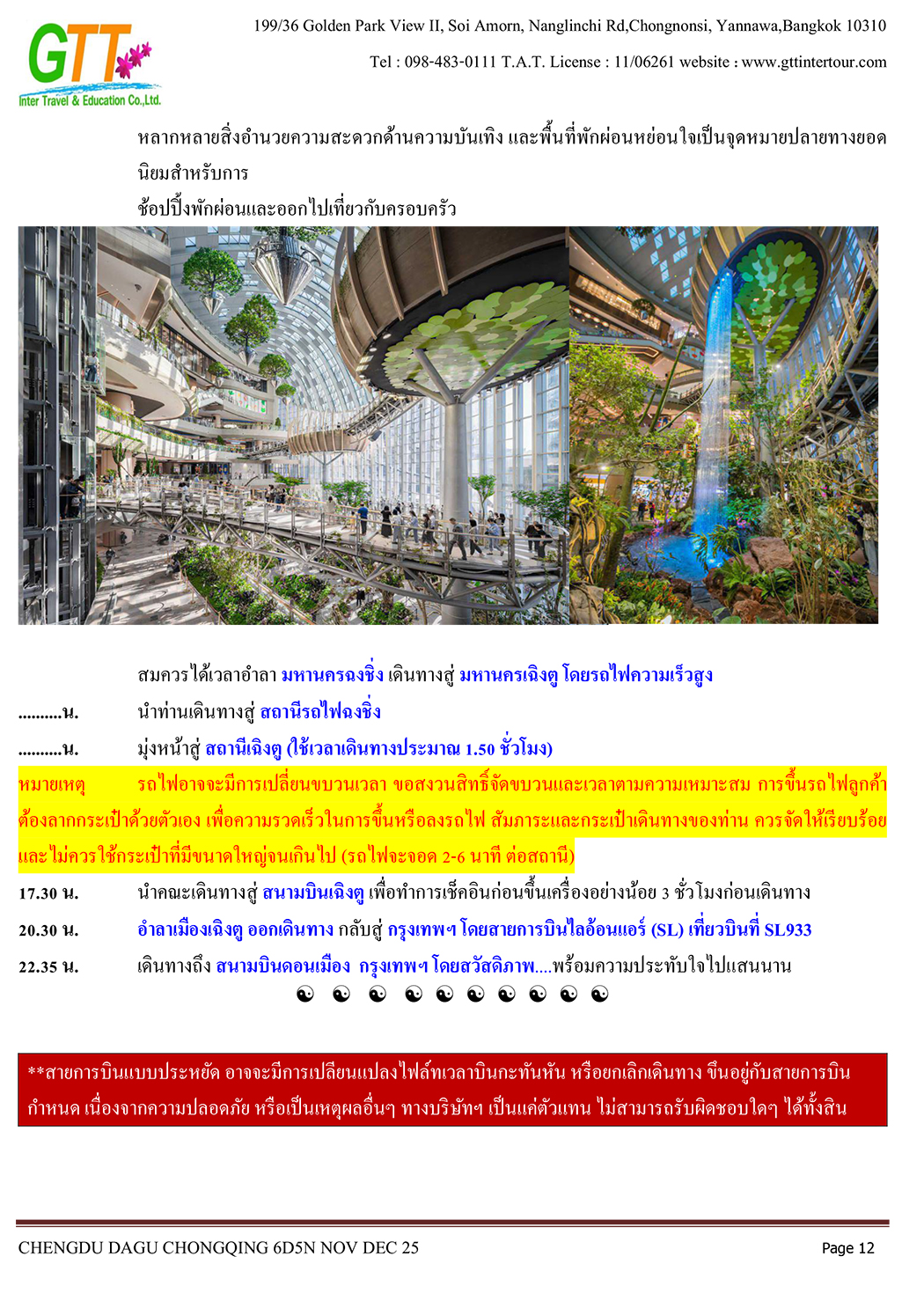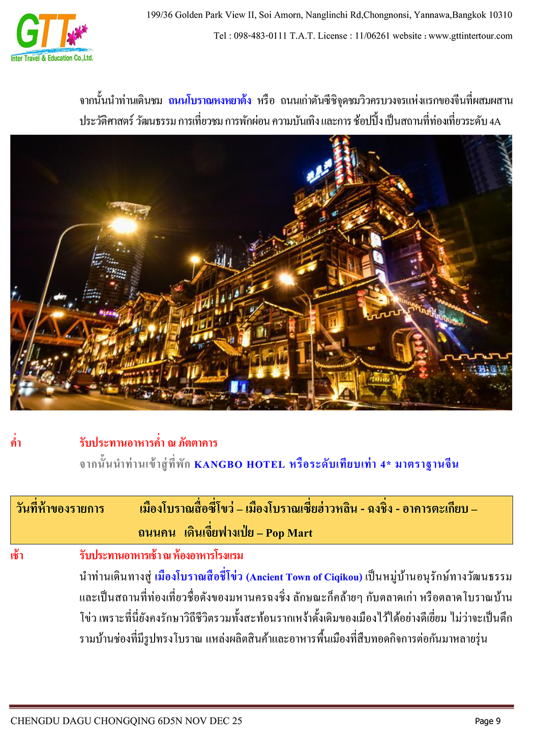 เฉิงตู - ไท่กู่หลี่ - ถนนคนเดินชนซีลู่ - สวรรค์ภูผาหิมะการ์เซียต๋ากู่ (รวมรถประจำทาง+กระเช้า) - สุ่ยหนิงวัดกว่างเต๋อ - นั่งรถไฟฟ้าทะลุตึก - หงหยาต้ง - เมืองโบราณสือซี่โข่ว - เซี่ยห่าวหลี่ - ฉงชิ่ง - อาคารตะเกียบ - ถนนคนเดินเจี่ยฟางเป่ย - วัดหลัวฮั่น - ห้าง Ring Mall