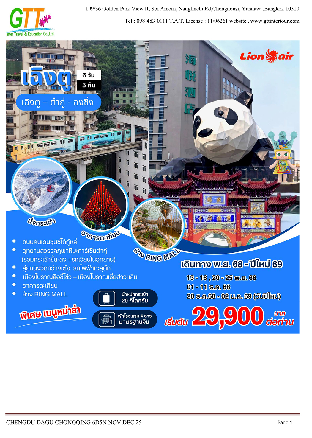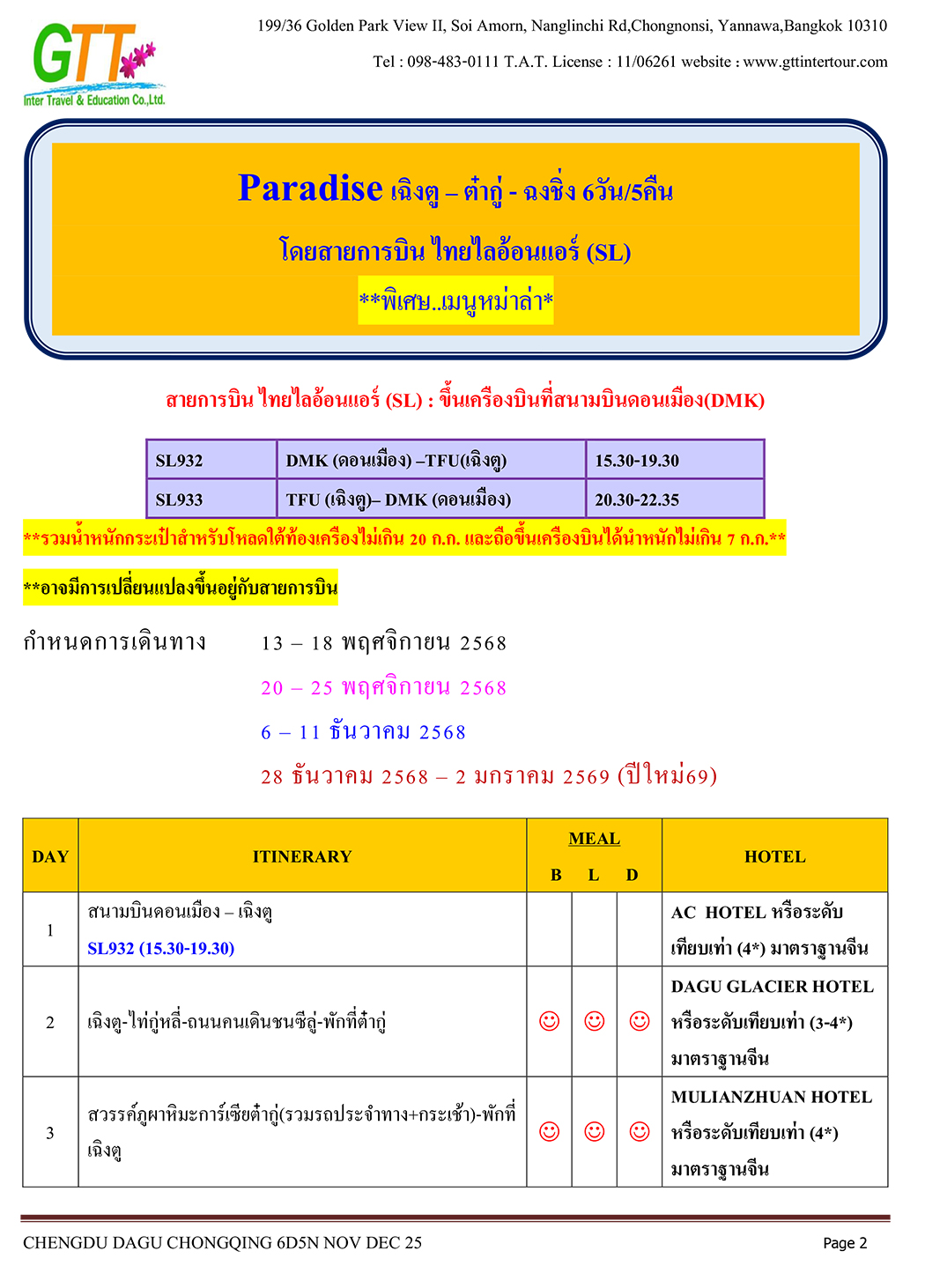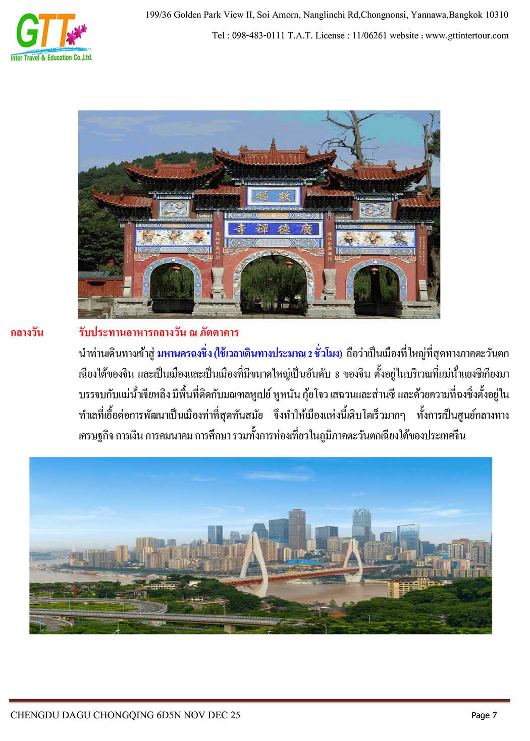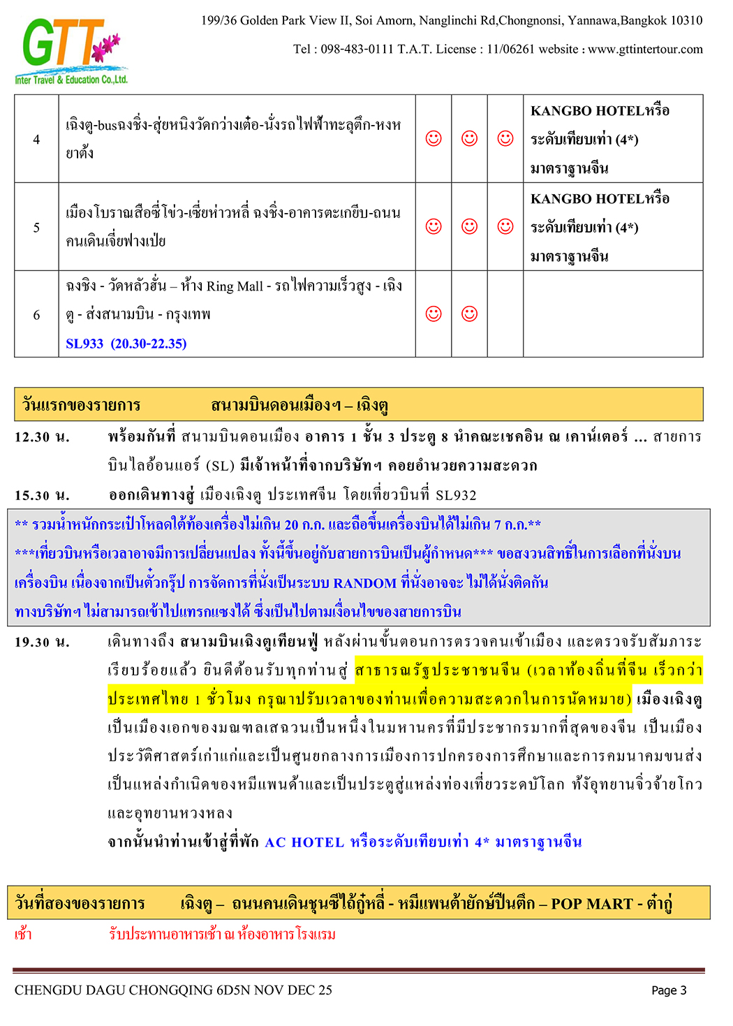 เฉิงตู - ไท่กู่หลี่ - ถนนคนเดินชนซีลู่ - สวรรค์ภูผาหิมะการ์เซียต๋ากู่ (รวมรถประจำทาง+กระเช้า) - สุ่ยหนิงวัดกว่างเต๋อ - นั่งรถไฟฟ้าทะลุตึก - หงหยาต้ง - เมืองโบราณสือซี่โข่ว - เซี่ยห่าวหลี่ - ฉงชิ่ง - อาคารตะเกียบ - ถนนคนเดินเจี่ยฟางเป่ย - วัดหลัวฮั่น - ห้าง Ring Mall