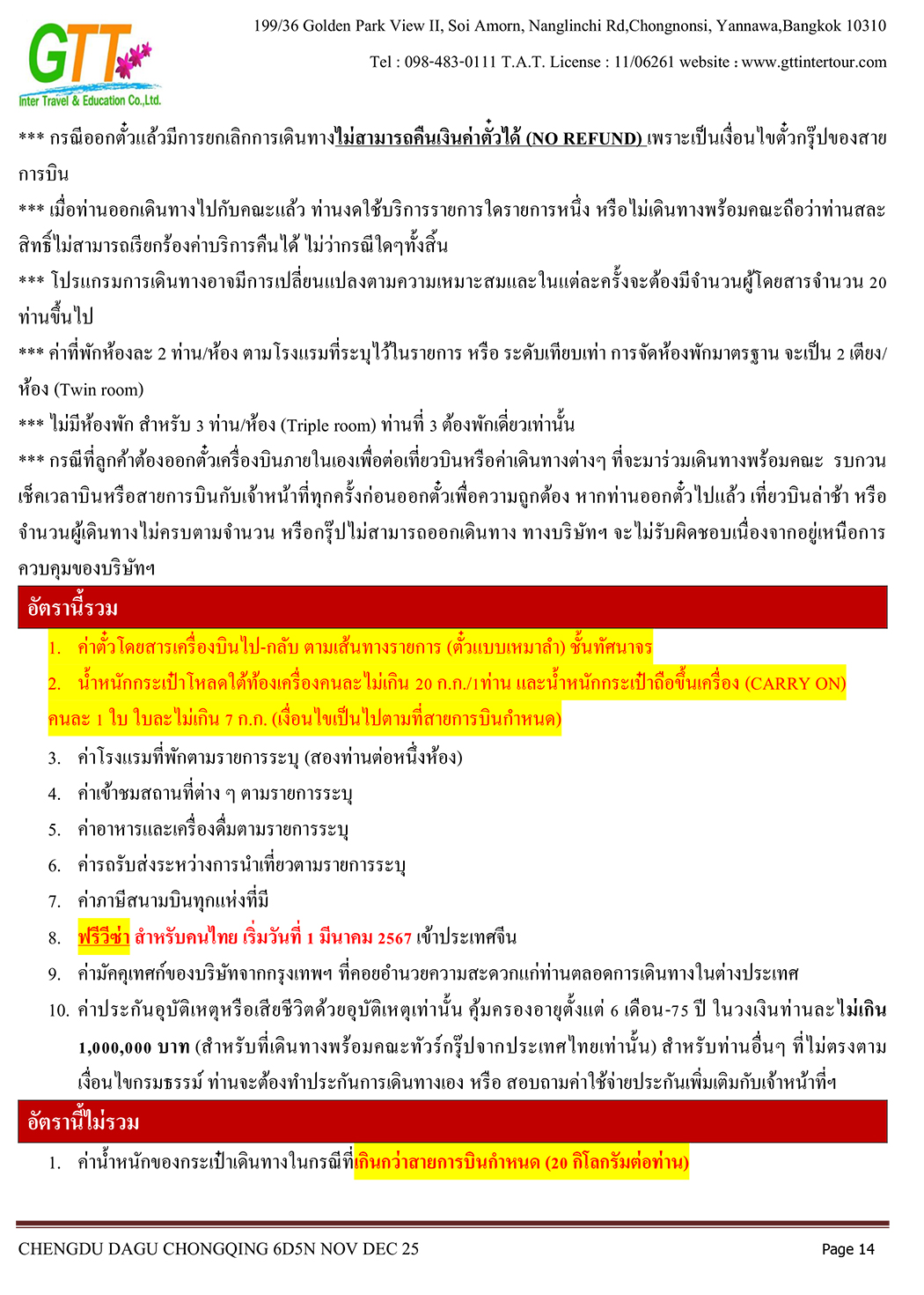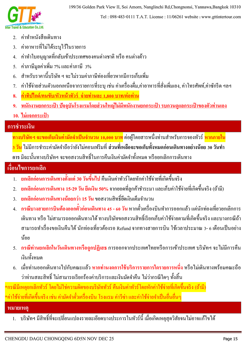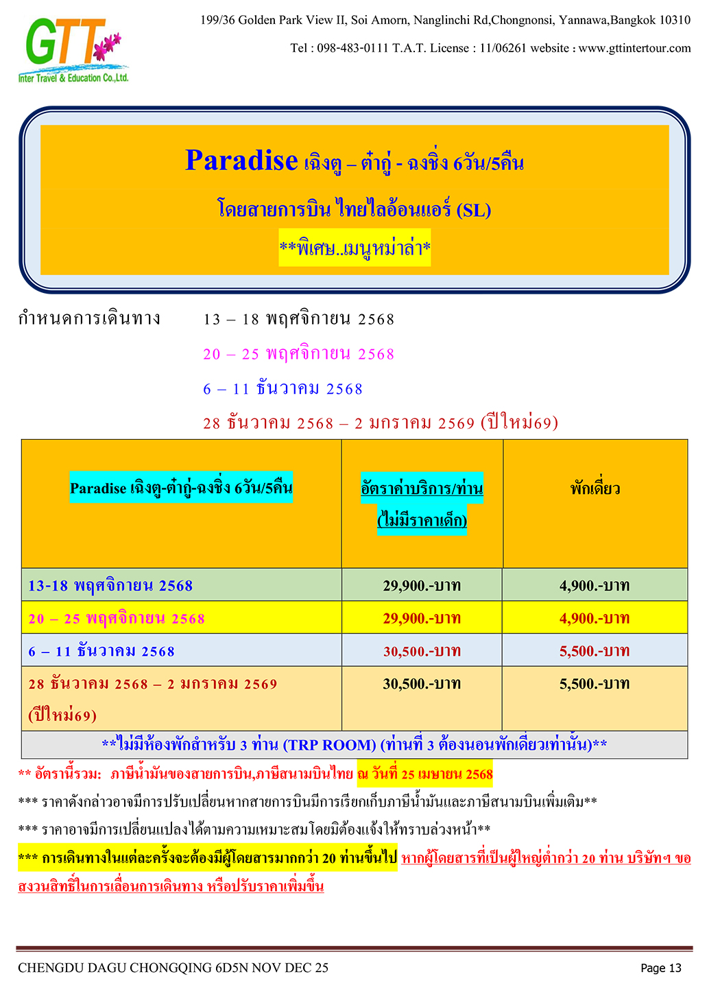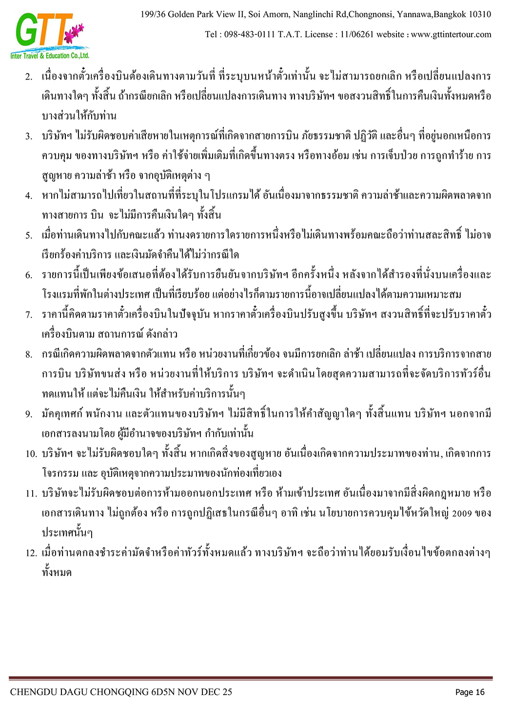 เฉิงตู - ไท่กู่หลี่ - ถนนคนเดินชนซีลู่ - สวรรค์ภูผาหิมะการ์เซียต๋ากู่ (รวมรถประจำทาง+กระเช้า) - สุ่ยหนิงวัดกว่างเต๋อ - นั่งรถไฟฟ้าทะลุตึก - หงหยาต้ง - เมืองโบราณสือซี่โข่ว - เซี่ยห่าวหลี่ - ฉงชิ่ง - อาคารตะเกียบ - ถนนคนเดินเจี่ยฟางเป่ย - วัดหลัวฮั่น - ห้าง Ring Mall