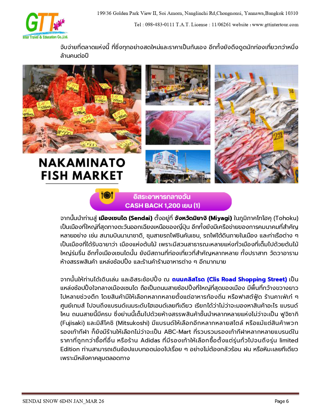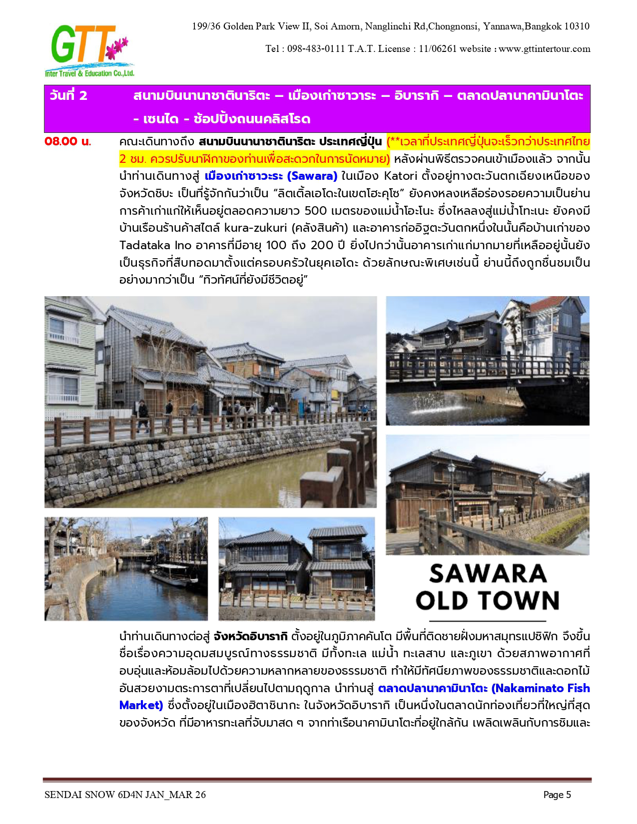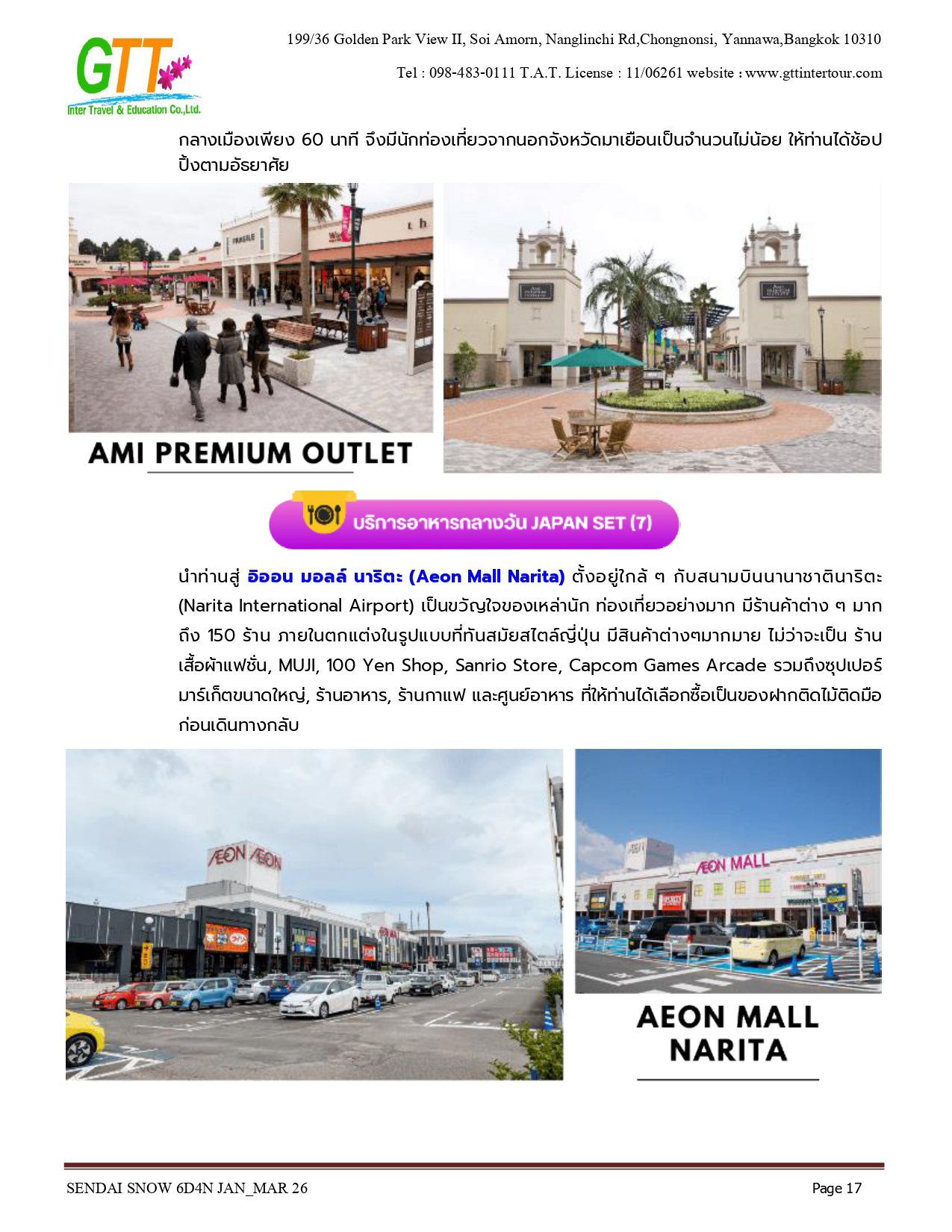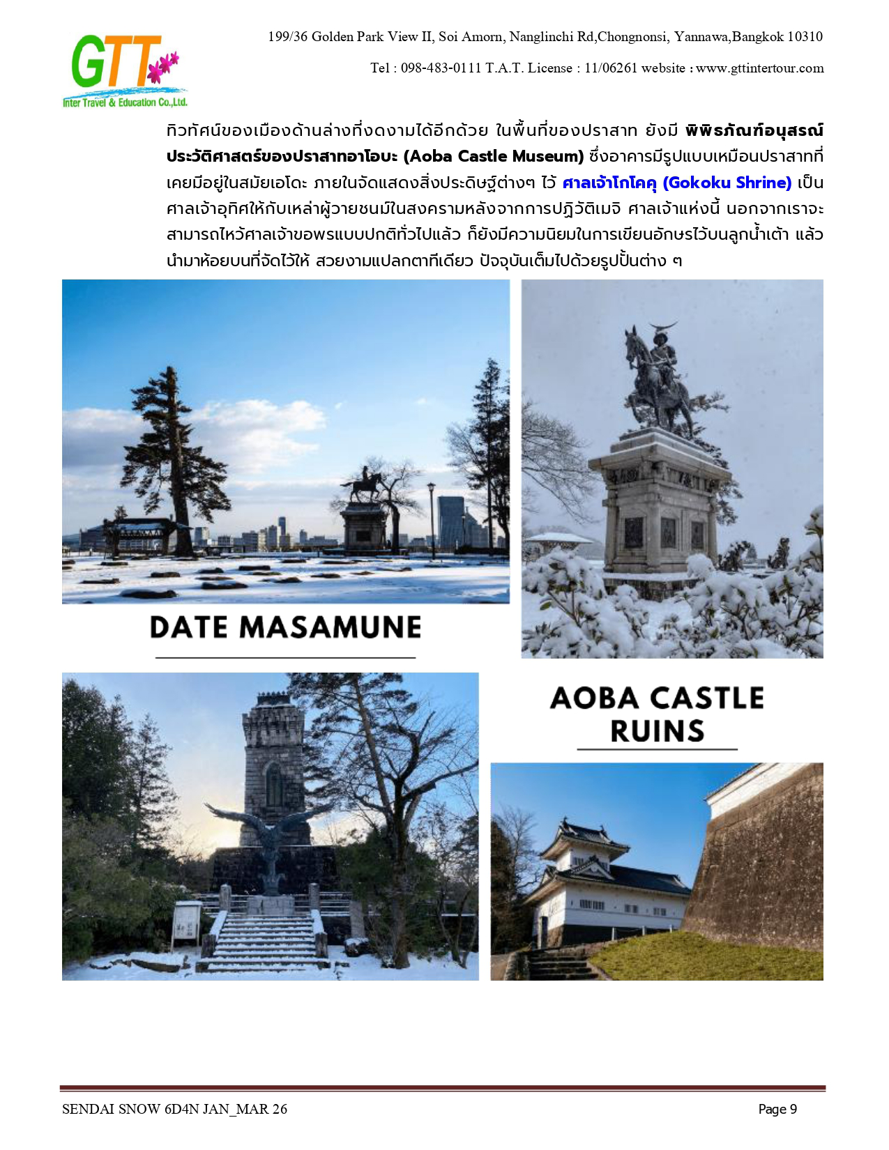 เมืองเก่าซาวาระ - อิบารากิ - ตลาดปลานาคามินาโตะ - เซนได - ช้อปปิ้งถนนคลิสโรด - ซากปราสาทอาโอบะ - รูปปั้นซามูไร ตาเดียว - DATE MASAMUNE - ศาลเจ้าโทโคคุ - ยามากาตะ - หมู่บ้านโบราณกินซังออนเซ็น - ZAO CHUO ROPEWAY - ลานสกีซาโอะ - โอสึ วากามัตสึ - ทะเลสาบอิวานะชิโระ - ปราสาทสีรุงะ (ด้านนอก) - สวนสาธารณะสึรุงะ - โคริยาม่า - ชิโมะโงะ - หมู่บ้านโออุจิ จูคุ - อิบารากิ - อามิ พรีเมี่ยม เอาท์เล็ท - นาริตะ - AEON MALL NARITA
