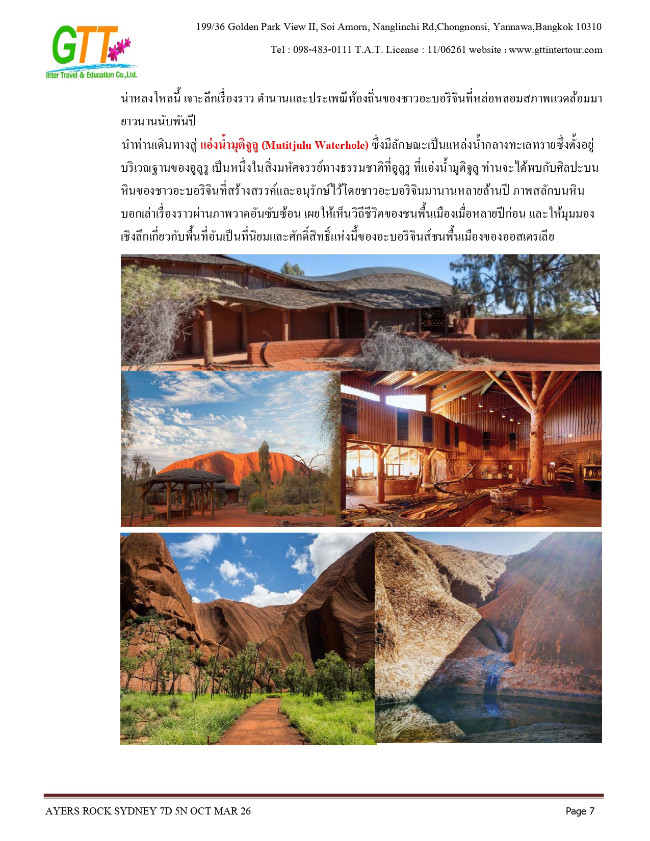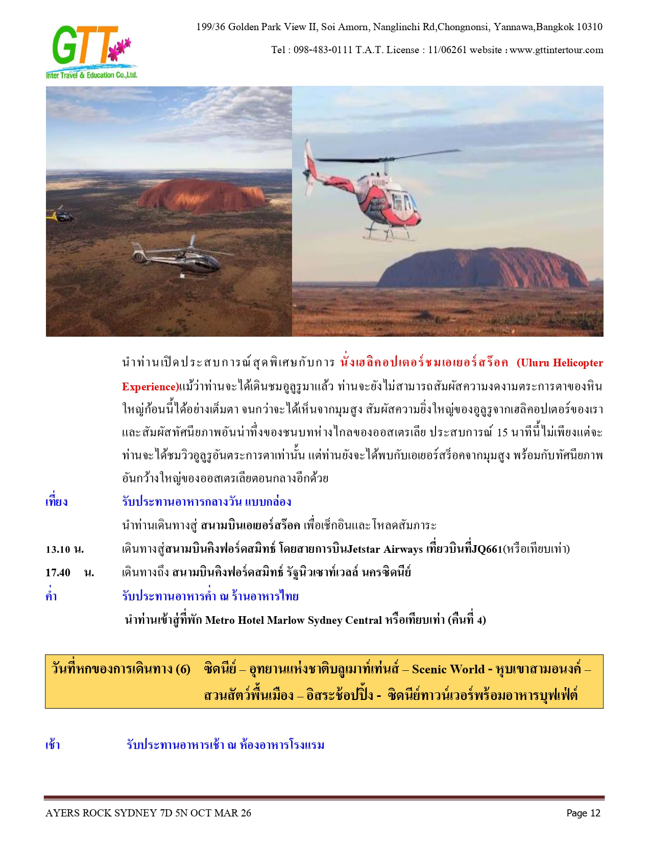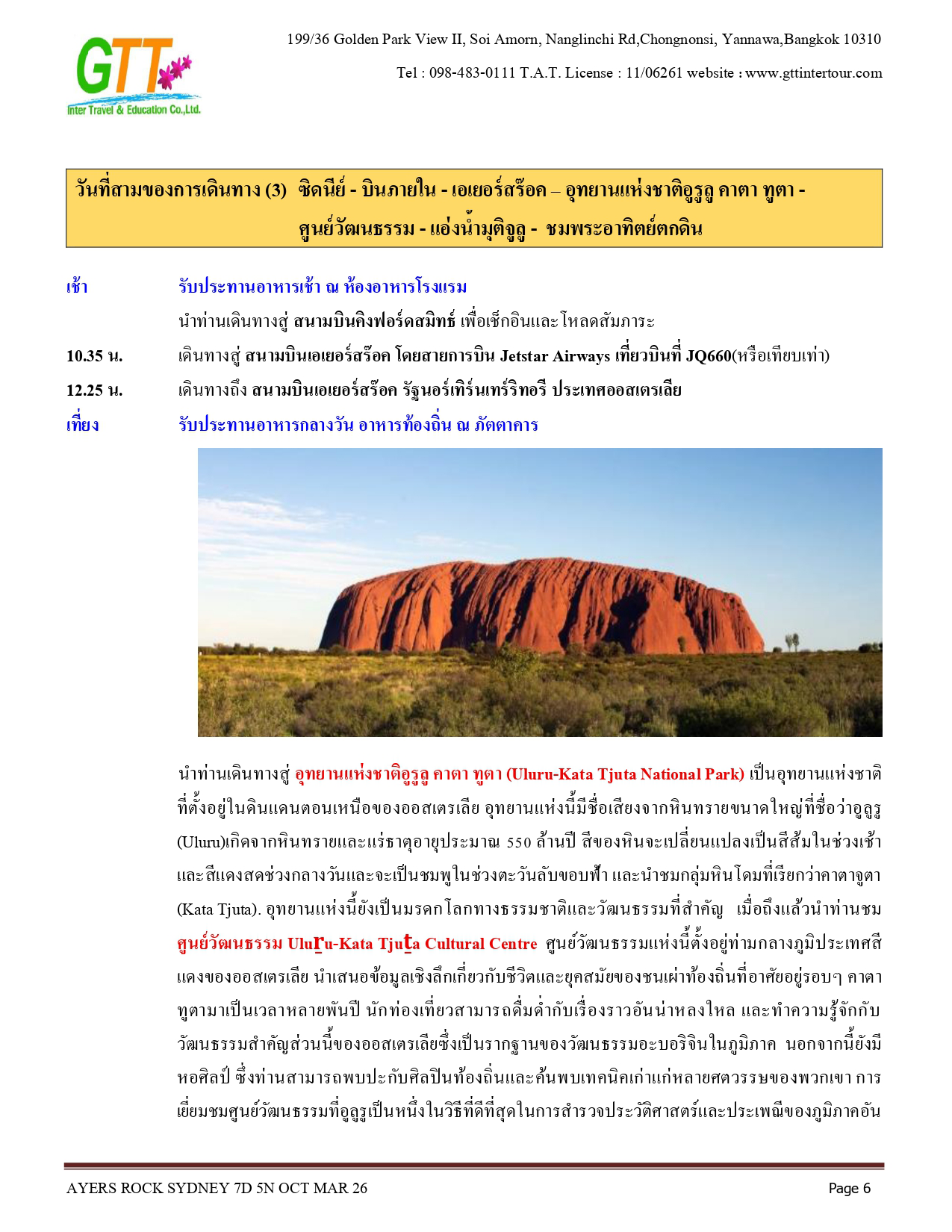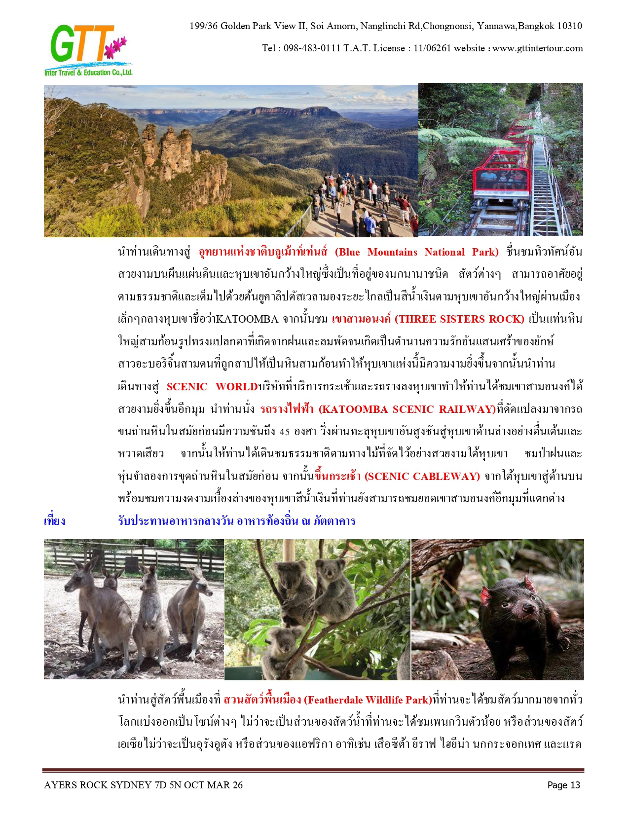 ซิดนีย์ - ชมเมือง - หาดบอนได - ม้าหินของมิสซิสแม็คควอรี่ - ล่องเรือชมอ่าวซิดนีย์ - ย่านเดอะร๊อคส์ - อุทยานแห่งชาติอูรูลู คาตา ทูตา - ศูนย์วัฒนธรรม - แอ่งน้ำมุติจูลู - ชมพระอาทิตย์ตกดิน - คาตาจูตา - ดิดเจอรี่ดูเวิร์คช็อป - นั่งเฮลิคอปเตอร์ชมเอเยอร์สร๊อค - อุทยานแห่งชาติบลูเมาท์เท่นส์ - Scenic World - หุบเขาสามอนงค์ - สวนสัตว์พื้นเมือง - อิสระช้อปปิ้ง - ซิดนีย์ทาวน์เวอร์พร้อมอาหารบุฟเฟ่ต์นานาชาติ