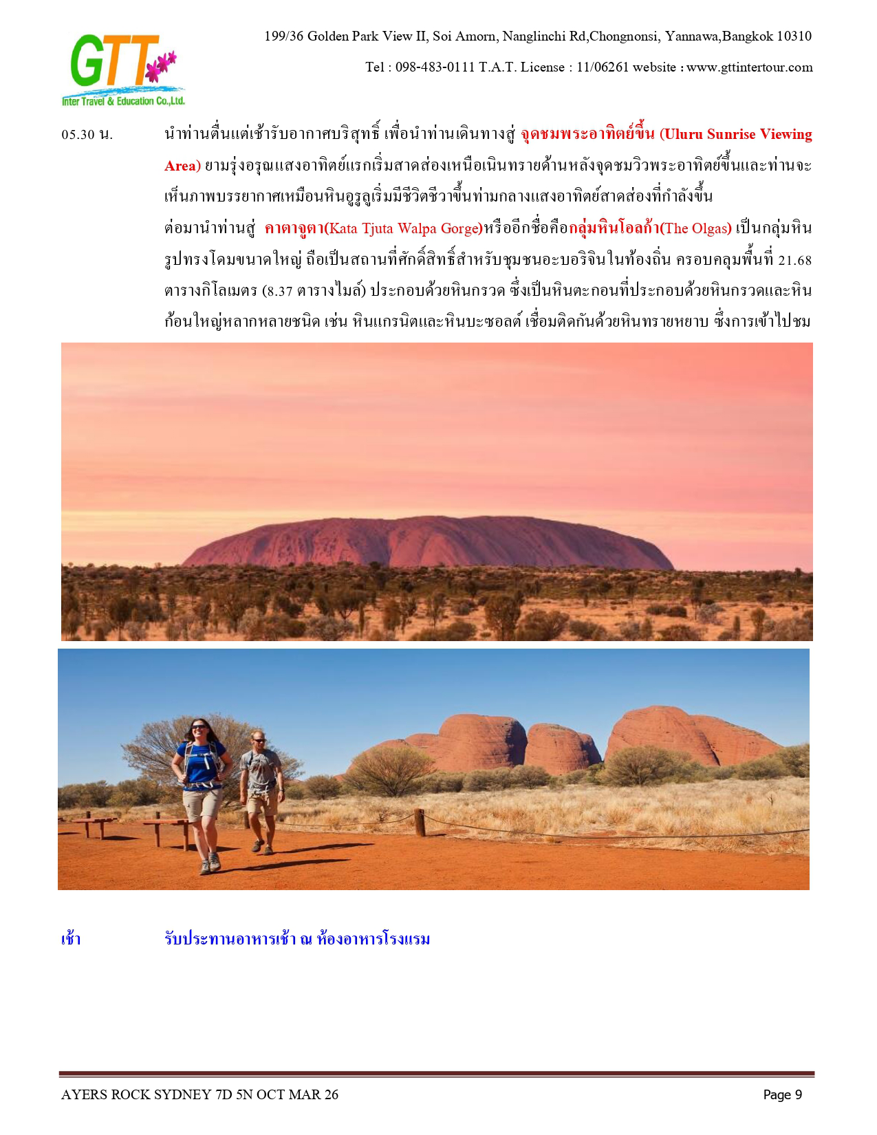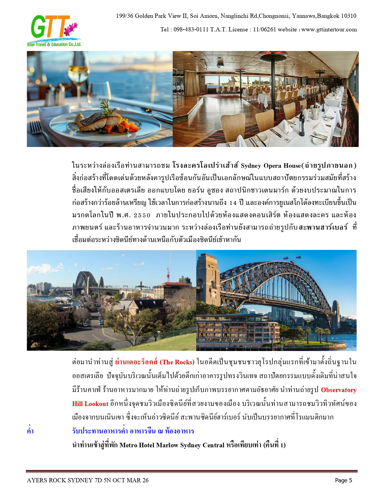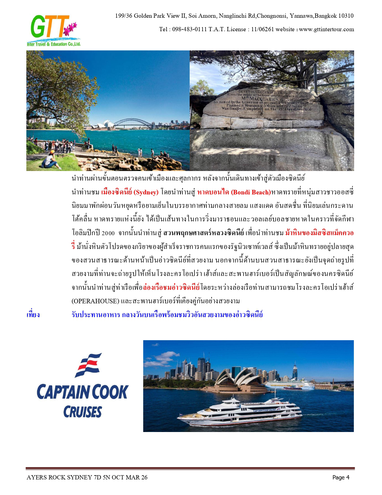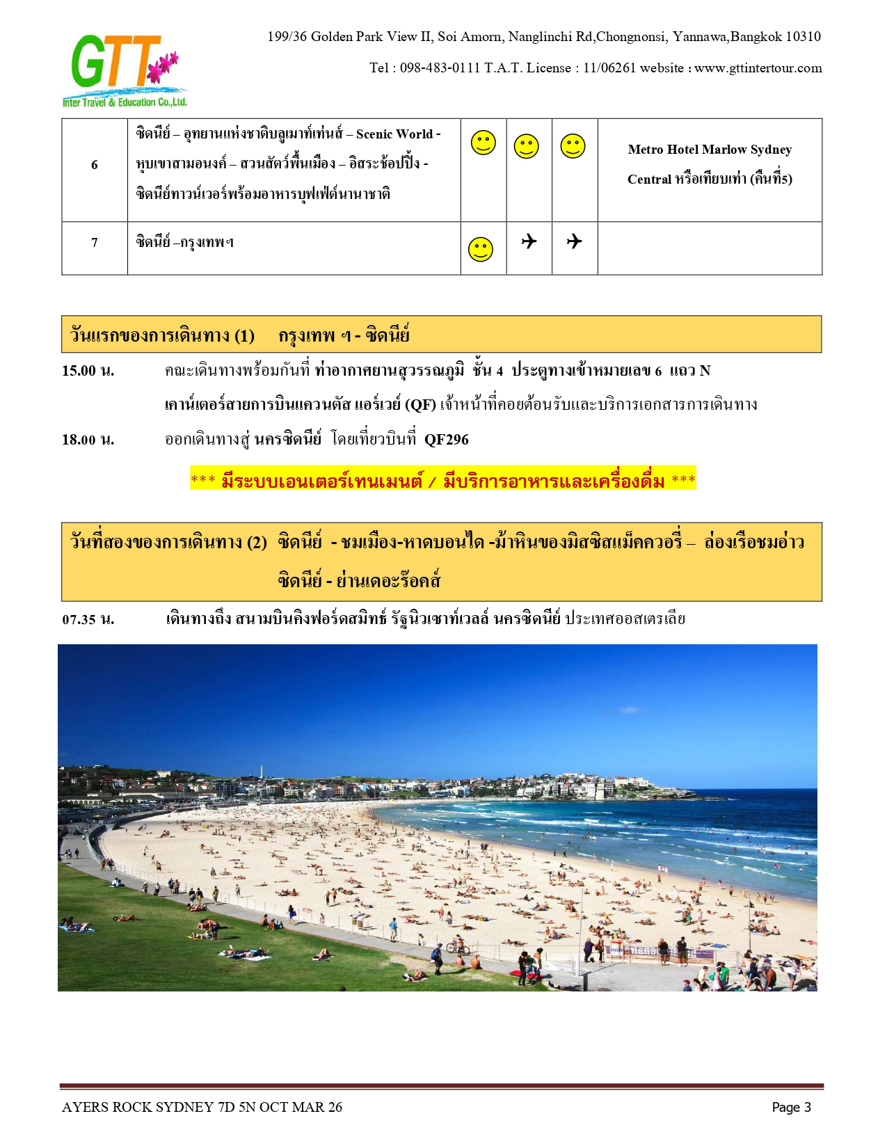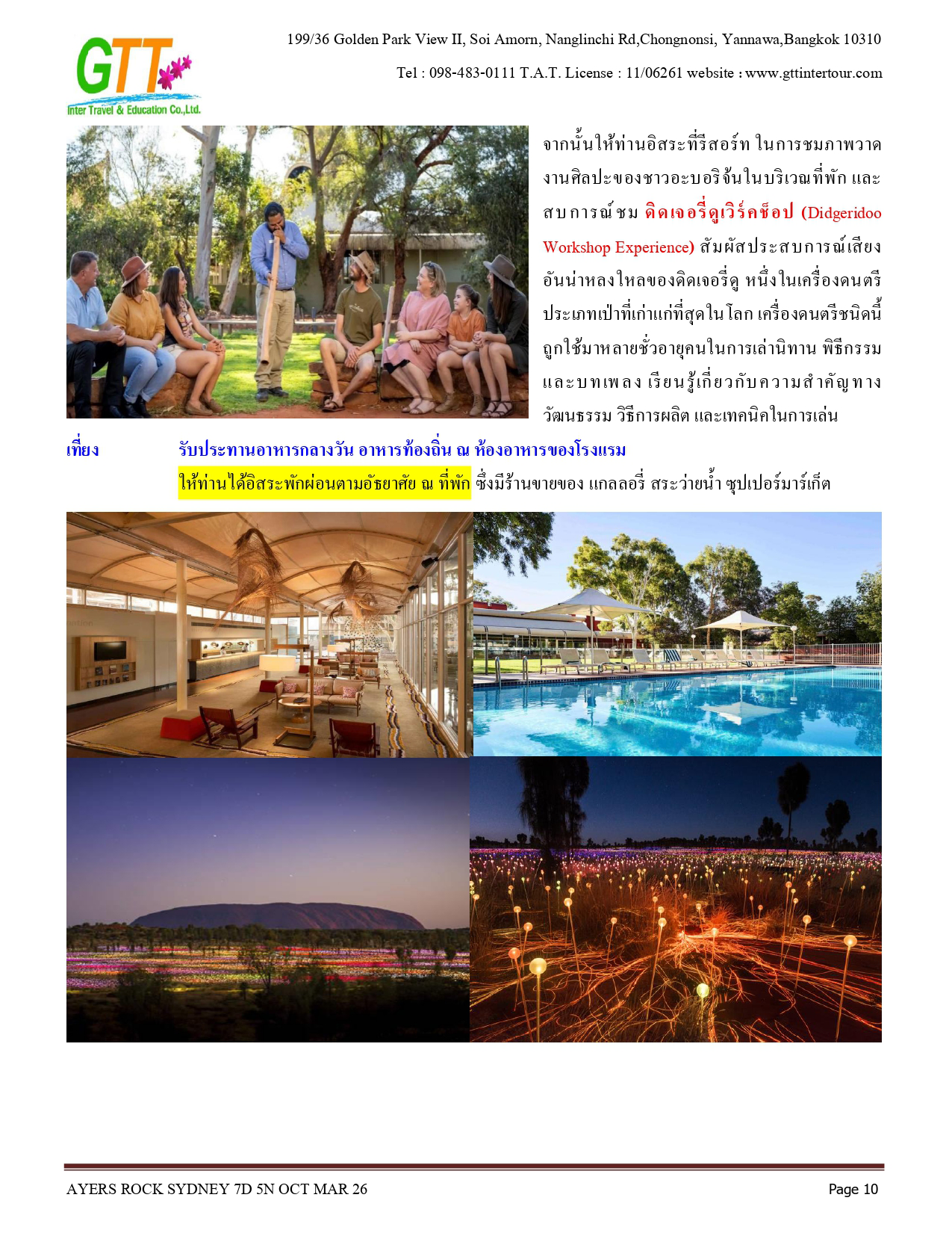 ซิดนีย์ - ชมเมือง - หาดบอนได - ม้าหินของมิสซิสแม็คควอรี่ - ล่องเรือชมอ่าวซิดนีย์ - ย่านเดอะร๊อคส์ - อุทยานแห่งชาติอูรูลู คาตา ทูตา - ศูนย์วัฒนธรรม - แอ่งน้ำมุติจูลู - ชมพระอาทิตย์ตกดิน - คาตาจูตา - ดิดเจอรี่ดูเวิร์คช็อป - นั่งเฮลิคอปเตอร์ชมเอเยอร์สร๊อค - อุทยานแห่งชาติบลูเมาท์เท่นส์ - Scenic World - หุบเขาสามอนงค์ - สวนสัตว์พื้นเมือง - อิสระช้อปปิ้ง - ซิดนีย์ทาวน์เวอร์พร้อมอาหารบุฟเฟ่ต์นานาชาติ