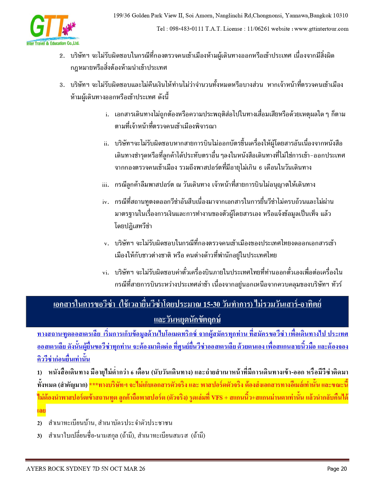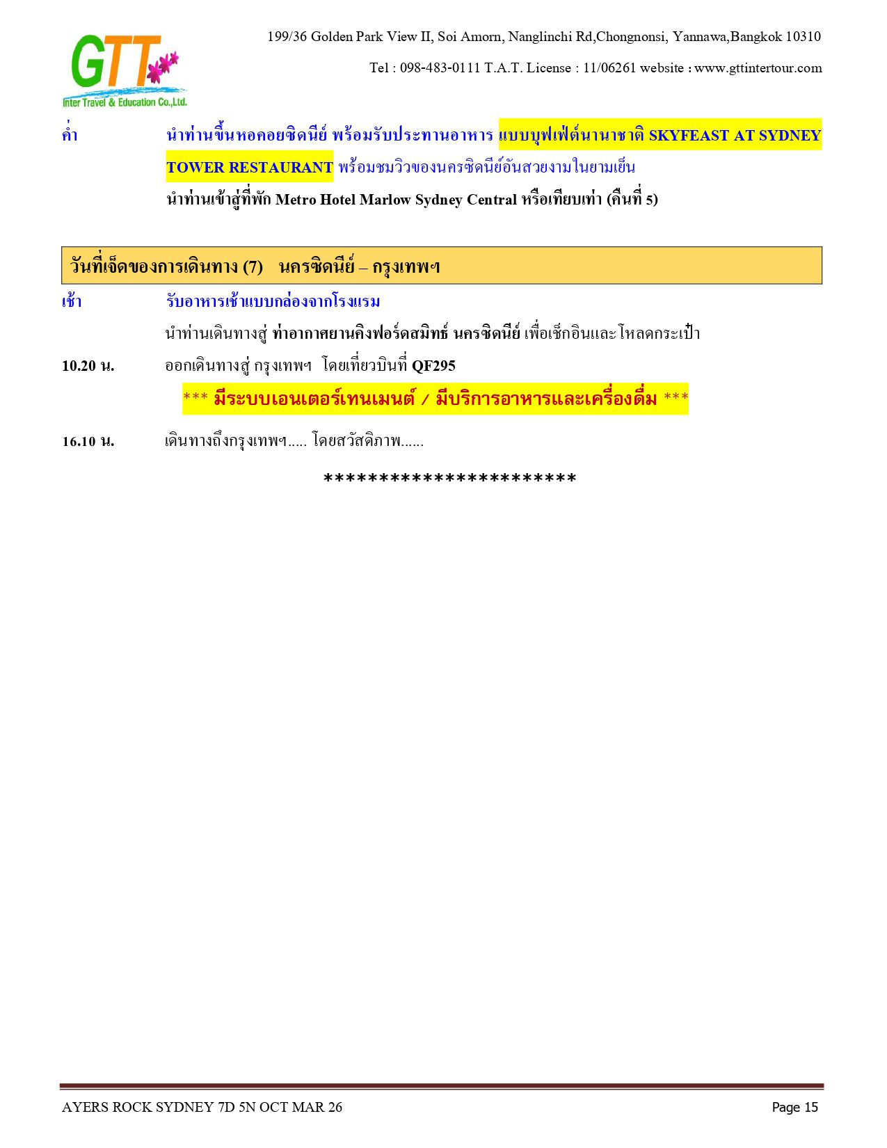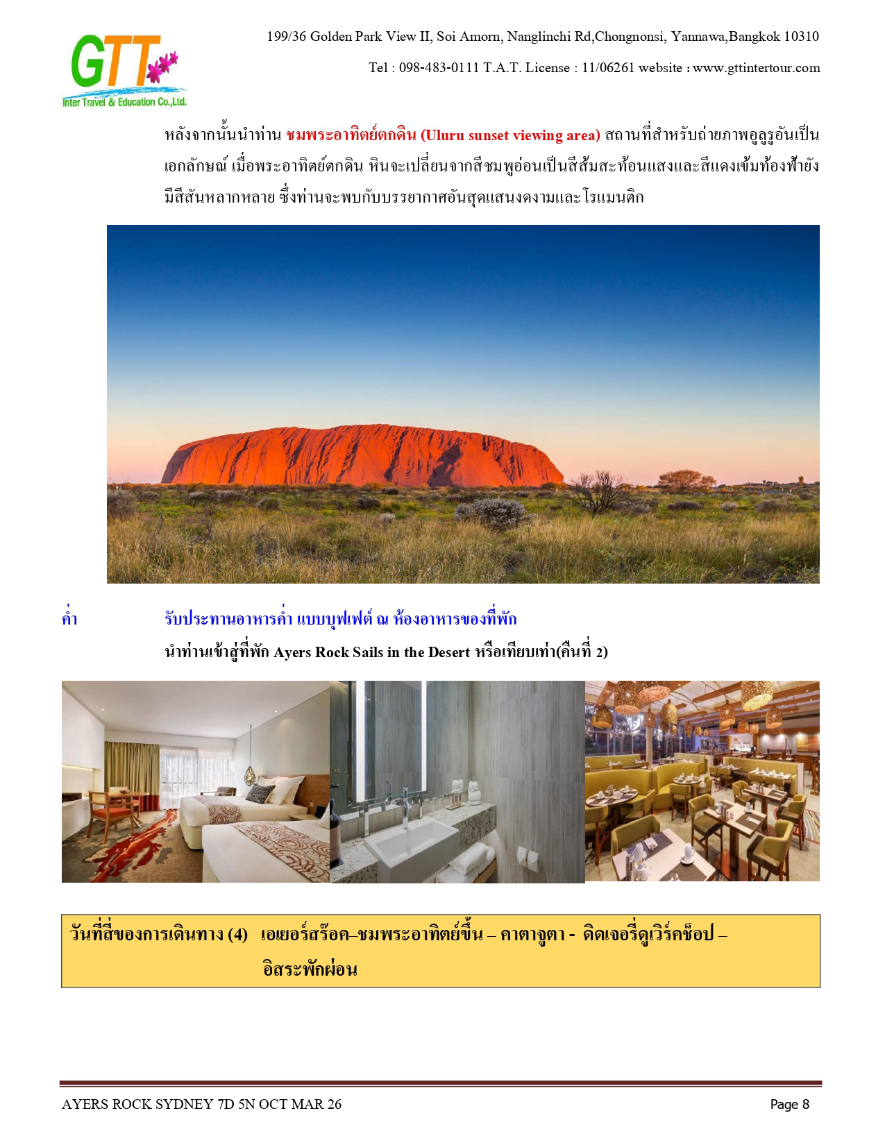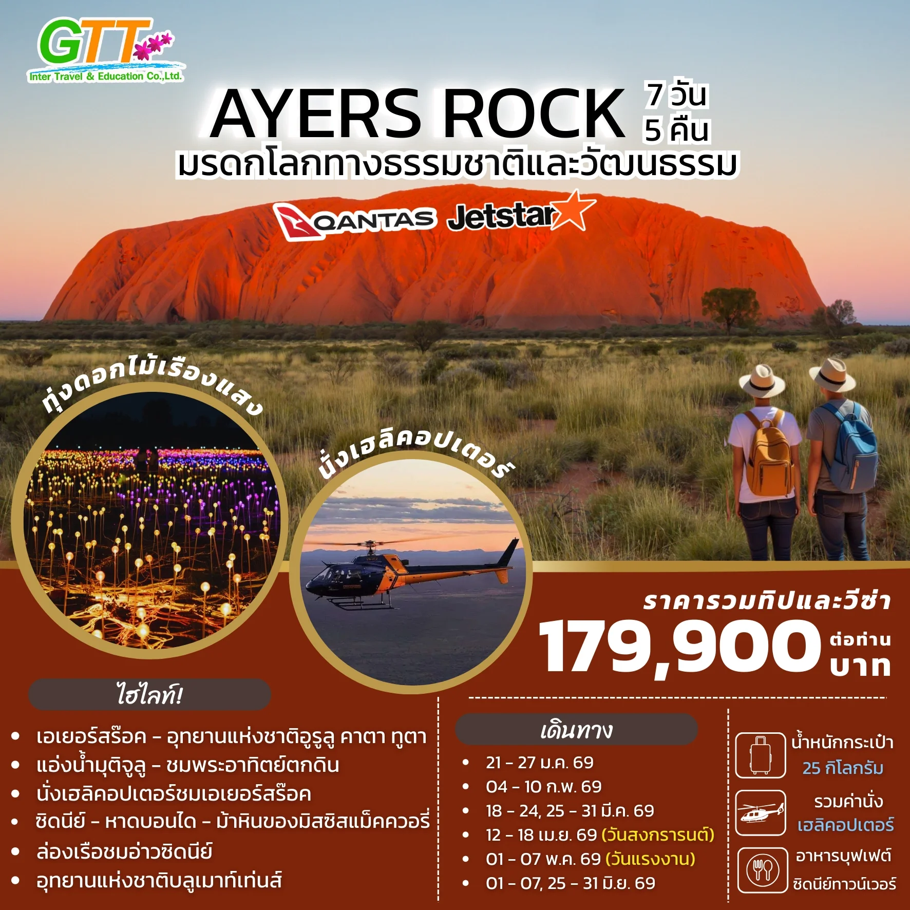 ซิดนีย์ - ชมเมือง - หาดบอนได - ม้าหินของมิสซิสแม็คควอรี่ - ล่องเรือชมอ่าวซิดนีย์ - ย่านเดอะร๊อคส์ - อุทยานแห่งชาติอูรูลู คาตา ทูตา - ศูนย์วัฒนธรรม - แอ่งน้ำมุติจูลู - ชมพระอาทิตย์ตกดิน - คาตาจูตา - ดิดเจอรี่ดูเวิร์คช็อป - นั่งเฮลิคอปเตอร์ชมเอเยอร์สร๊อค - อุทยานแห่งชาติบลูเมาท์เท่นส์ - Scenic World - หุบเขาสามอนงค์ - สวนสัตว์พื้นเมือง - อิสระช้อปปิ้ง - ซิดนีย์ทาวน์เวอร์พร้อมอาหารบุฟเฟ่ต์นานาชาติ