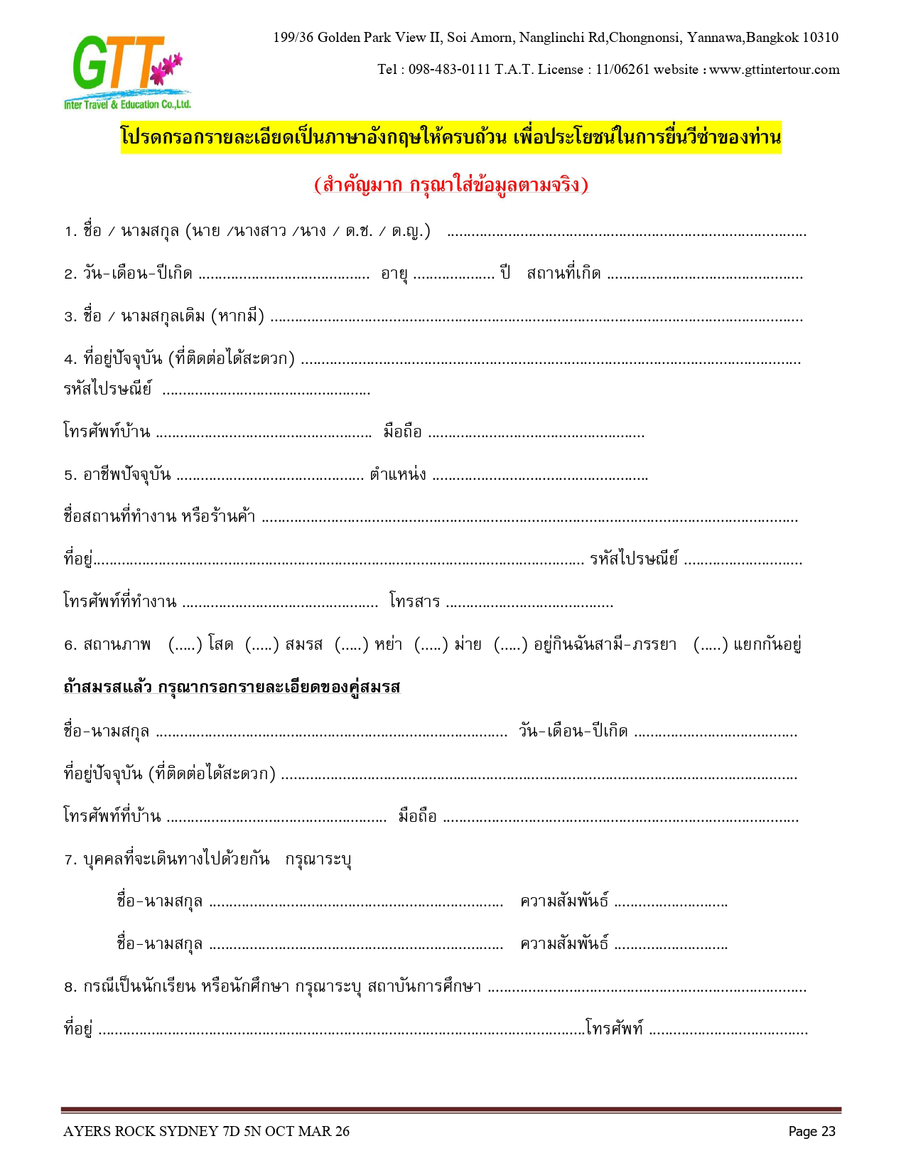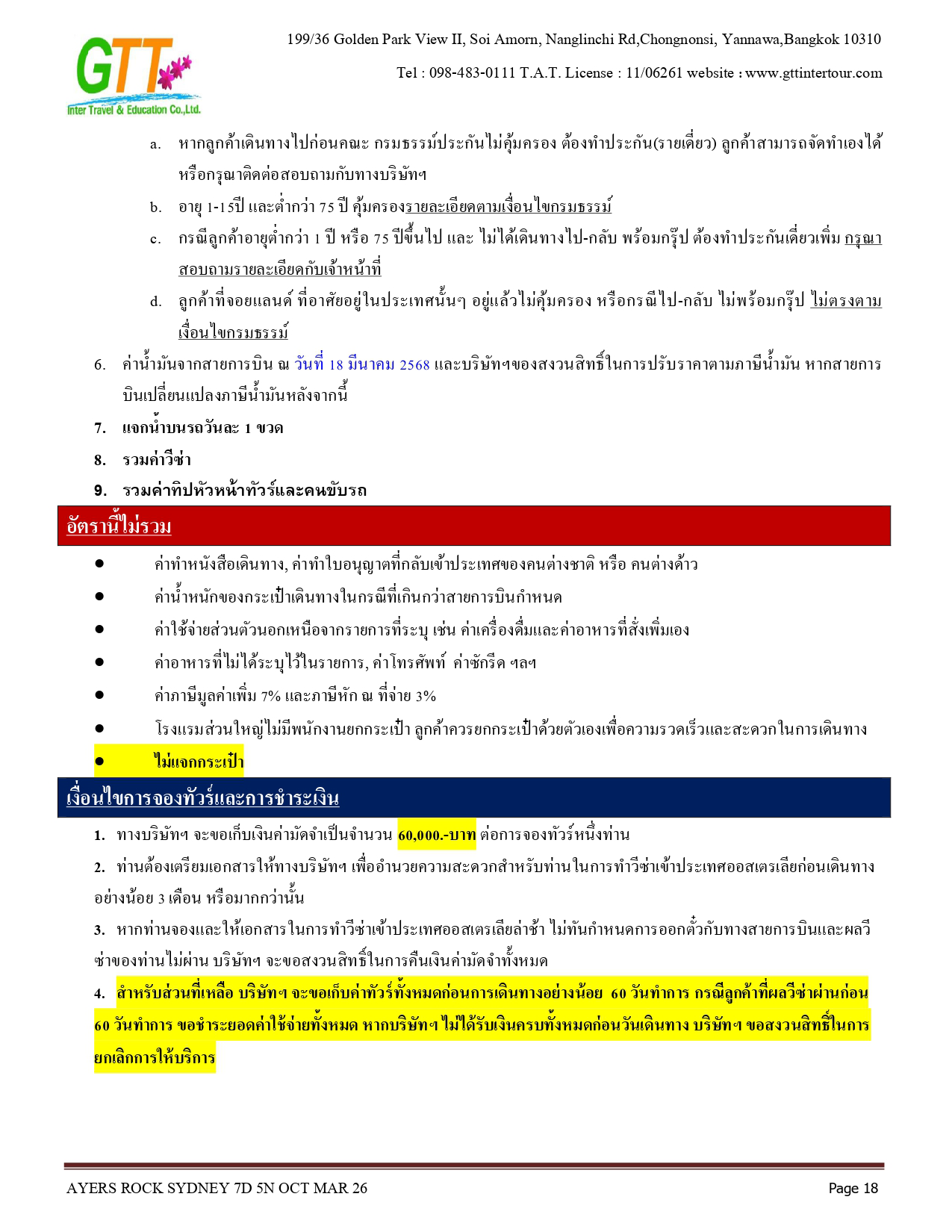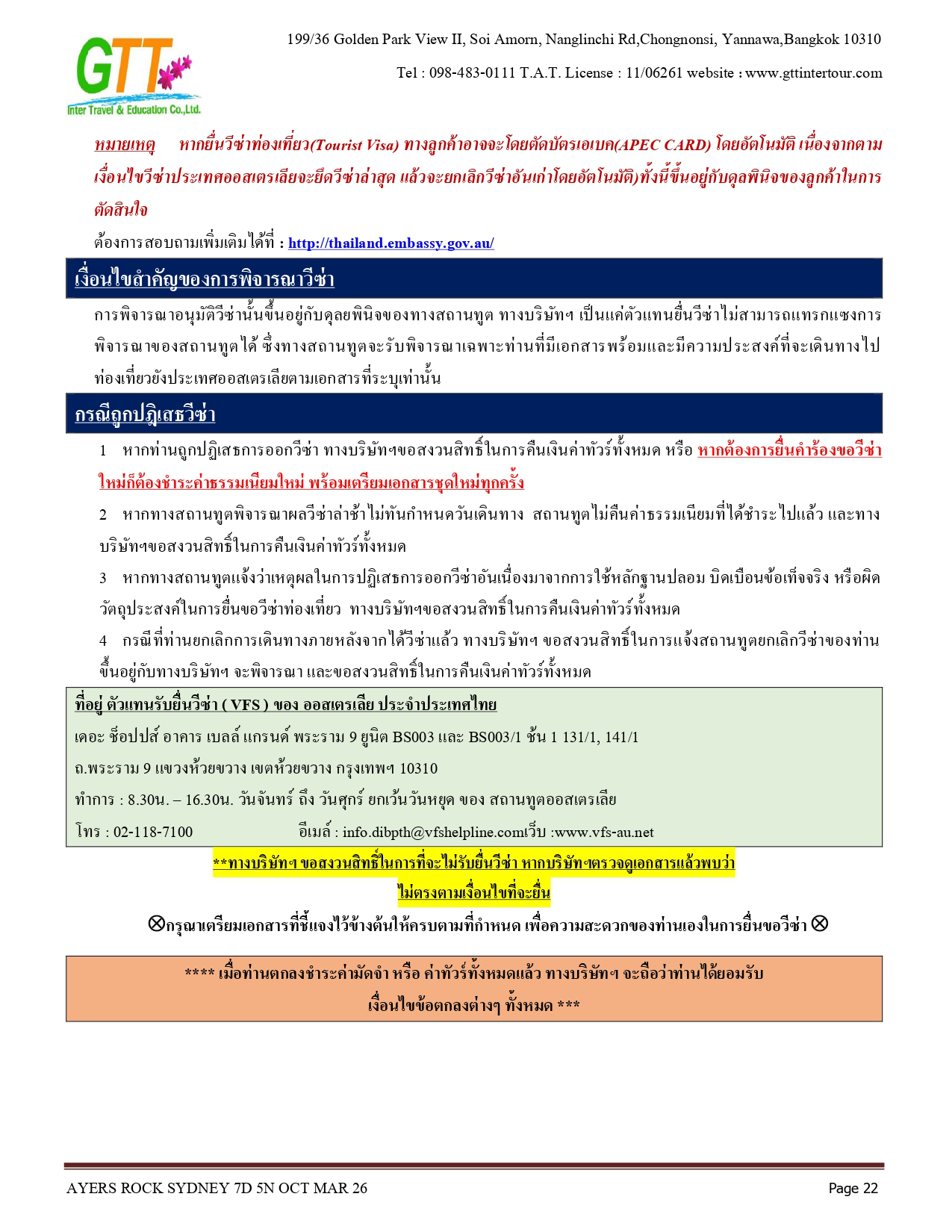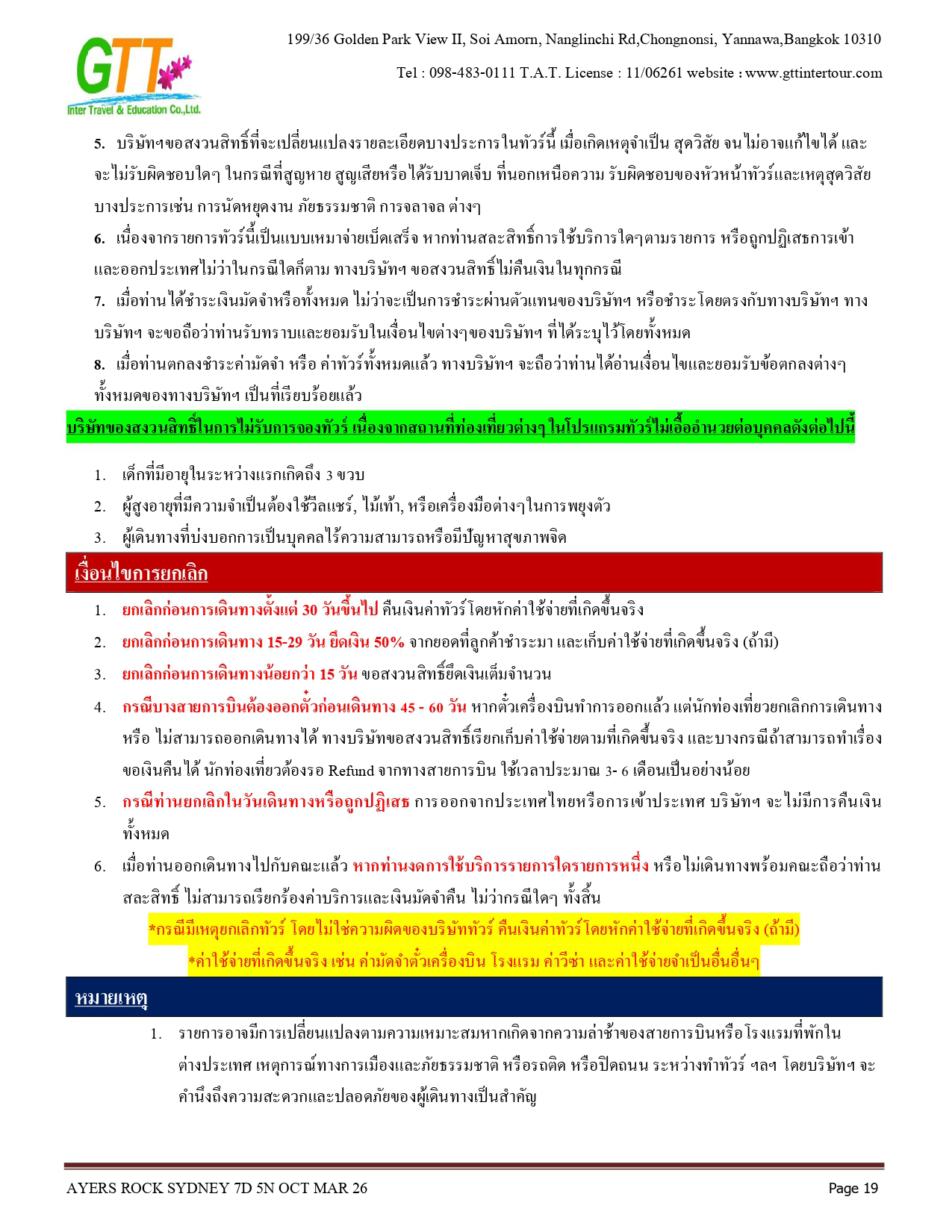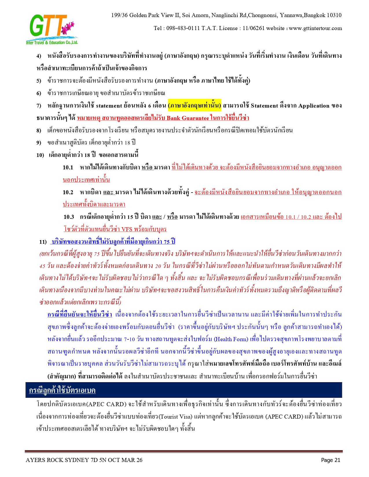 ซิดนีย์ - ชมเมือง - หาดบอนได - ม้าหินของมิสซิสแม็คควอรี่ - ล่องเรือชมอ่าวซิดนีย์ - ย่านเดอะร๊อคส์ - อุทยานแห่งชาติอูรูลู คาตา ทูตา - ศูนย์วัฒนธรรม - แอ่งน้ำมุติจูลู - ชมพระอาทิตย์ตกดิน - คาตาจูตา - ดิดเจอรี่ดูเวิร์คช็อป - นั่งเฮลิคอปเตอร์ชมเอเยอร์สร๊อค - อุทยานแห่งชาติบลูเมาท์เท่นส์ - Scenic World - หุบเขาสามอนงค์ - สวนสัตว์พื้นเมือง - อิสระช้อปปิ้ง - ซิดนีย์ทาวน์เวอร์พร้อมอาหารบุฟเฟ่ต์นานาชาติ