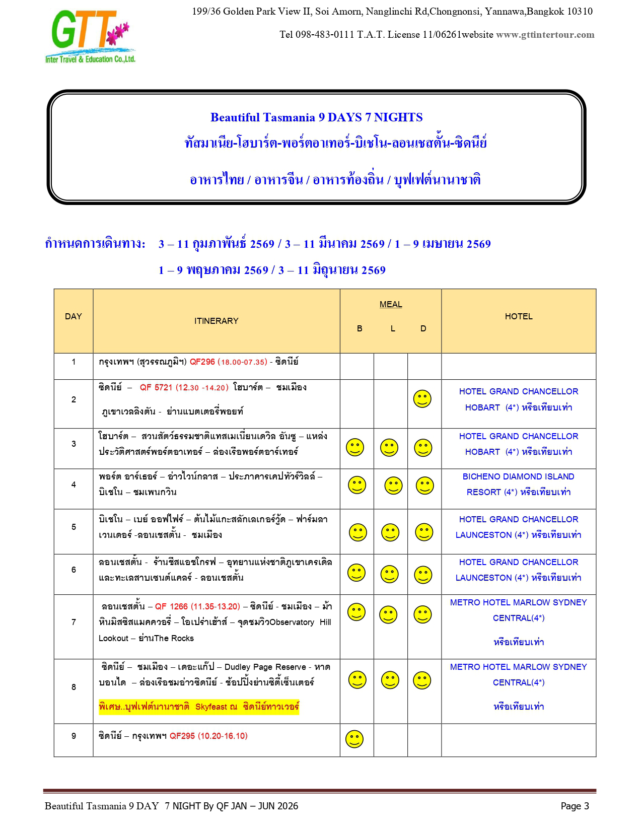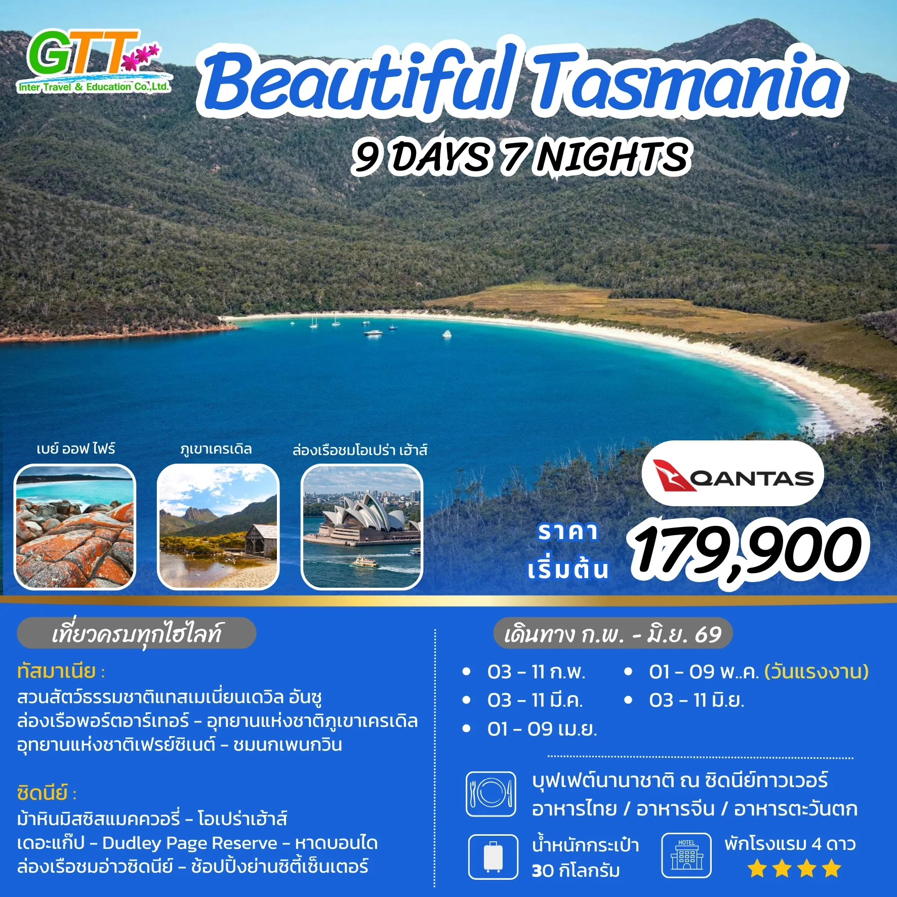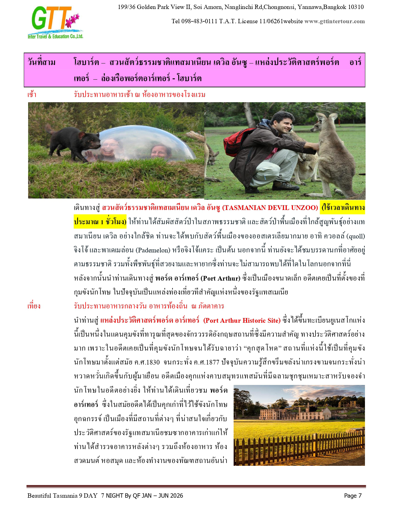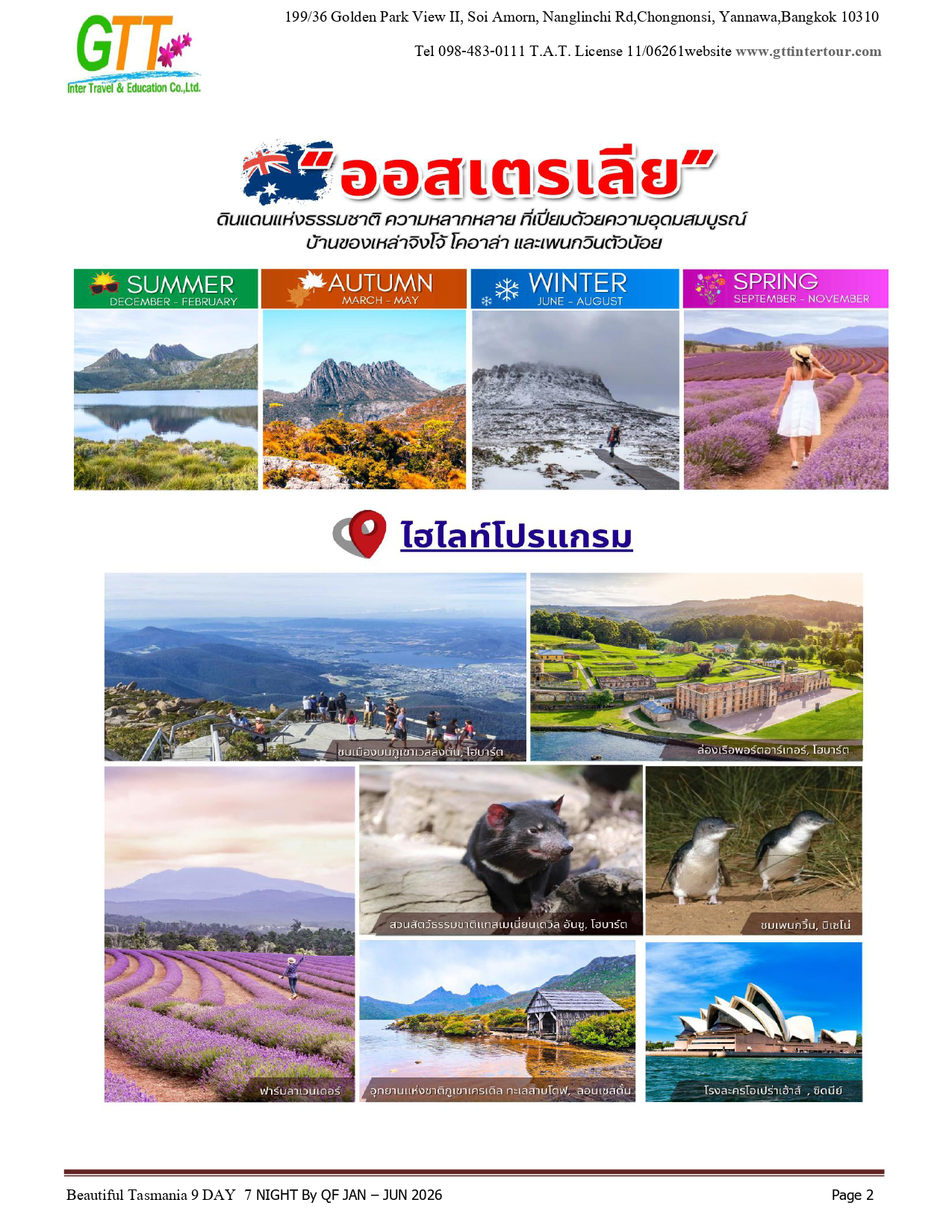 โฮบาร์ต - สวนสัตว์ธรรมชาติแทสเมเนี่ยนเดวิล - ล่องเรือพอร์ตอาร์เทอร์ - บิเชโน - อุทยานแห่งชาติเฟรย์ซิเนต์ - ลอนเชสตั้น - อุทยานแห่งชาติภูเขาเครเดิล - ซิดนีย์ - หาดบอนได - ล่องเรือชมอ่าวซิดนีย์