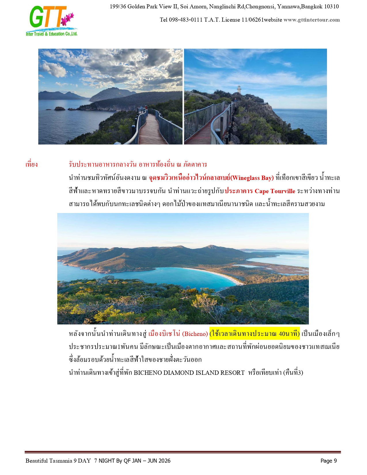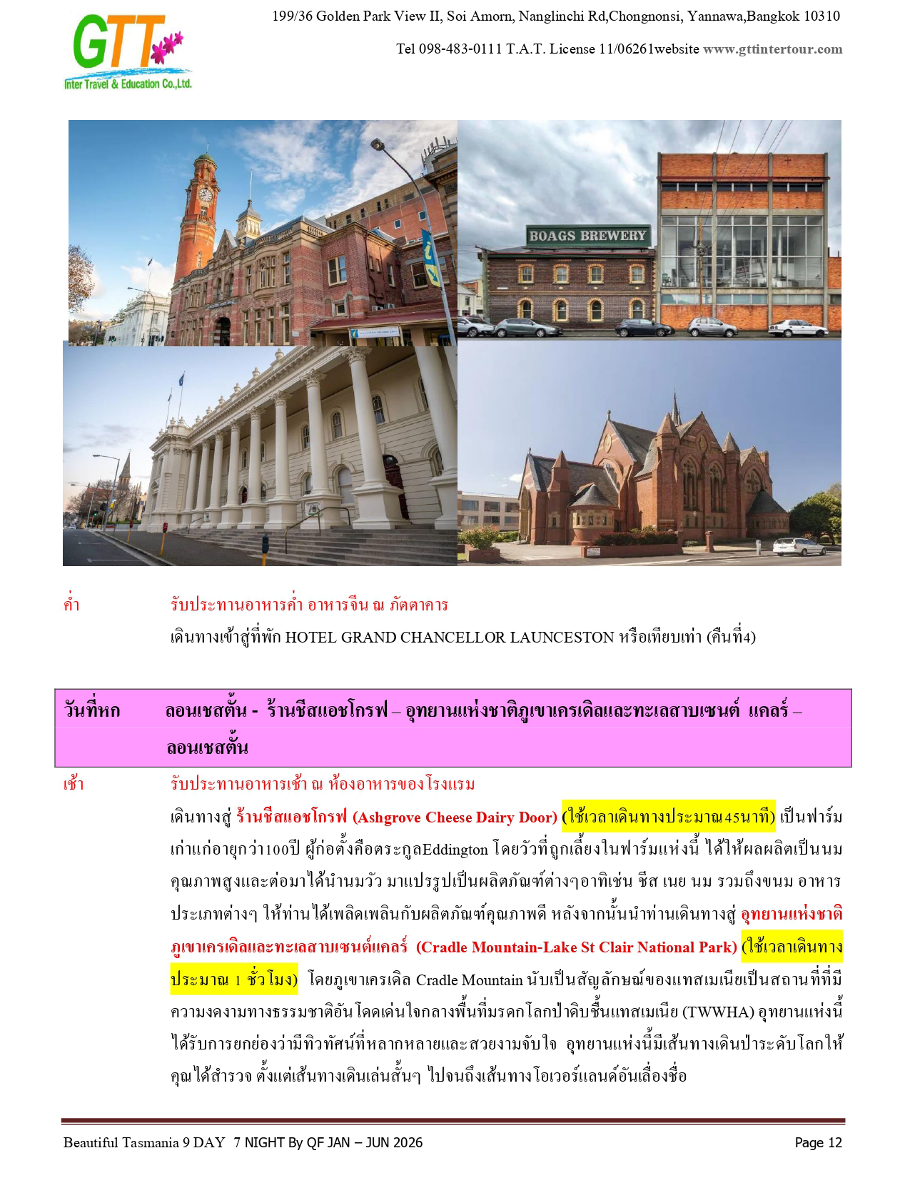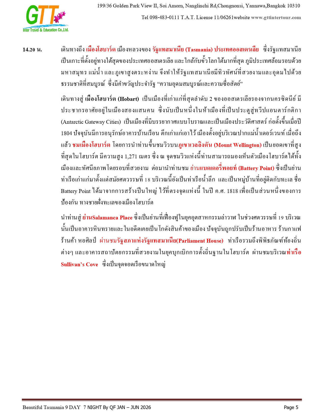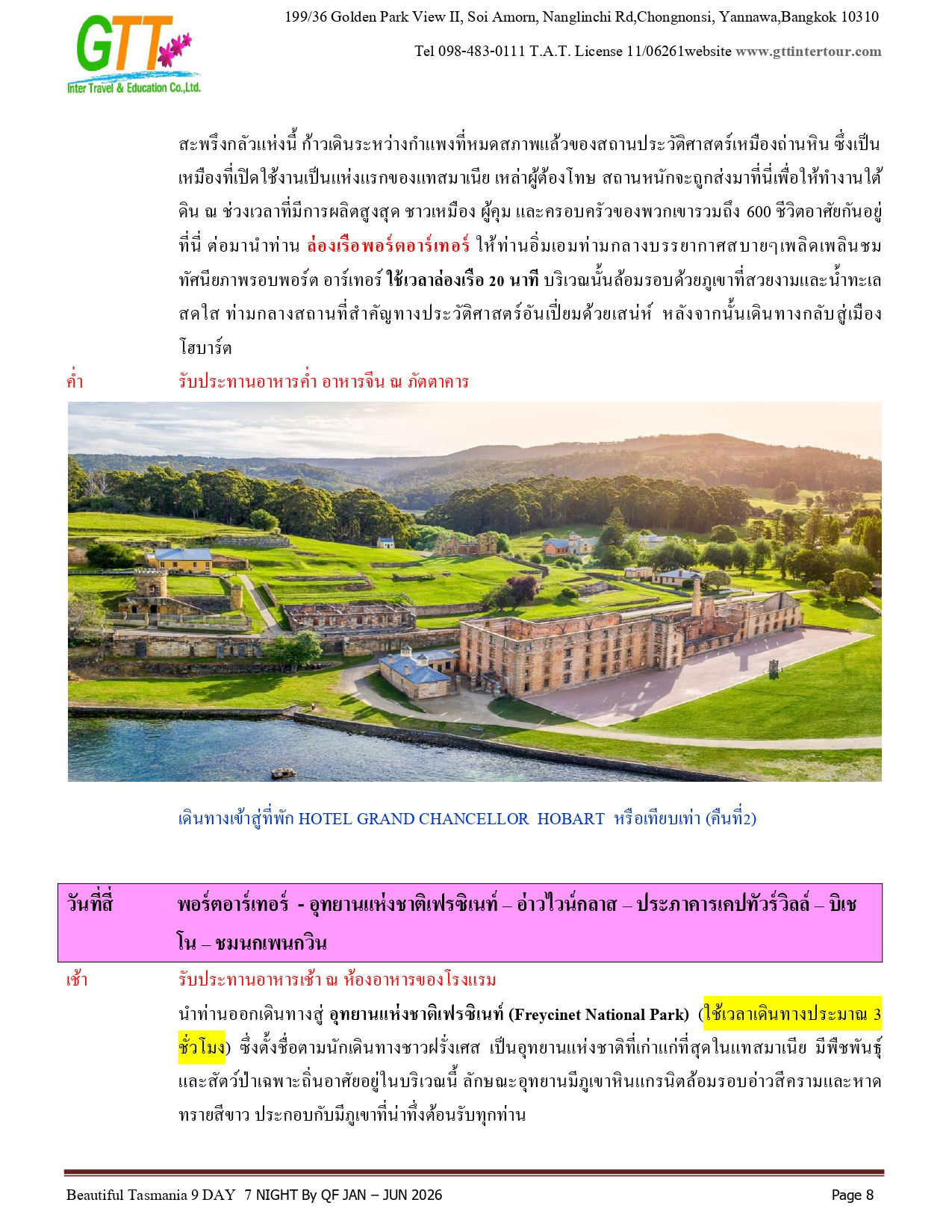 โฮบาร์ต - สวนสัตว์ธรรมชาติแทสเมเนี่ยนเดวิล - ล่องเรือพอร์ตอาร์เทอร์ - บิเชโน - อุทยานแห่งชาติเฟรย์ซิเนต์ - ลอนเชสตั้น - อุทยานแห่งชาติภูเขาเครเดิล - ซิดนีย์ - หาดบอนได - ล่องเรือชมอ่าวซิดนีย์