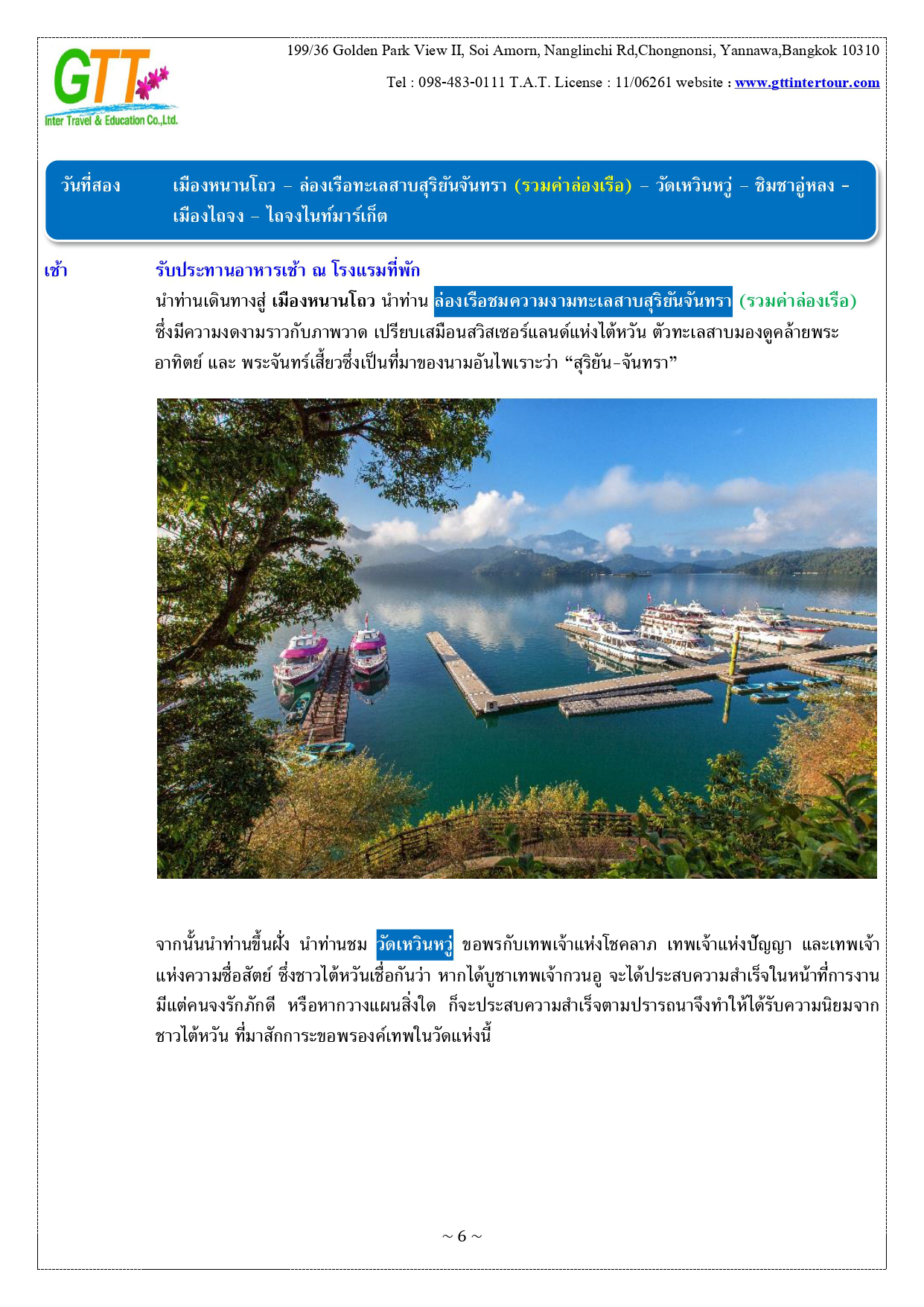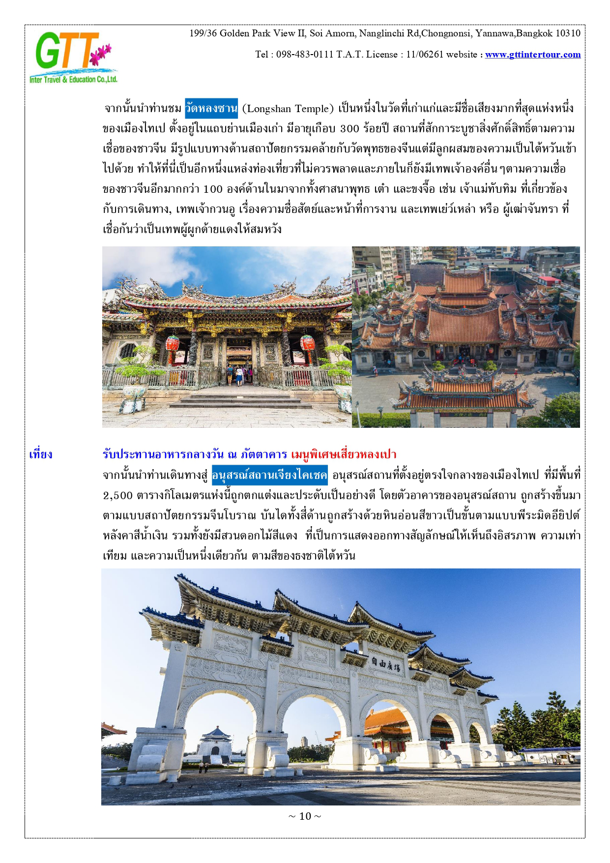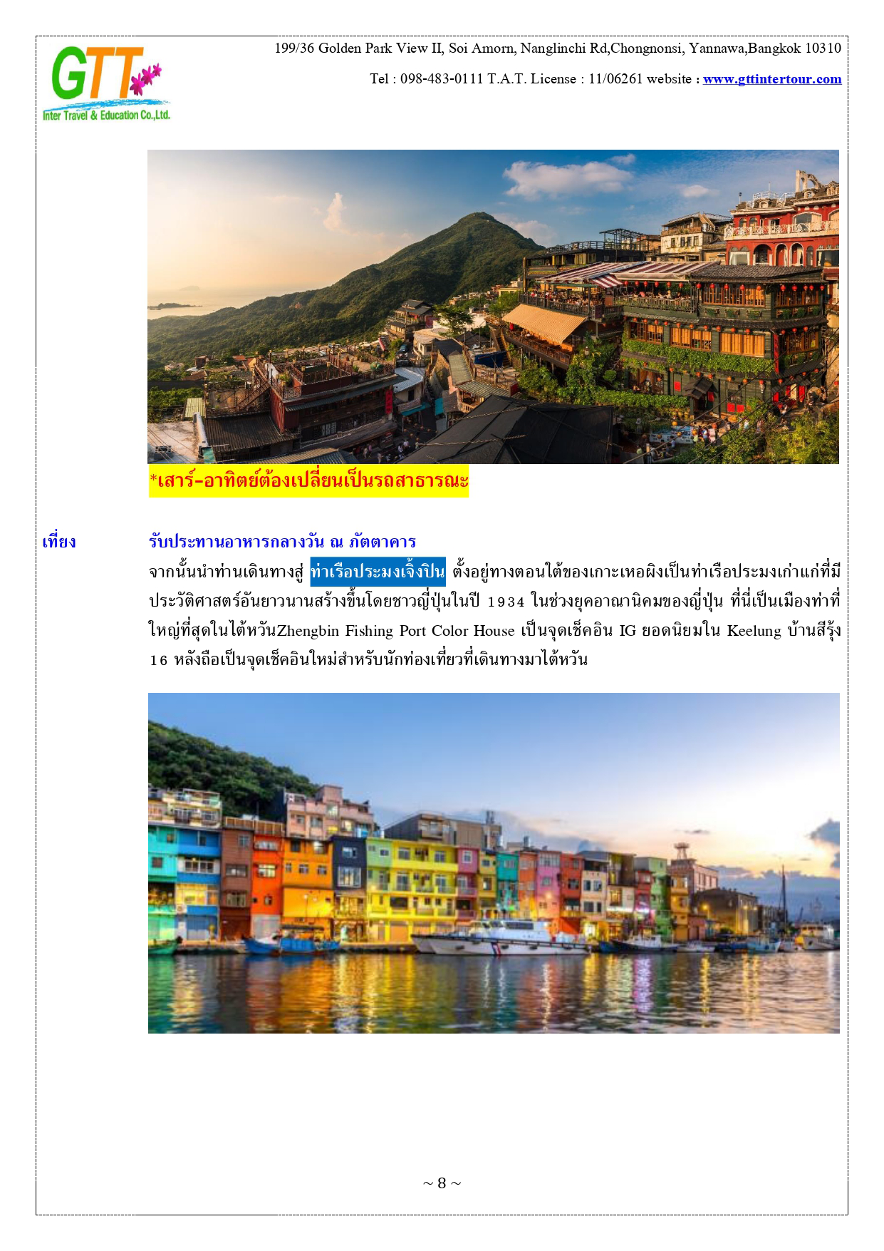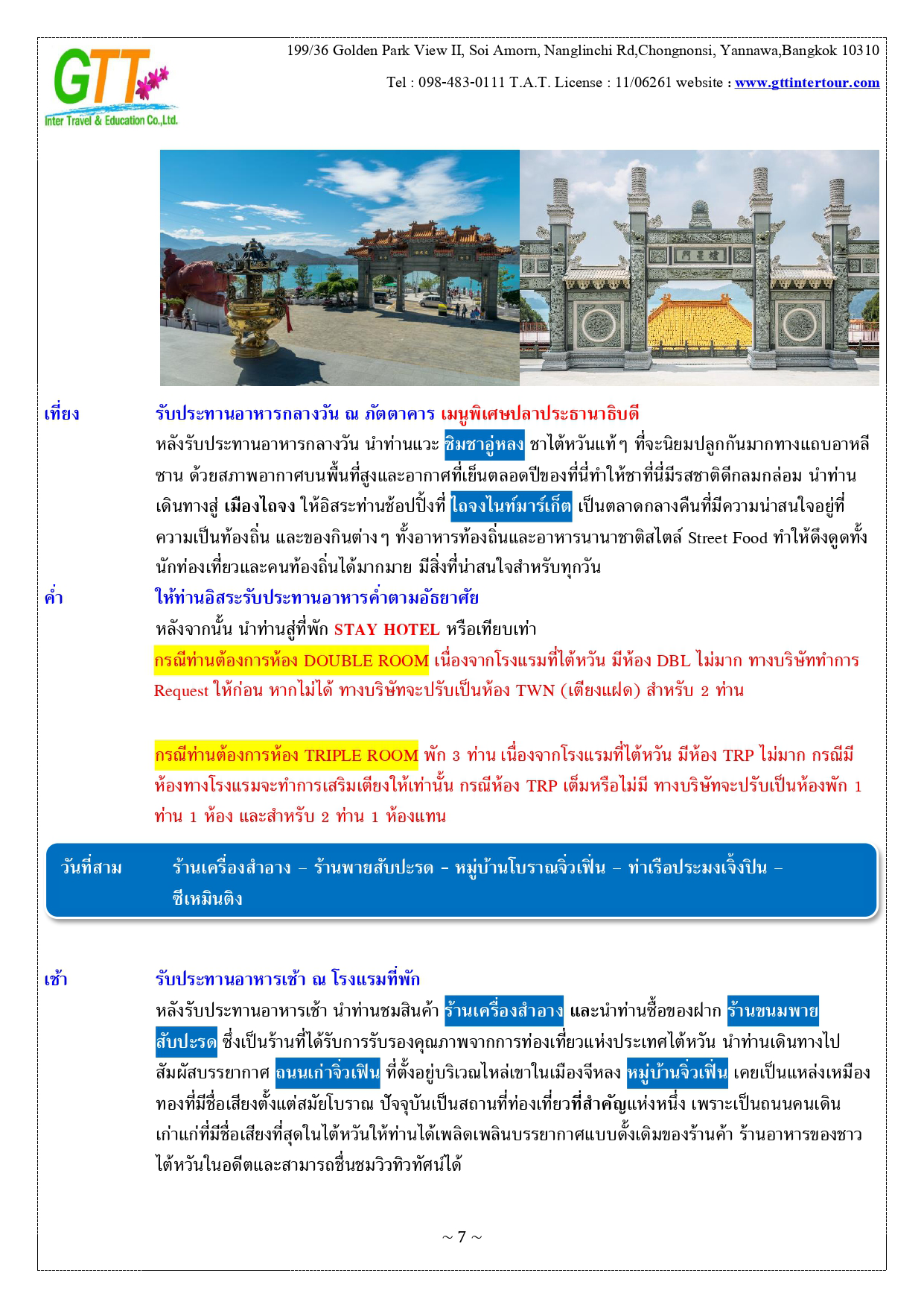 เมืองไทเป - หมู่บ้านทหารเก่าซื่อซื่อหนานซุน - ตึกไทเป101 – เถาหยวนไนท์มาร์เก็ต - เมืองหนานโถว – ล่องเรือทะเลสาบสุริยันจันทรา – วัดเหวินหวู่ – ชิมชาอู่หลง - ไถจงไนท์มาร์เก็ต - หมู่บ้านโบราณ จิ่วเฟิ่น - ท่าเรือประมงเจิ้งปิน - ซีเหมินติง - วัดหลงซาน - อนุสรณ์สถานเจียงไคเชค - เมืองฮวาเหลียน – ตลาดกลางคืนตงต้าเหมิน - สวนสนุกฟาร์กลอรี่โอเชี่ยนปาร์ค – หาดซีซิง