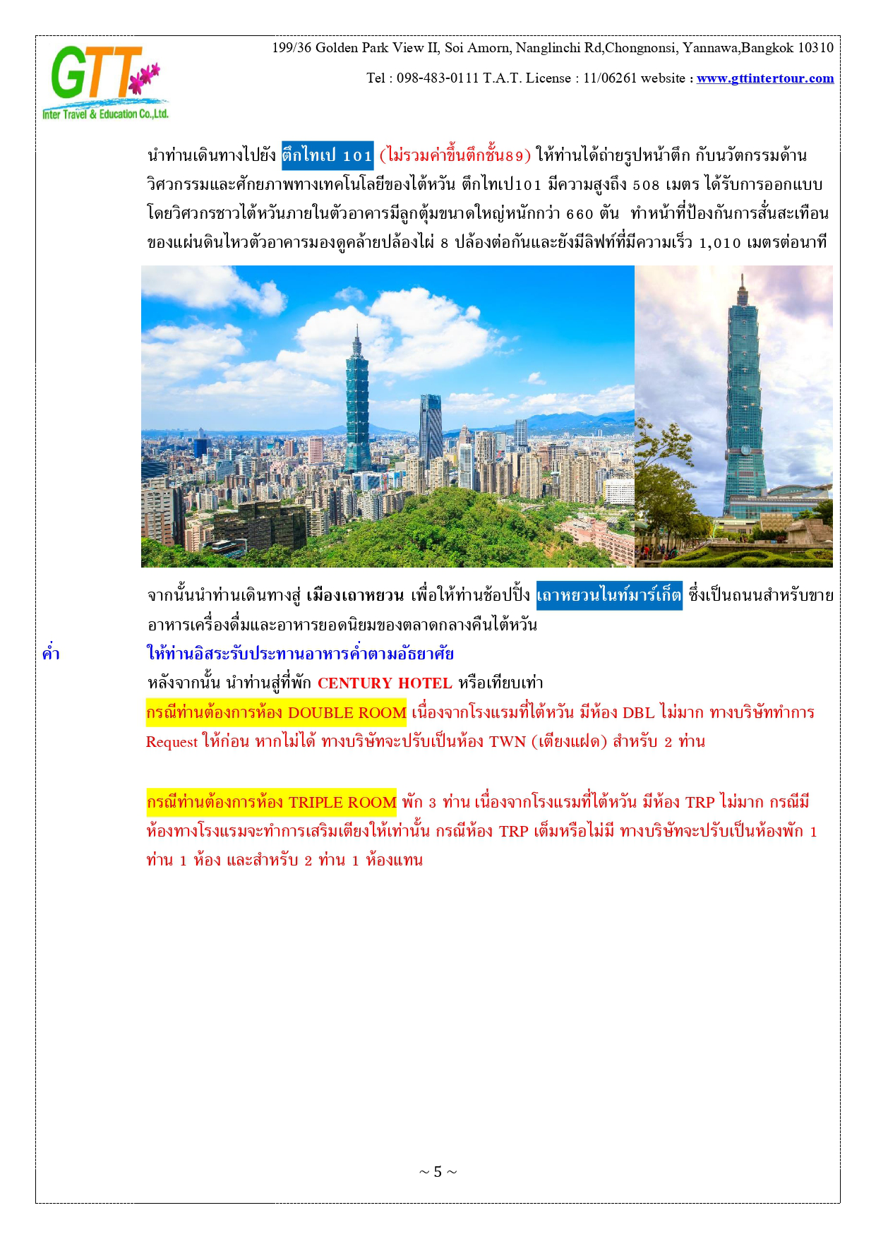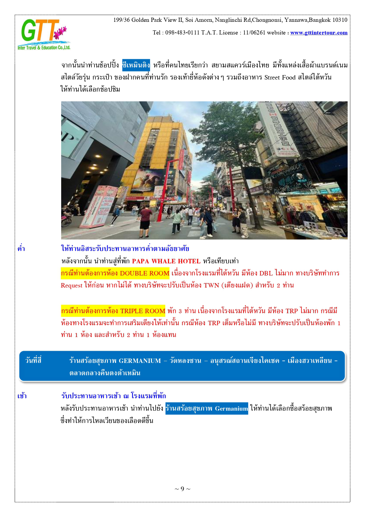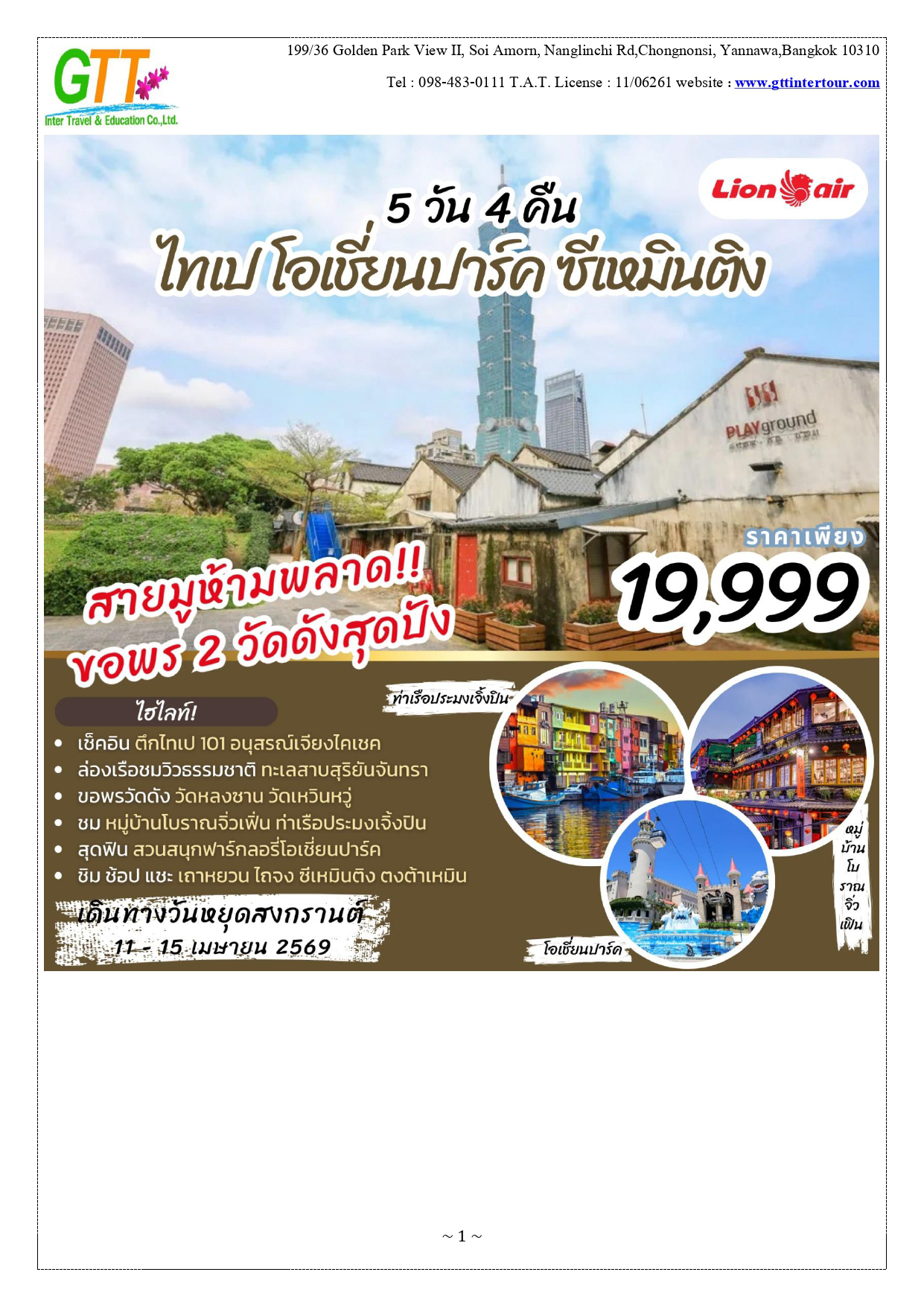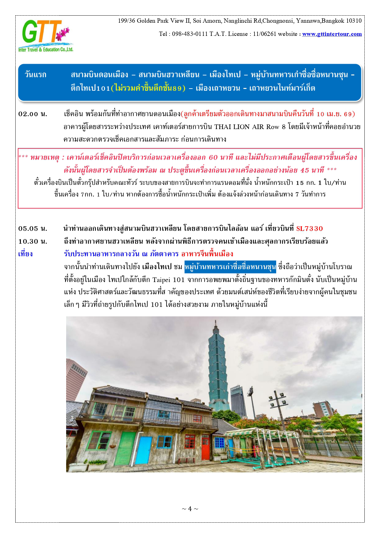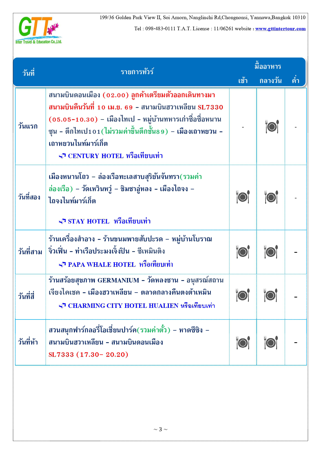 เมืองไทเป - หมู่บ้านทหารเก่าซื่อซื่อหนานซุน - ตึกไทเป101 – เถาหยวนไนท์มาร์เก็ต - เมืองหนานโถว – ล่องเรือทะเลสาบสุริยันจันทรา – วัดเหวินหวู่ – ชิมชาอู่หลง - ไถจงไนท์มาร์เก็ต - หมู่บ้านโบราณ จิ่วเฟิ่น - ท่าเรือประมงเจิ้งปิน - ซีเหมินติง - วัดหลงซาน - อนุสรณ์สถานเจียงไคเชค - เมืองฮวาเหลียน – ตลาดกลางคืนตงต้าเหมิน - สวนสนุกฟาร์กลอรี่โอเชี่ยนปาร์ค – หาดซีซิง