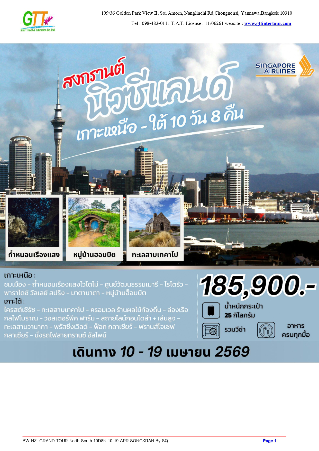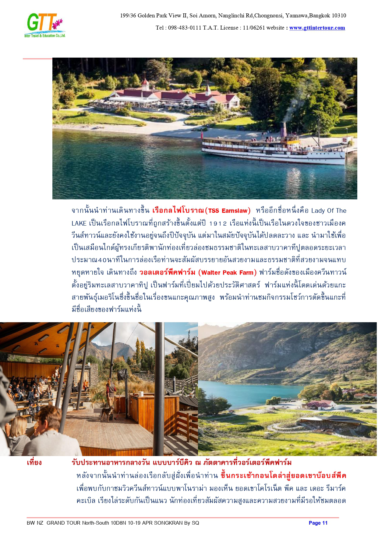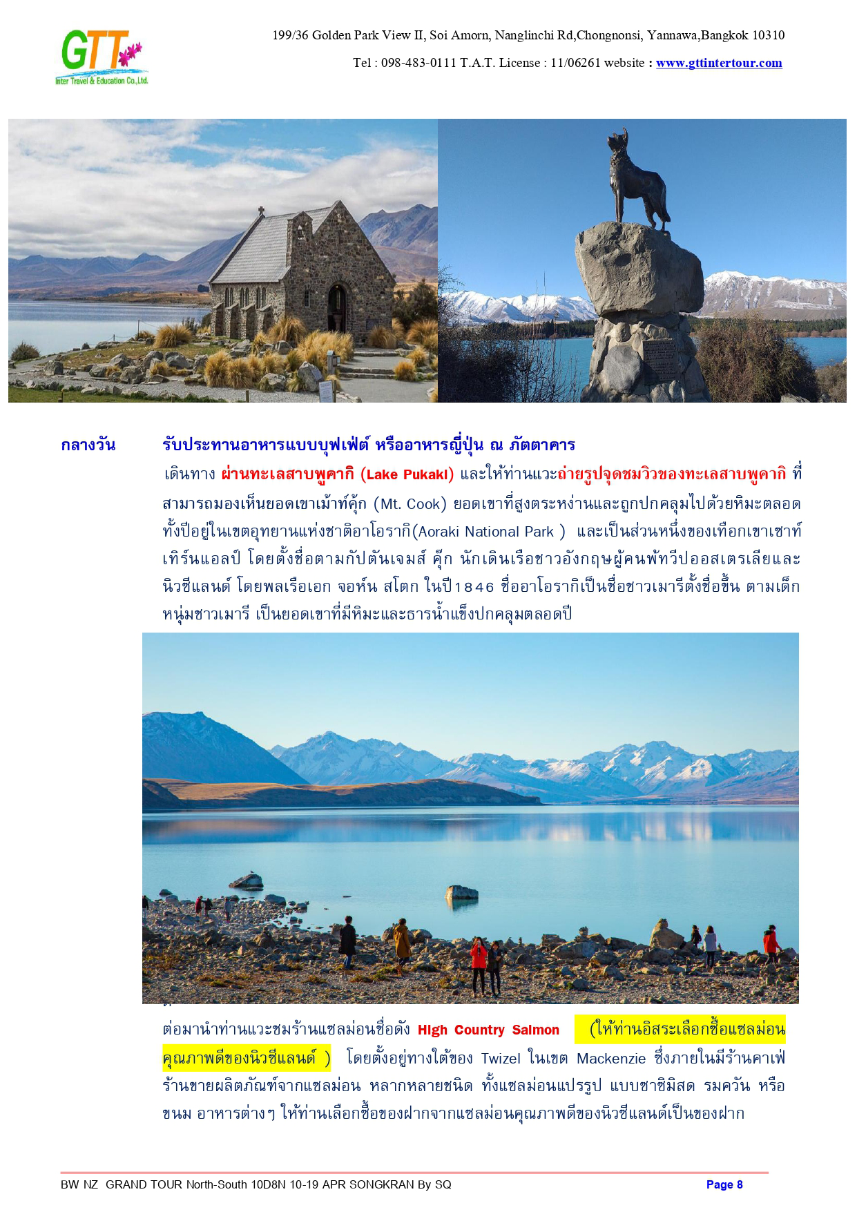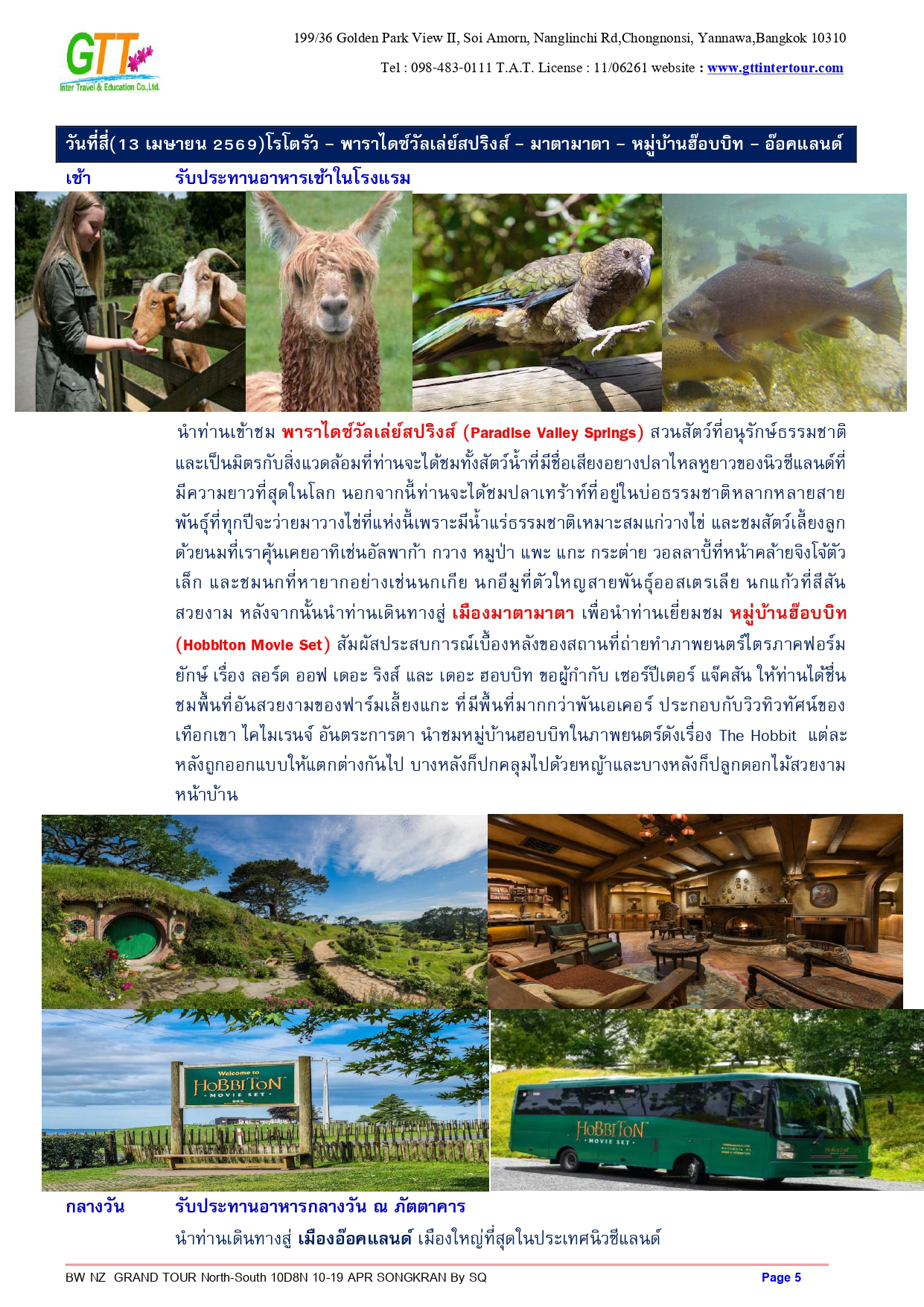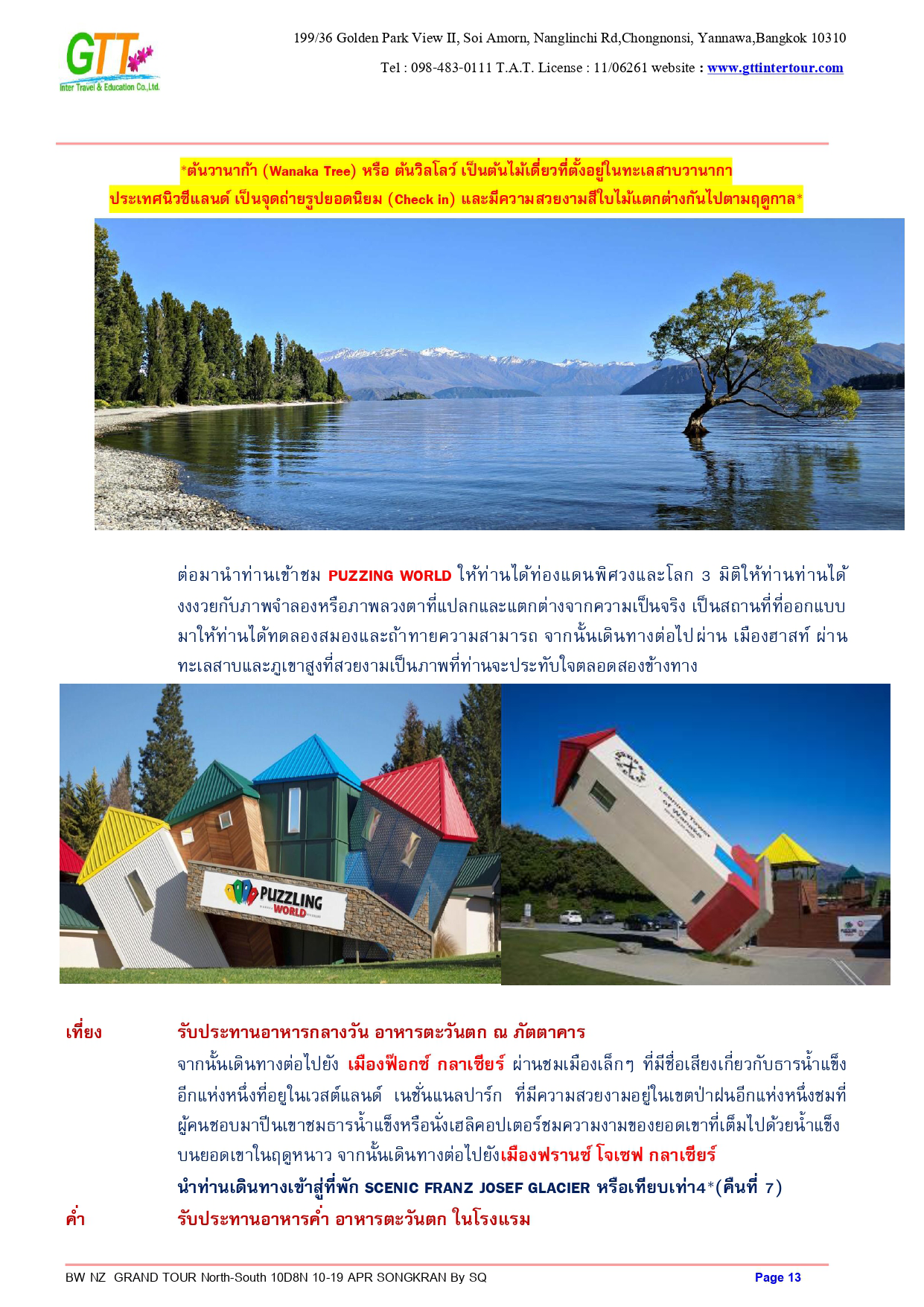 อ๊อคแลนด์ - ชมเมืองอ๊อคแลนด์ – ถ้ำหนอนเรืองแสงไวโตโม่ - ศูนย์วัฒนธรรมเมารี - โรโตรัว - พาราไดซ์ วัลเลย์ สปริง - มาตามาตา - หมู่บ้านฮอบบิต - ไคร้สท์เชิร์ช – ทะเลสาบเทคาโป – ทะเลสาบพูคากิ – ครอมเวล – ร้านผลไม้ท้องถิ่น - ควีนส์ทาวน์ – แอร์โรทาวน์ – ล่องเรือ Tss Earslaw cruise – วอลเตอร์พีค ฟาร์ม – สกายไลน์กอนโดล่า – เล่นลูจ – ทะเลสาบวานากา - Puzzling World – ฟ๊อคกลาร์เซีย – ฟรานส์โจเซฟกลาร์เซีย – นั่งรถไฟสายทรานซ์ อัลไฟน์