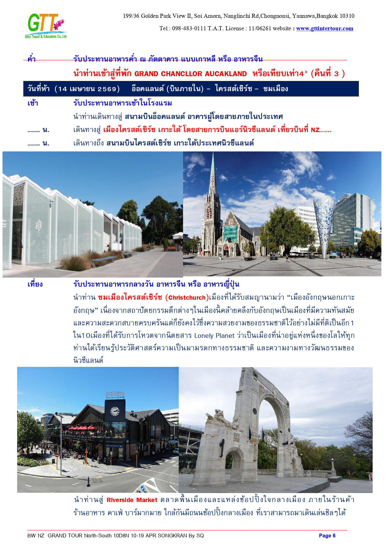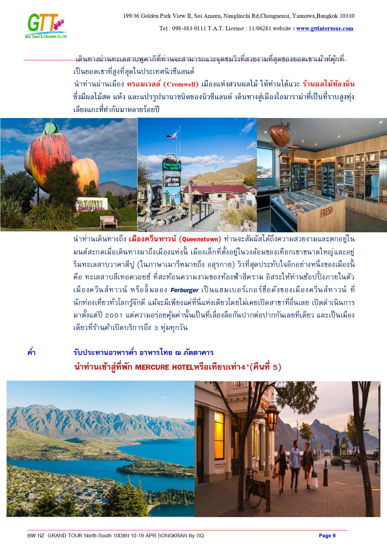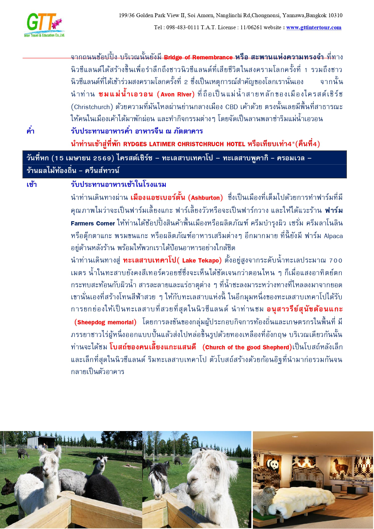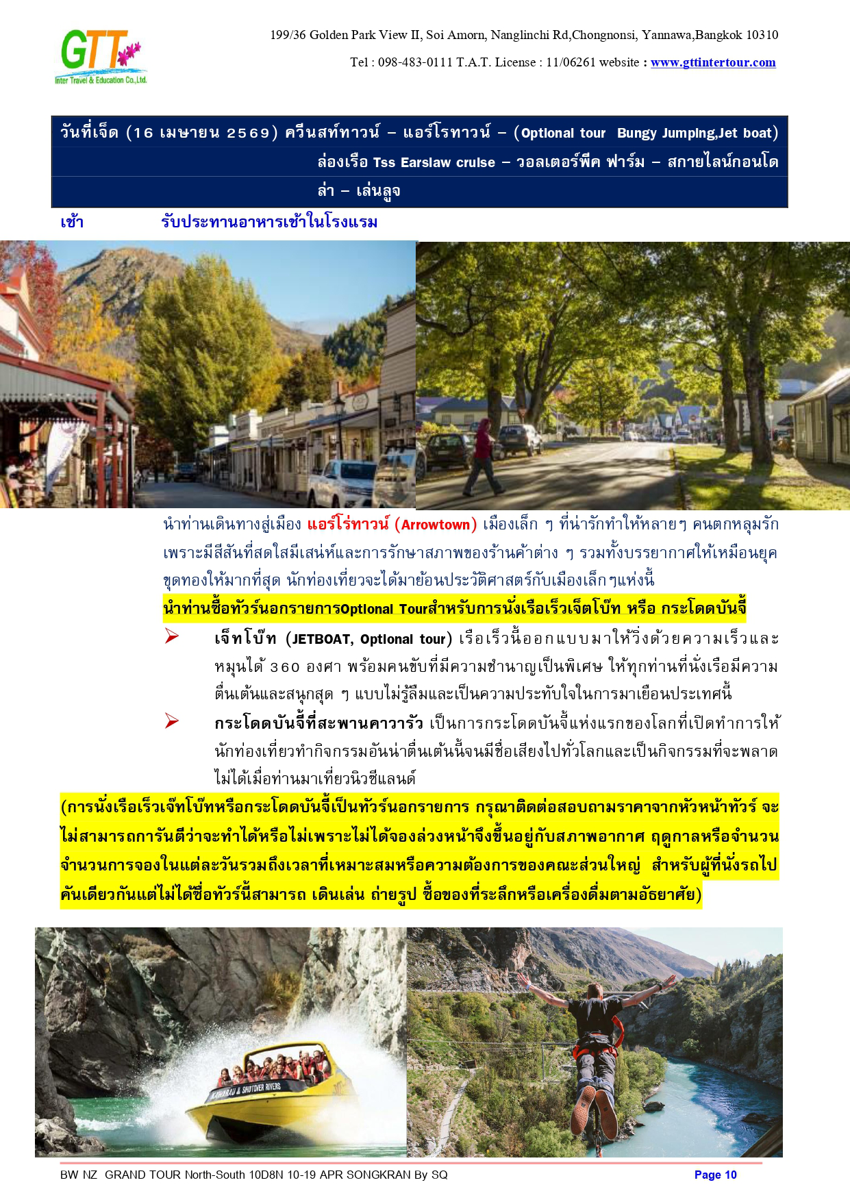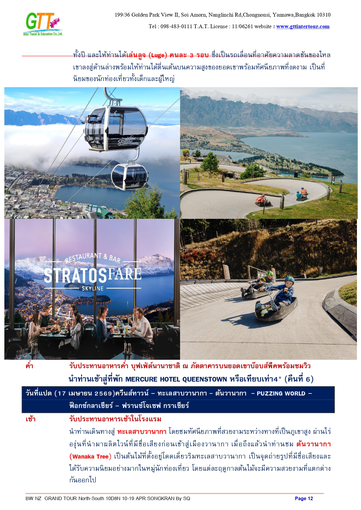 อ๊อคแลนด์ - ชมเมืองอ๊อคแลนด์ – ถ้ำหนอนเรืองแสงไวโตโม่ - ศูนย์วัฒนธรรมเมารี - โรโตรัว - พาราไดซ์ วัลเลย์ สปริง - มาตามาตา - หมู่บ้านฮอบบิต - ไคร้สท์เชิร์ช – ทะเลสาบเทคาโป – ทะเลสาบพูคากิ – ครอมเวล – ร้านผลไม้ท้องถิ่น - ควีนส์ทาวน์ – แอร์โรทาวน์ – ล่องเรือ Tss Earslaw cruise – วอลเตอร์พีค ฟาร์ม – สกายไลน์กอนโดล่า – เล่นลูจ – ทะเลสาบวานากา - Puzzling World – ฟ๊อคกลาร์เซีย – ฟรานส์โจเซฟกลาร์เซีย – นั่งรถไฟสายทรานซ์ อัลไฟน์