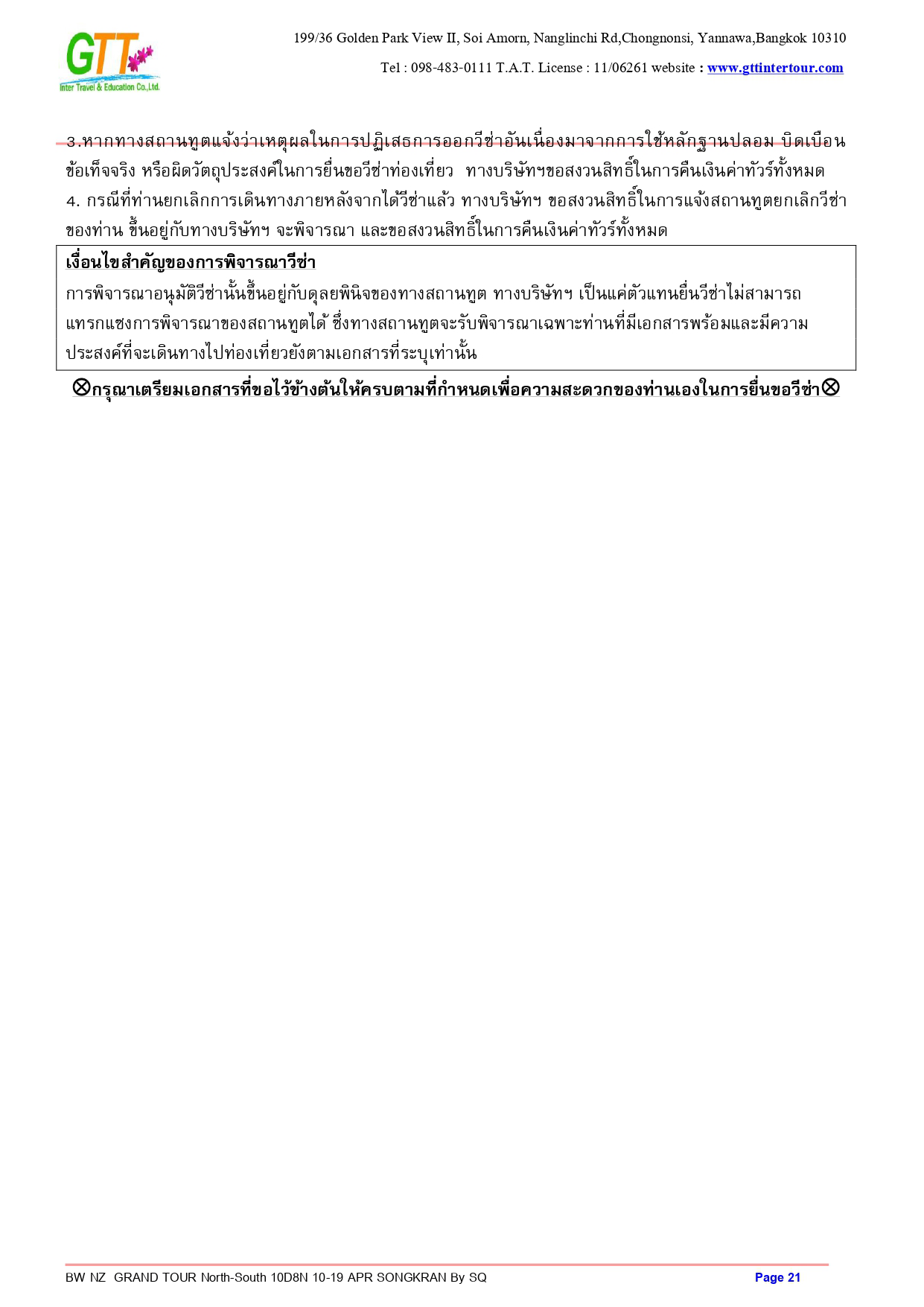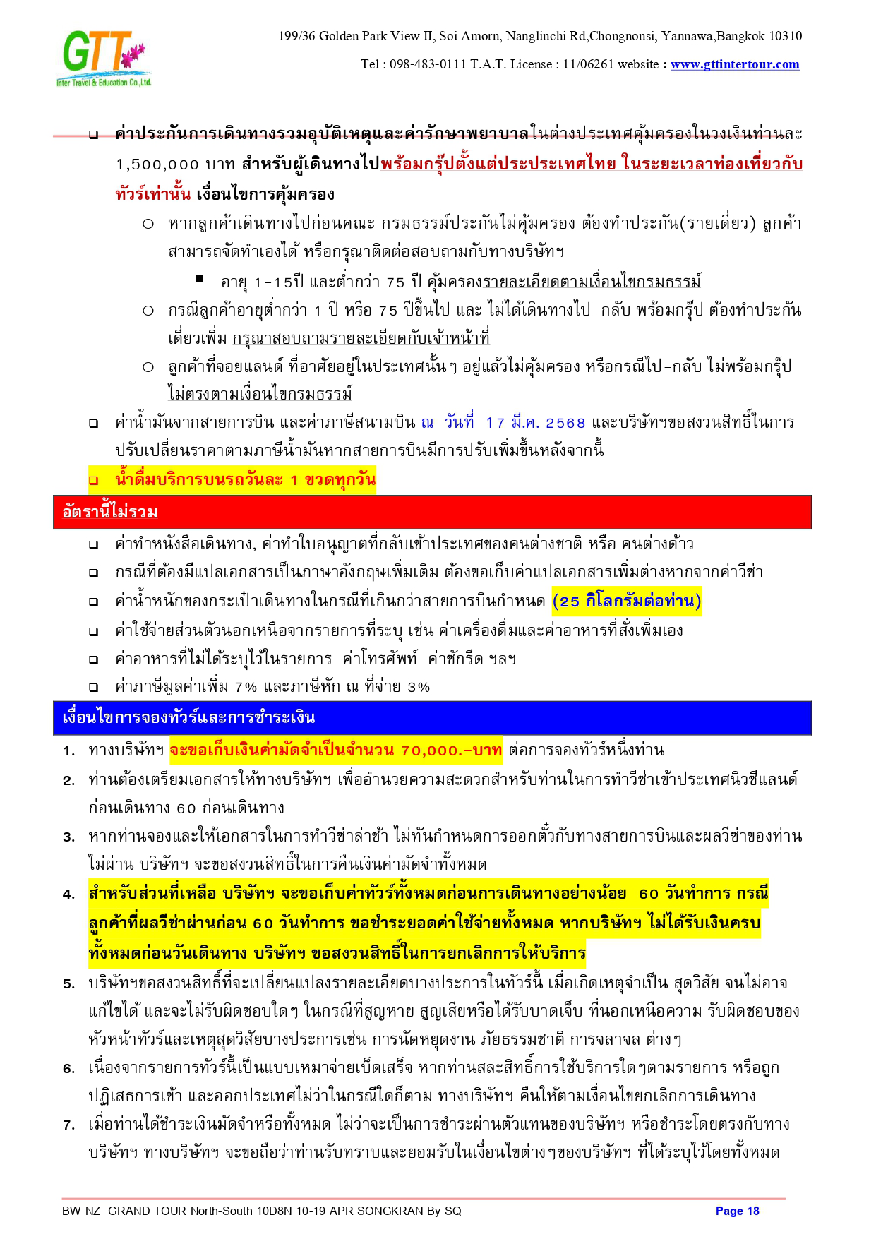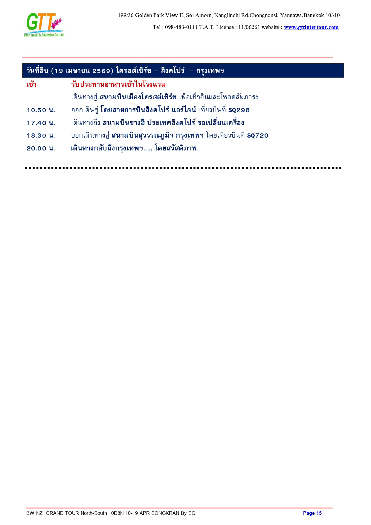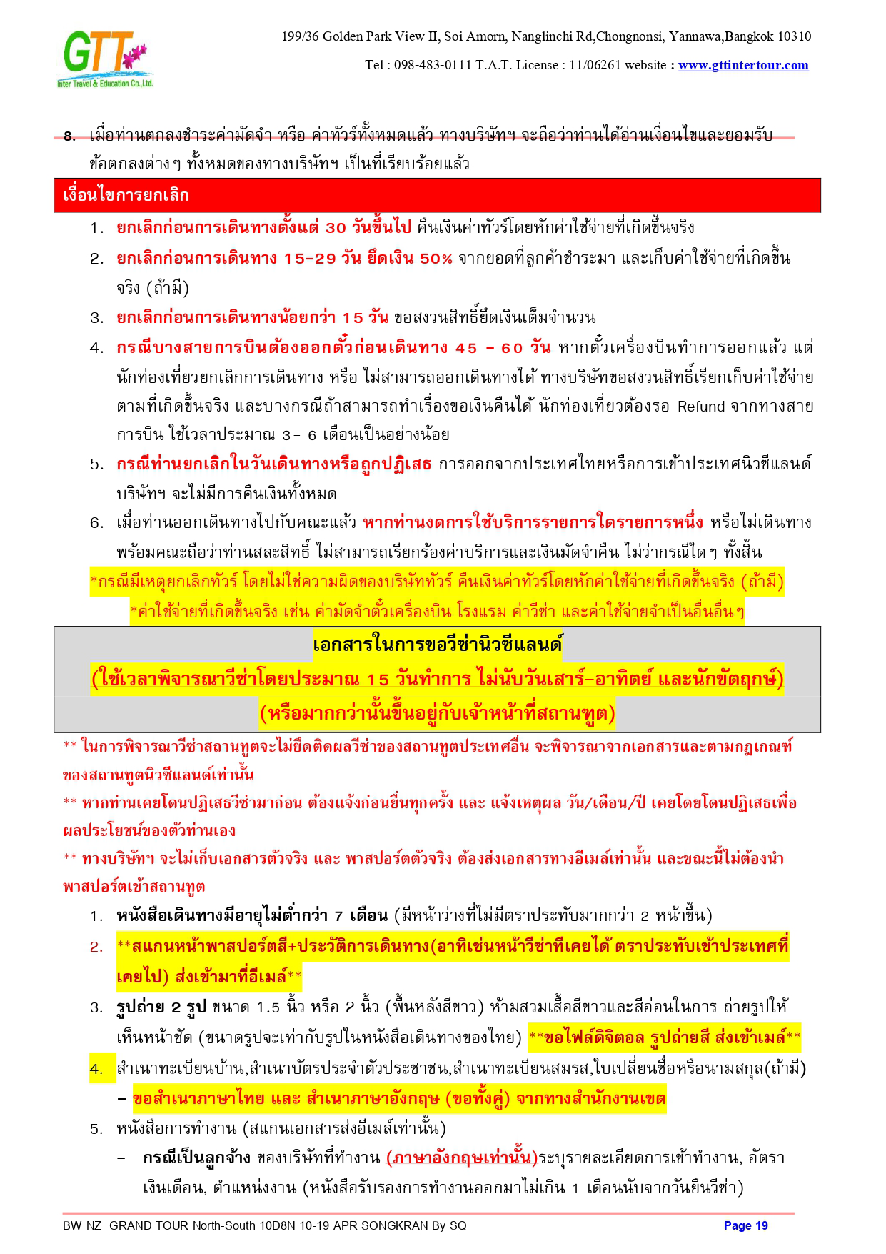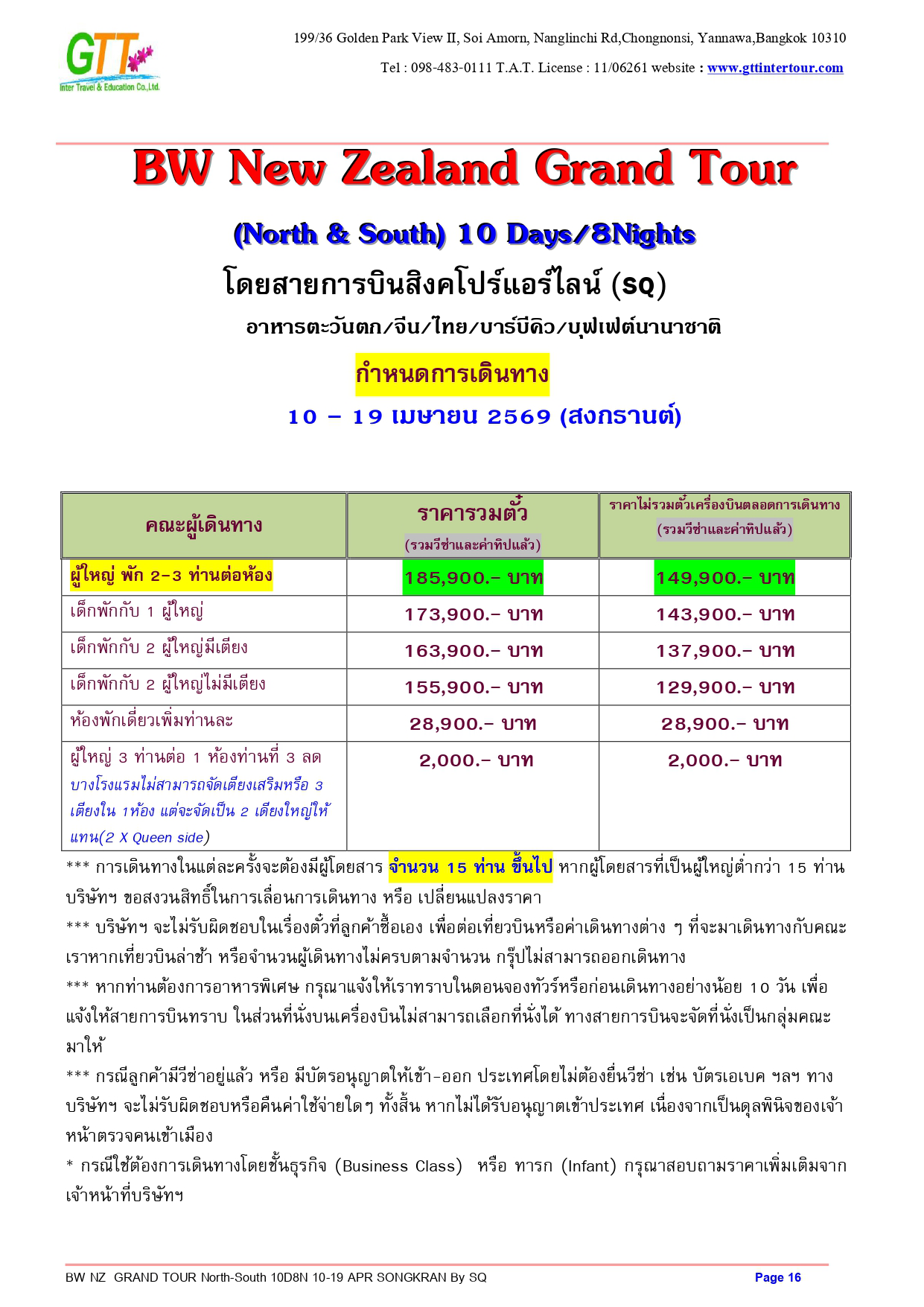 อ๊อคแลนด์ - ชมเมืองอ๊อคแลนด์ – ถ้ำหนอนเรืองแสงไวโตโม่ - ศูนย์วัฒนธรรมเมารี - โรโตรัว - พาราไดซ์ วัลเลย์ สปริง - มาตามาตา - หมู่บ้านฮอบบิต - ไคร้สท์เชิร์ช – ทะเลสาบเทคาโป – ทะเลสาบพูคากิ – ครอมเวล – ร้านผลไม้ท้องถิ่น - ควีนส์ทาวน์ – แอร์โรทาวน์ – ล่องเรือ Tss Earslaw cruise – วอลเตอร์พีค ฟาร์ม – สกายไลน์กอนโดล่า – เล่นลูจ – ทะเลสาบวานากา - Puzzling World – ฟ๊อคกลาร์เซีย – ฟรานส์โจเซฟกลาร์เซีย – นั่งรถไฟสายทรานซ์ อัลไฟน์