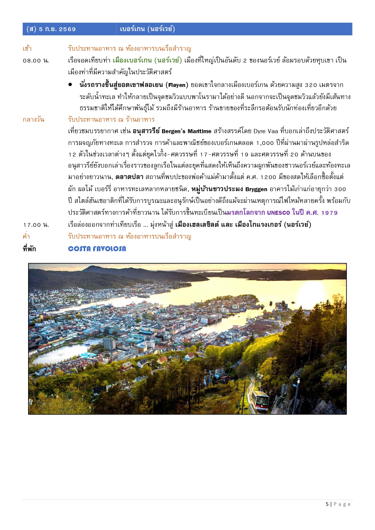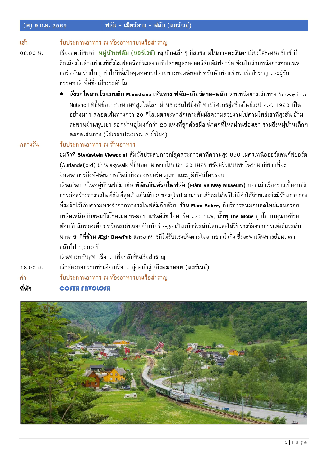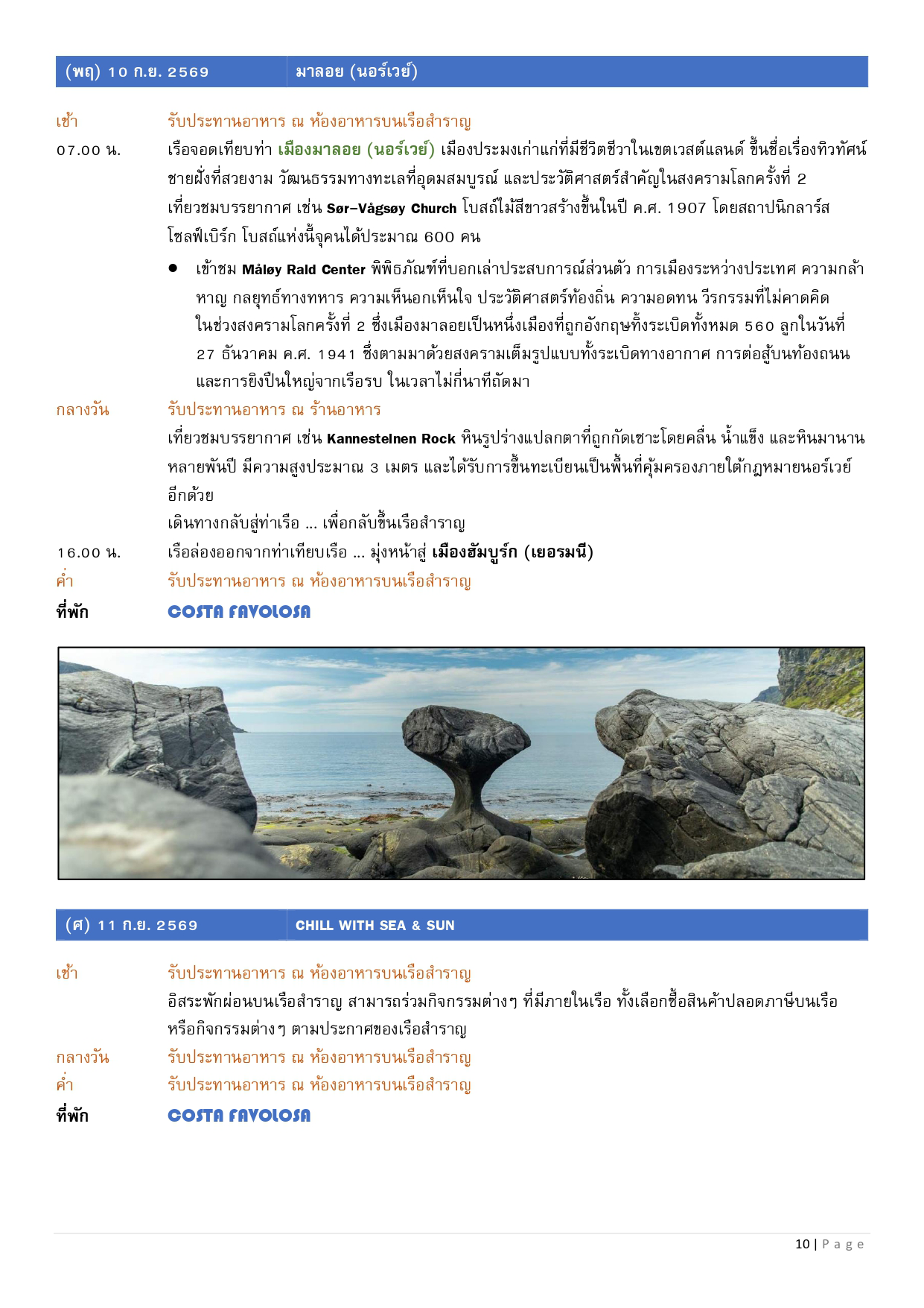 ฮัมบูร์ก - เบอร์เกน (นั่งรถรางขึ้นเขาฟลอเยน) - เฮลเลซิลต์ - ไกแรงเกอร์ - เอลซุนด์ นอร์ดฟยอร์ด - ธารน้ำแข็งบริกส์ดัลส์ - ฟลัม (นั่งรถไฟสายโรแมนติก) - เมียร์ดาล - มาลอย