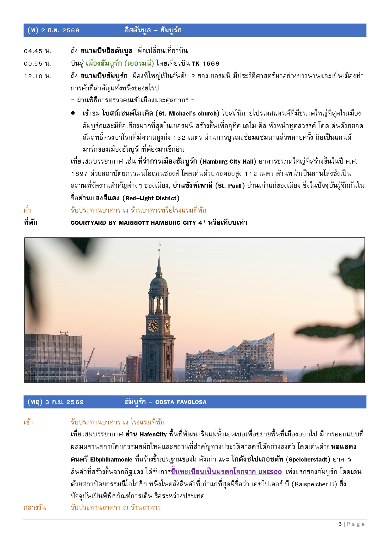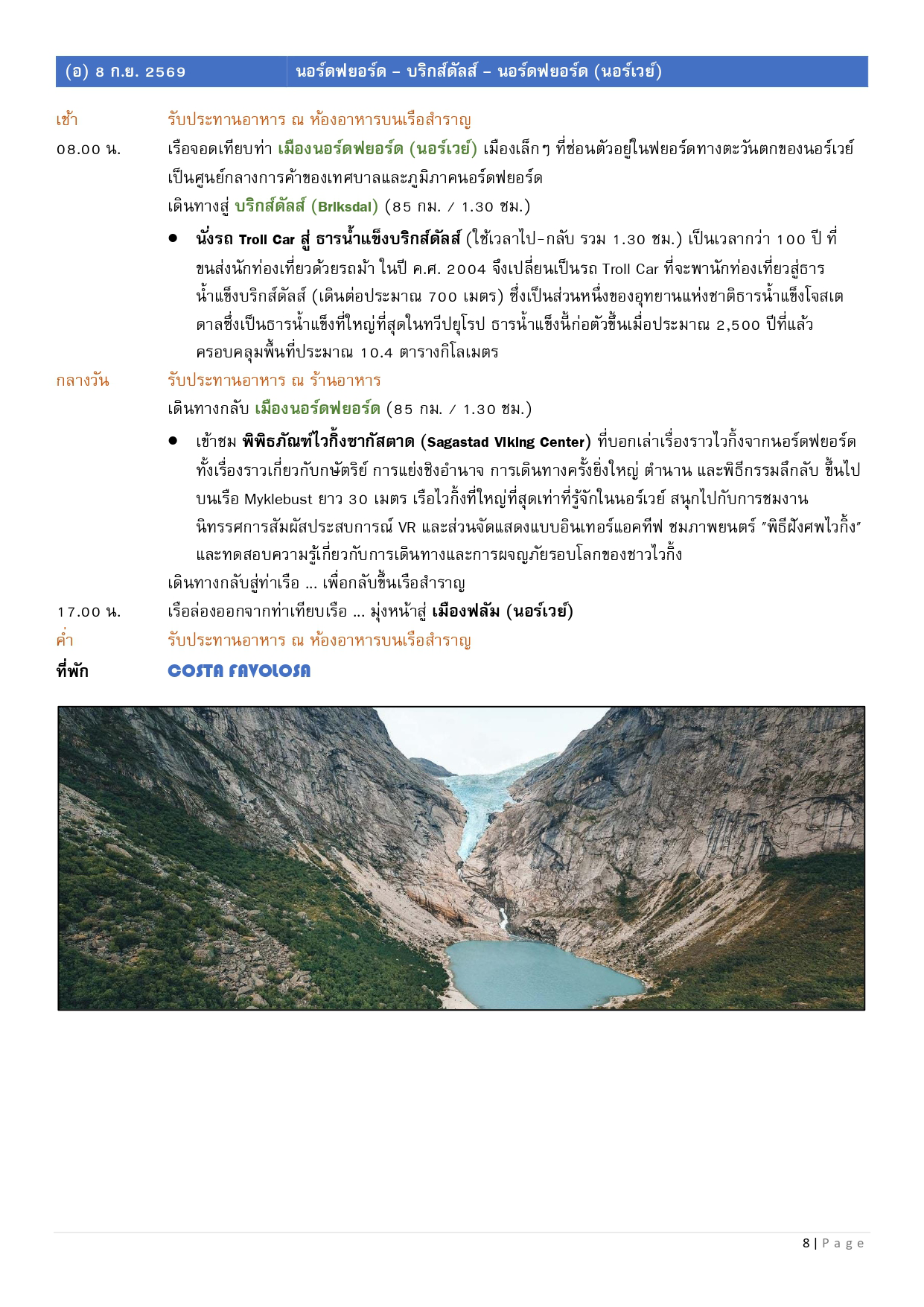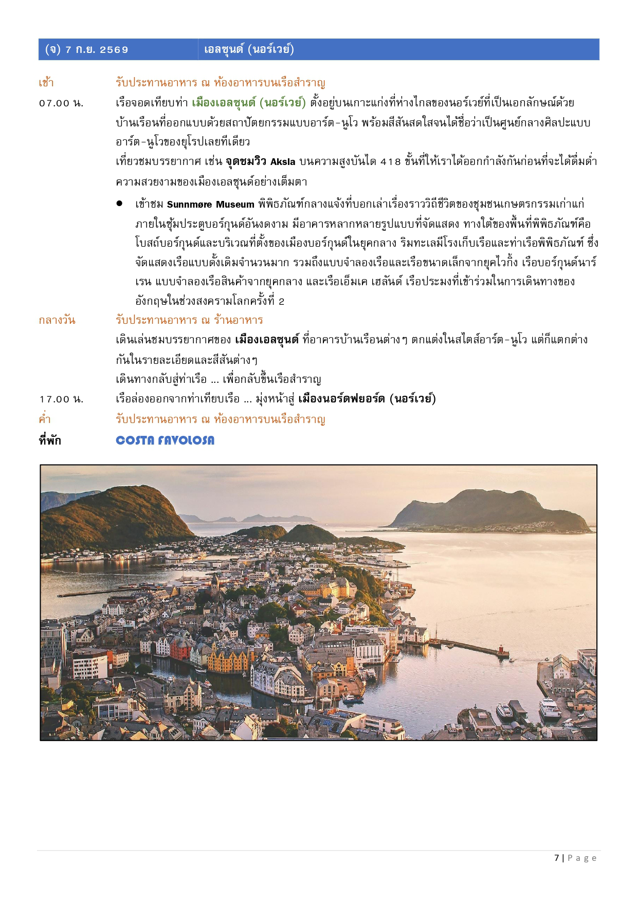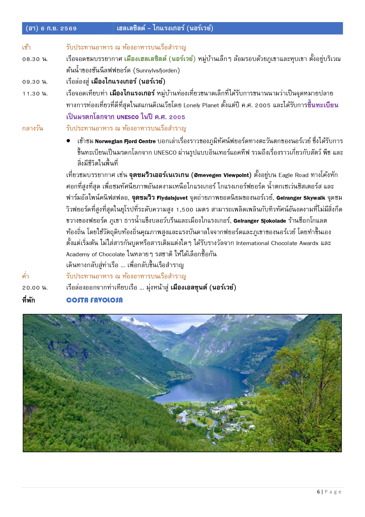 ฮัมบูร์ก - เบอร์เกน (นั่งรถรางขึ้นเขาฟลอเยน) - เฮลเลซิลต์ - ไกแรงเกอร์ - เอลซุนด์ นอร์ดฟยอร์ด - ธารน้ำแข็งบริกส์ดัลส์ - ฟลัม (นั่งรถไฟสายโรแมนติก) - เมียร์ดาล - มาลอย