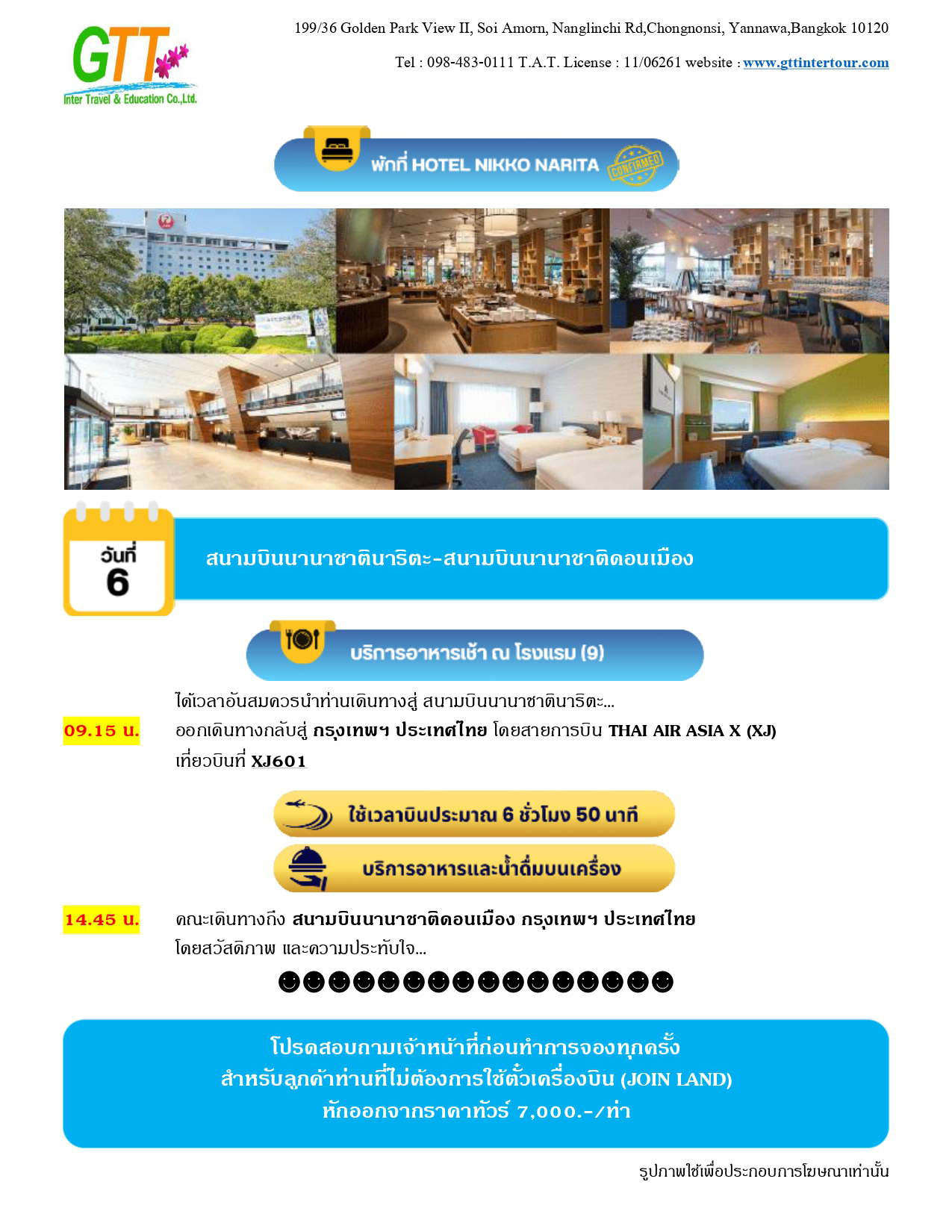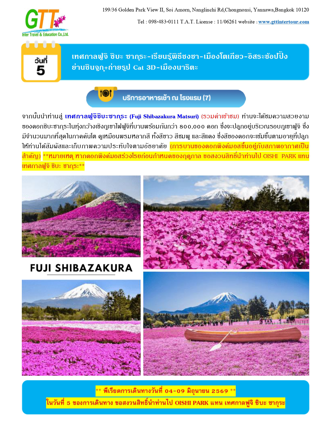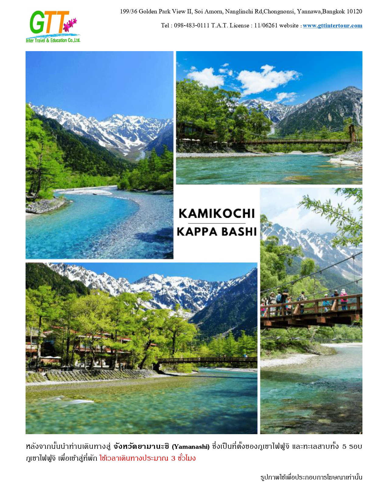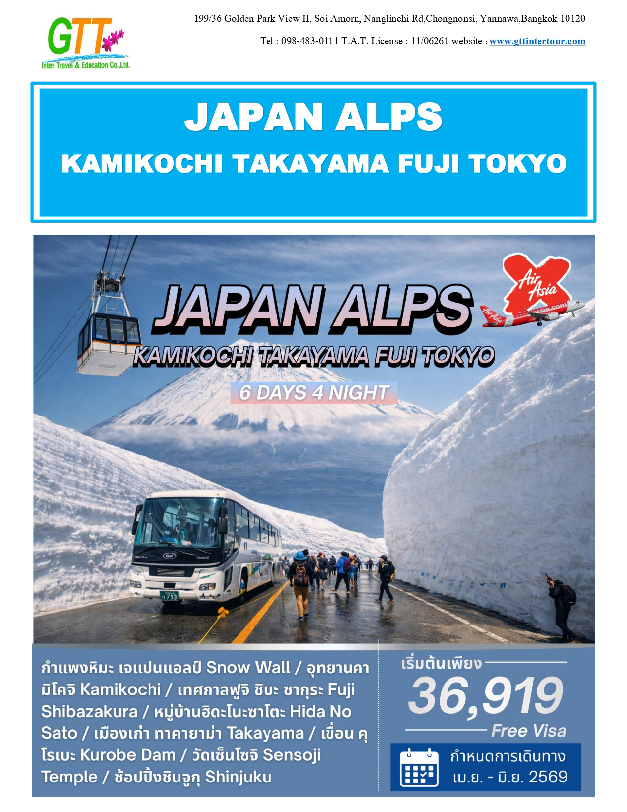 เมืองโตเกียว - วัดเซ็นโซจิ - ถนนนากามิเสะ - ถ่ายรูปหอคอยโตเกียวสกายทรี (ริมแม่น้ำสุมิดะ) - ย่านอูเอโนะ - ช้อปปิ้งตลาดอเมะโยโกะ - เมืองโอมาจิ - สถานีโอกิซาว่า - เขื่อนคุโรเบะ - ชมกำแพงหิมะแห่งเจแปน แอลป์ - สถานีทาเทยาม่า - เมืองทาคายาม่า - ตลาดเช้ามิยากาวะ - ถนนซันมาจิซูจิ - สะพานนาคาบาชิ - HIDA NO SATO - อุทยานแห่งชาติคามิโคจิ - สะพานกัปปะบาชิ - จังหวัดยามานะชิ - เทศกาลฟูจิ ชิบะ ซากุระ - เรียนรู้พิธีชงชา - เมืองโตเกียว - อิสระช้อปปิ้ง ย่านชินจูกุ