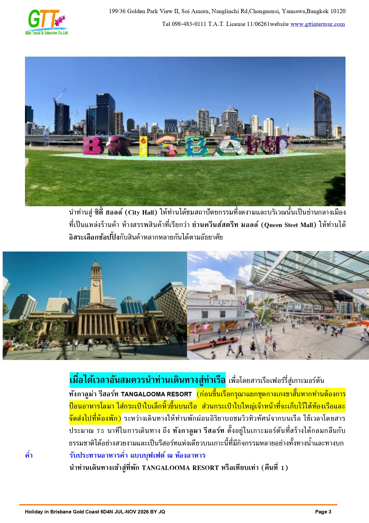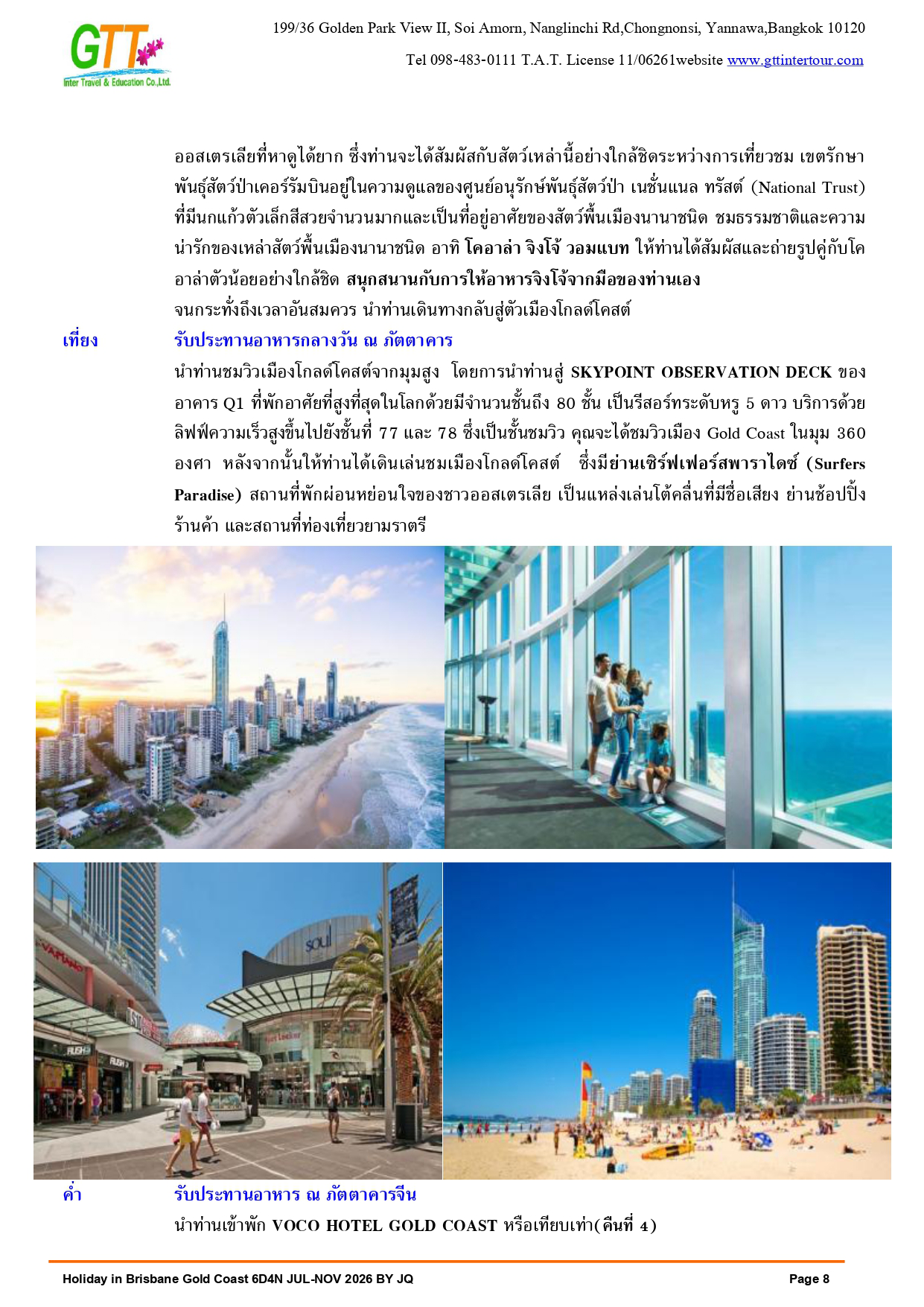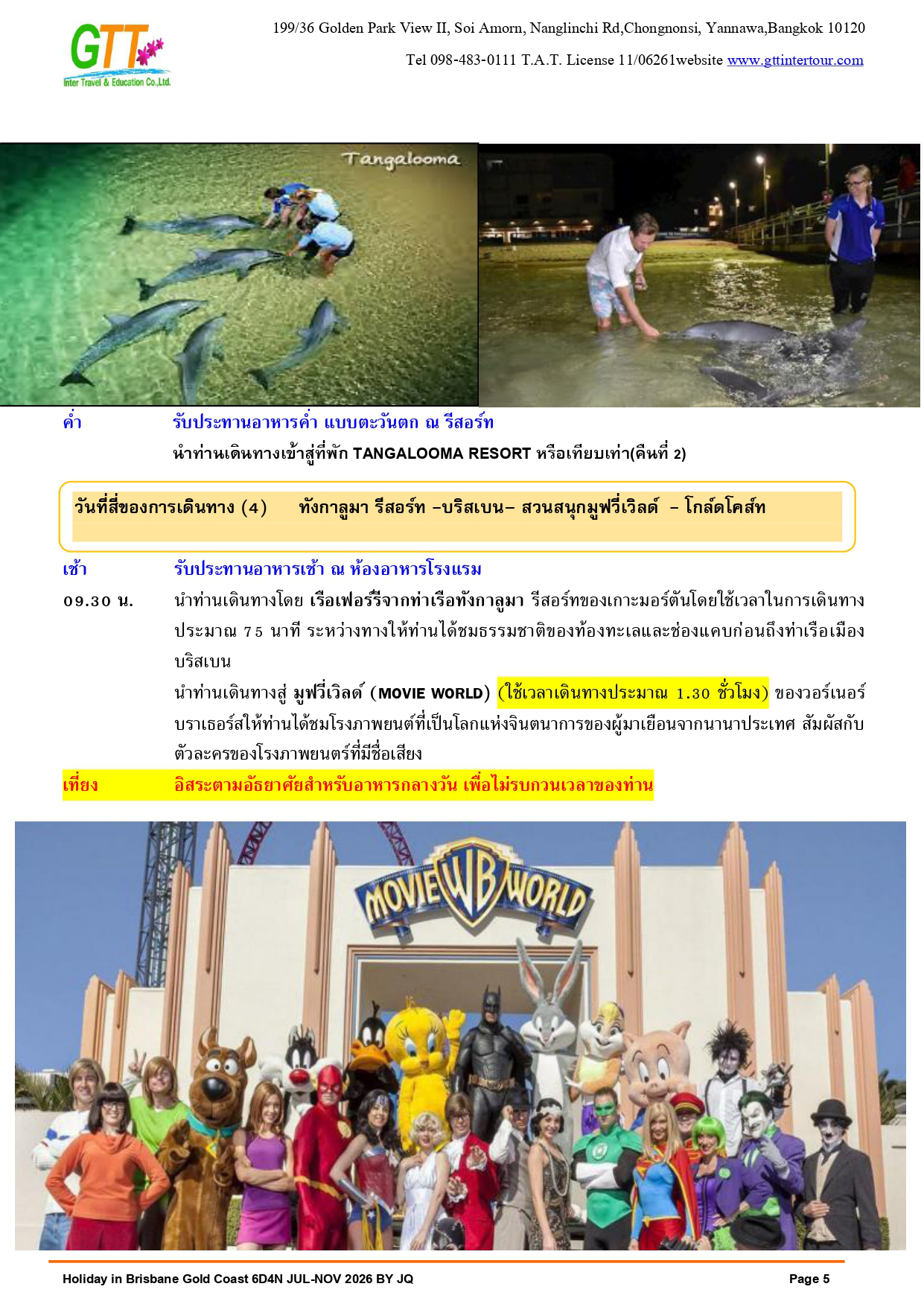 บริสเบน - ชมเมือง - ทังกาลูมา รีสอร์ท - กิจกรรม ATV QUAD BIKE - SAND DUNE - ป้อนอาหารโลมา - สวนสนุกมูฟวี่เวิลด์ - โกลด์โคสต์ - เขตรักษ์พันธุ์สัตว์ป่าเคอร์รัมบิน - ขึ้นตึกชมวิวที่ Skypoint - ย่านเซิร์ฟเฟอร์พาราไดซ์