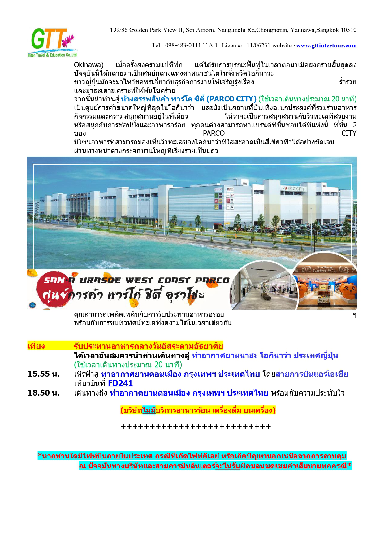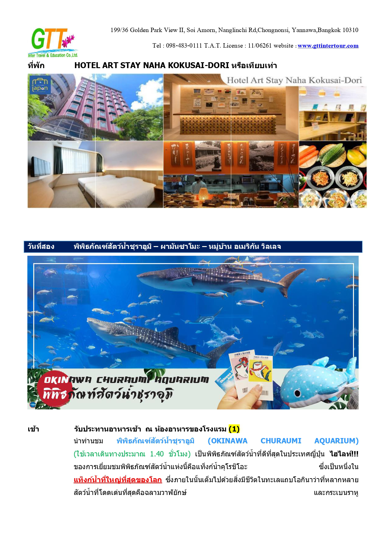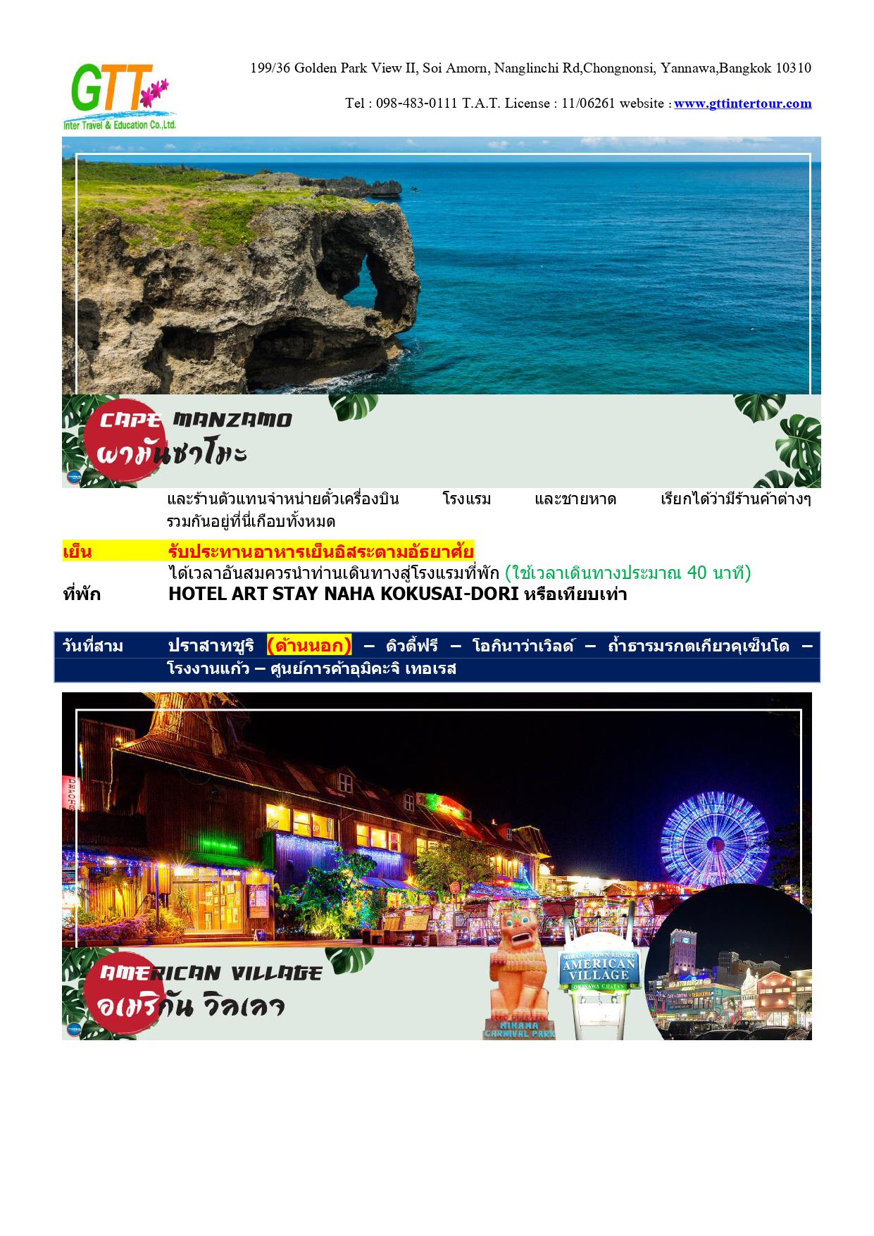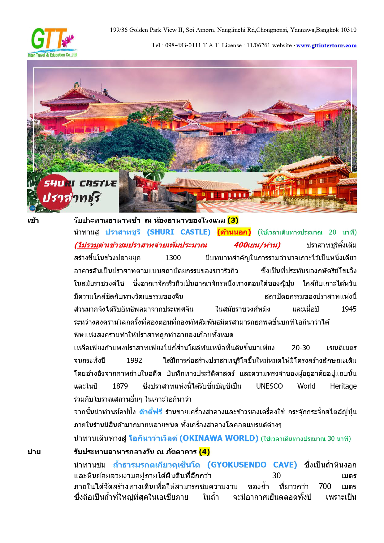 เกาะโอกินาว่า - พิพิธภัณฑ์สัตว์น้ำชุราอูมิ - ผามันซาโมะ - หมู่บ้าน อเมริกัน วิลเลจ - ปราสาทชูริ (ด้านนอก) - ดิวตี้ฟรี - โอกินาว่าเวิลด์ - ถ้ำธารมรกตเกียวคุเซ็นโด - โรงงานแก้ว - ศูนย์การค้าอุมิคะจิ เทอเรส - ศาลเจ้านามิโนะอุเอะ - ห้างสรรพสินค้า พาร์โค ซิตี้