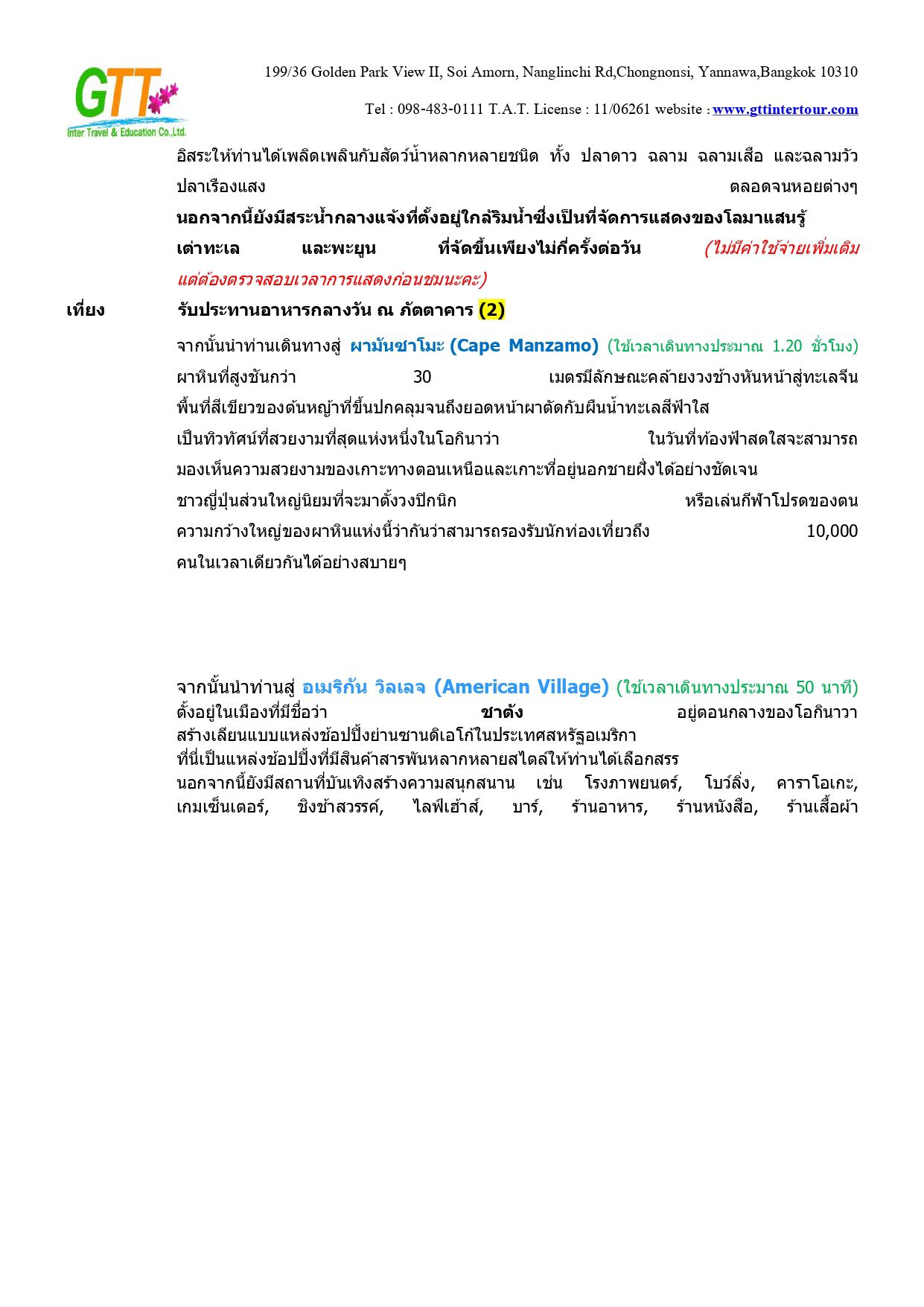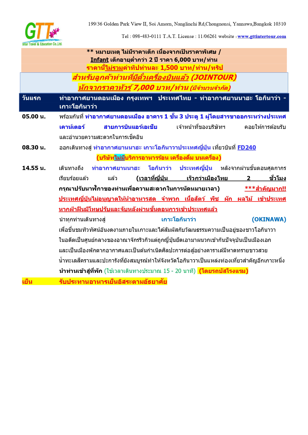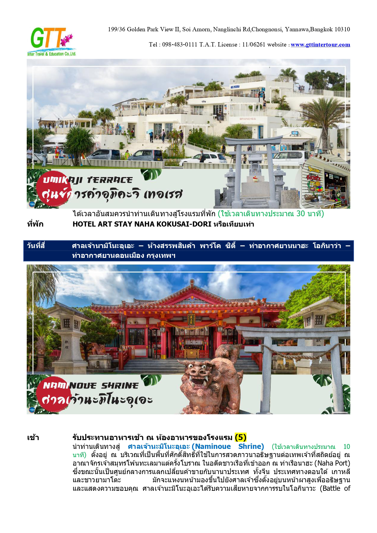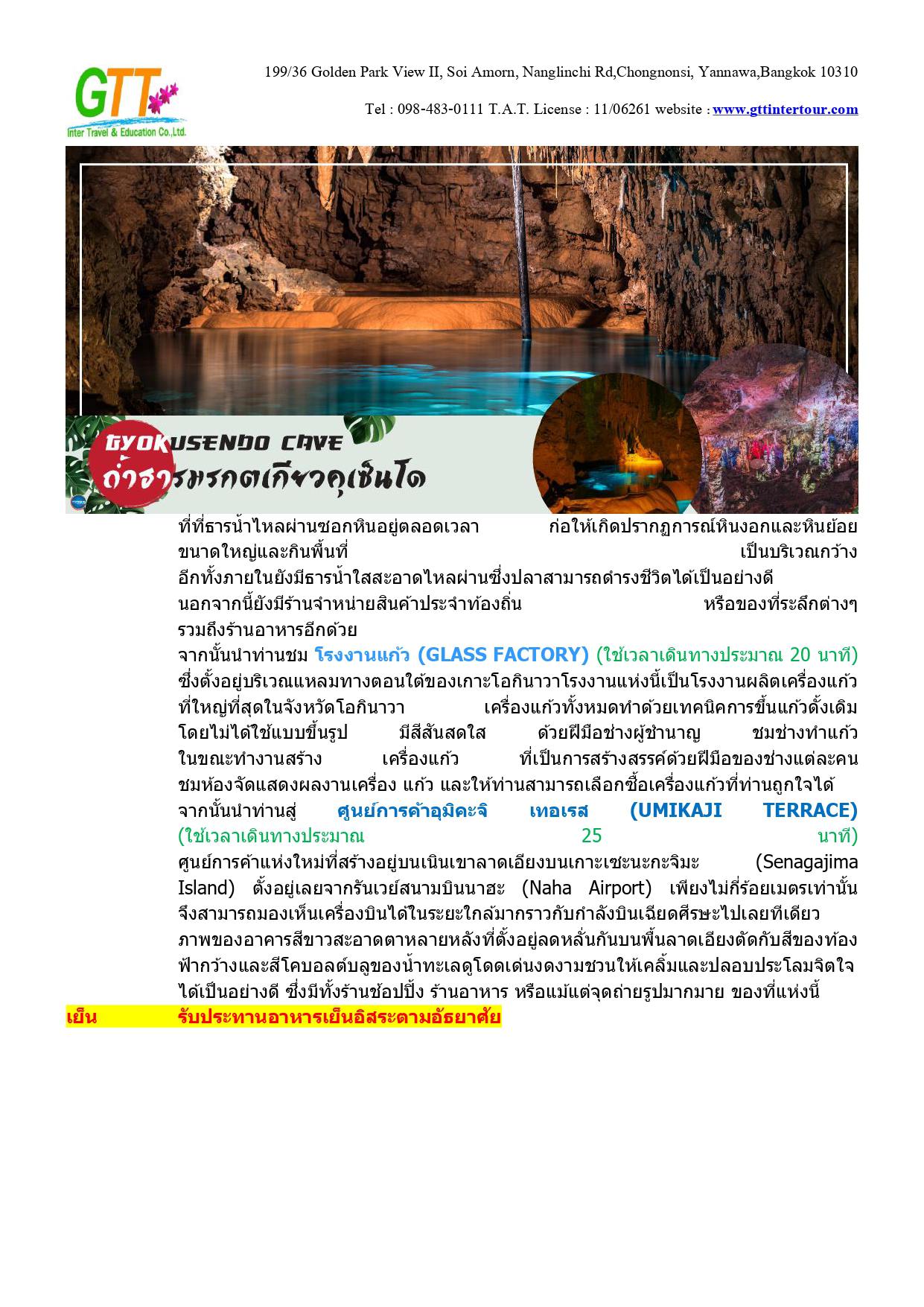 เกาะโอกินาว่า - พิพิธภัณฑ์สัตว์น้ำชุราอูมิ - ผามันซาโมะ - หมู่บ้าน อเมริกัน วิลเลจ - ปราสาทชูริ (ด้านนอก) - ดิวตี้ฟรี - โอกินาว่าเวิลด์ - ถ้ำธารมรกตเกียวคุเซ็นโด - โรงงานแก้ว - ศูนย์การค้าอุมิคะจิ เทอเรส - ศาลเจ้านามิโนะอุเอะ - ห้างสรรพสินค้า พาร์โค ซิตี้
