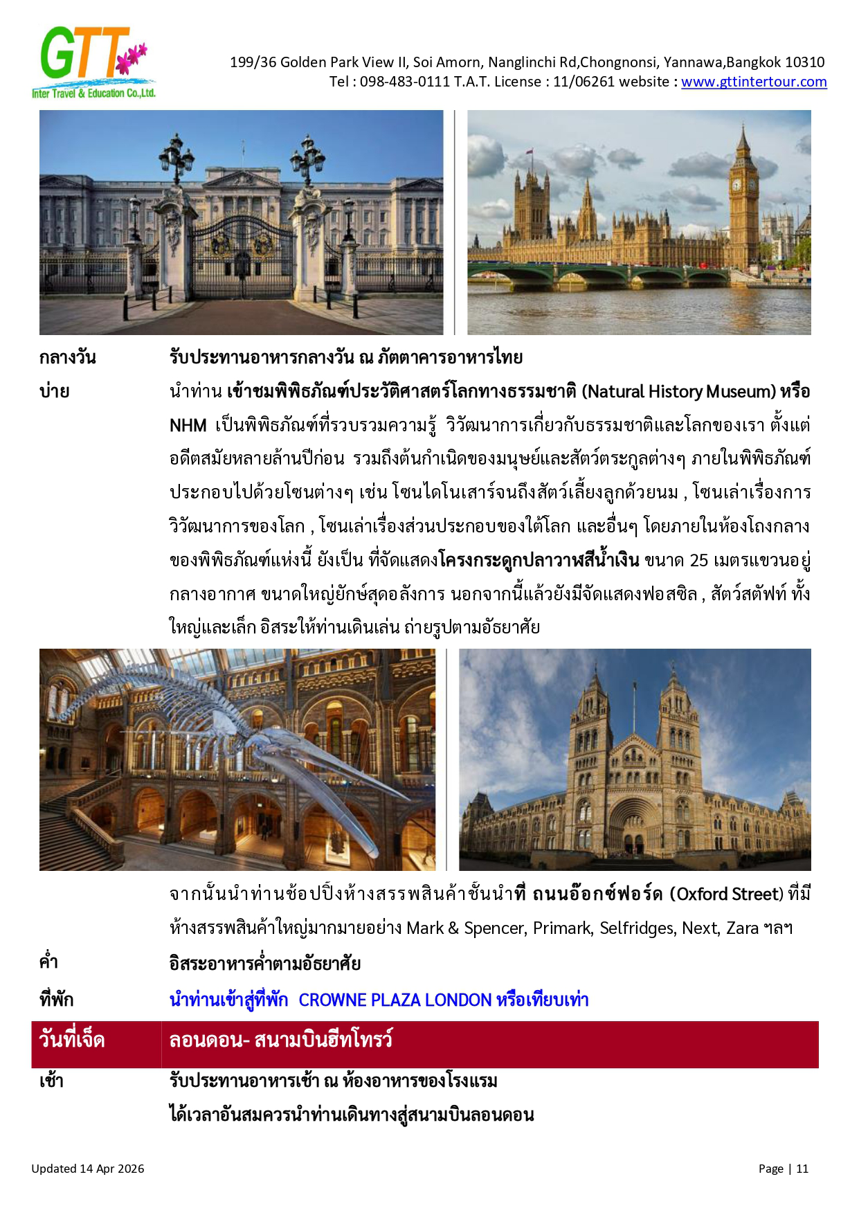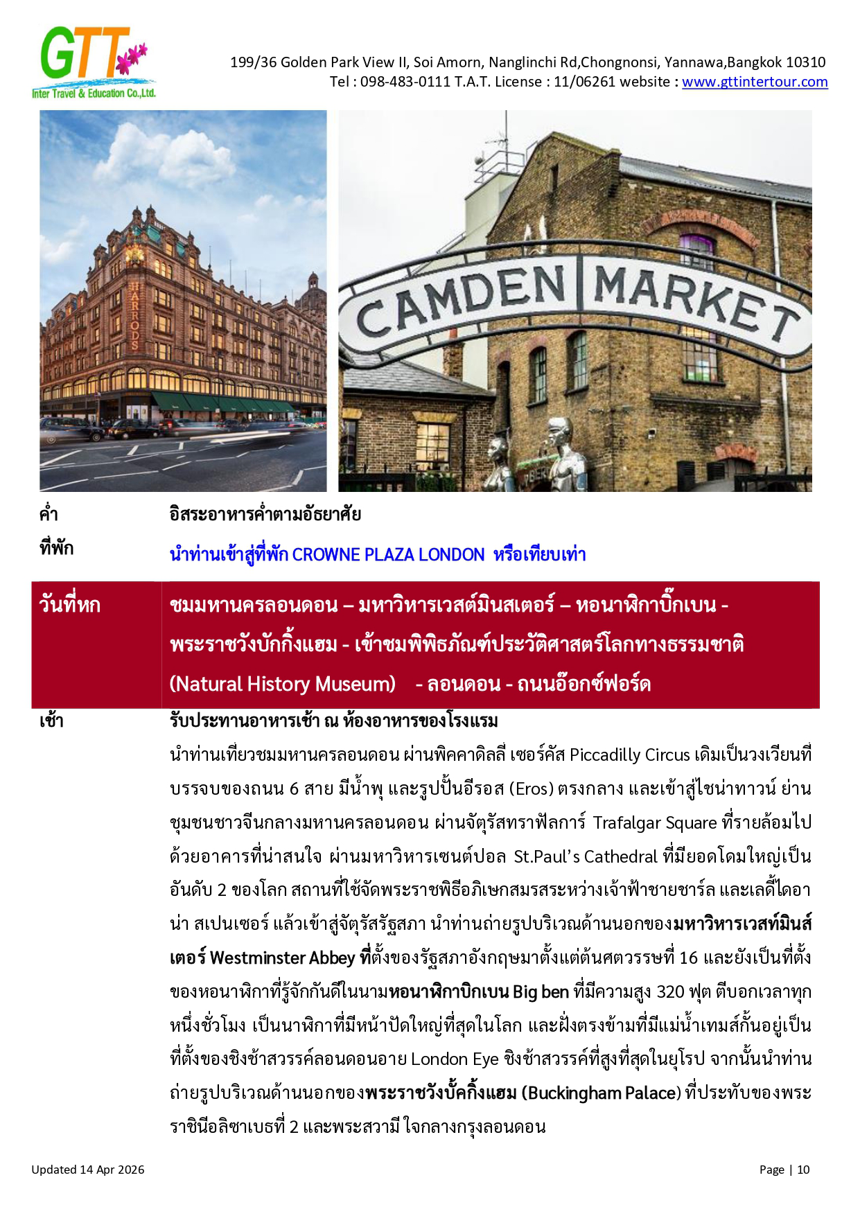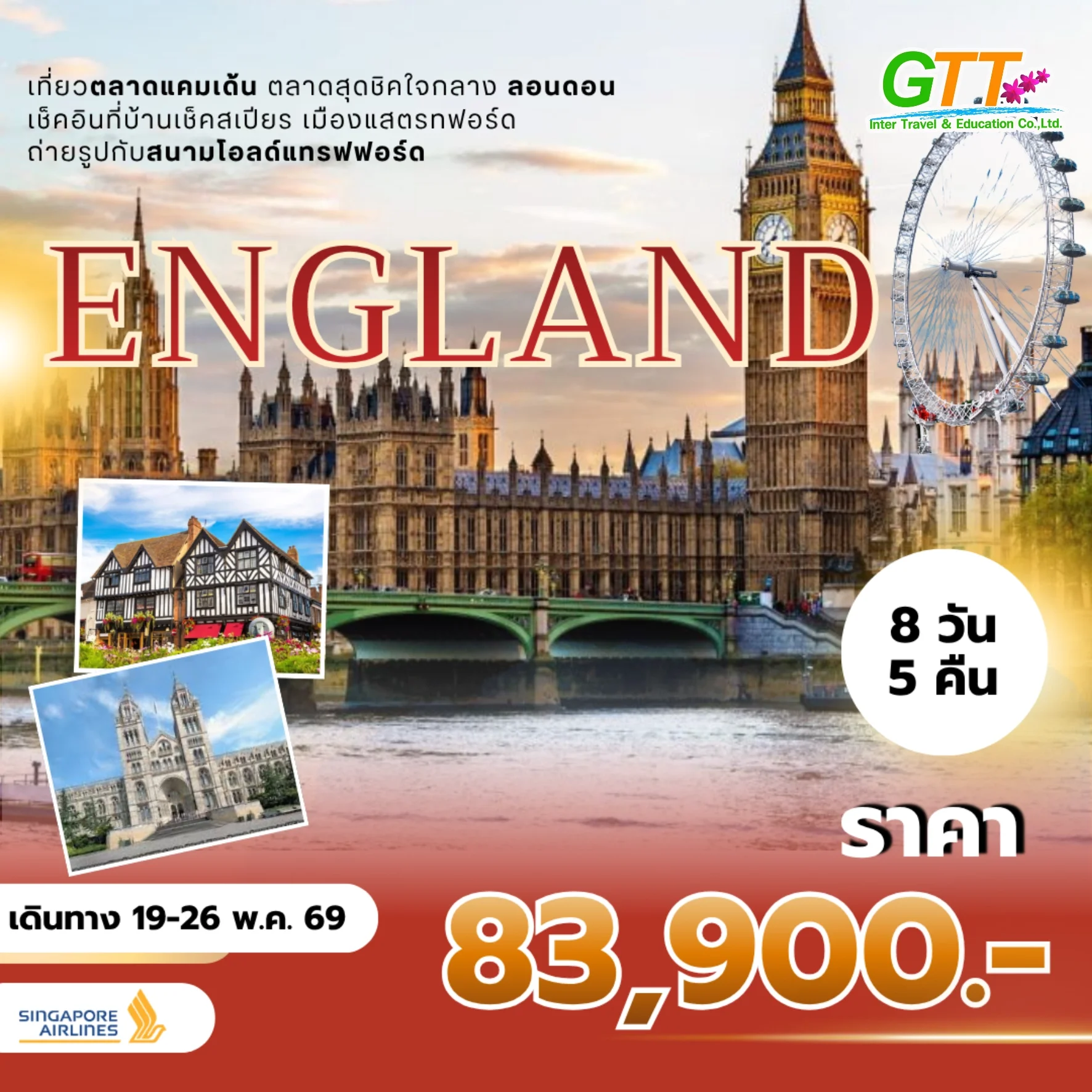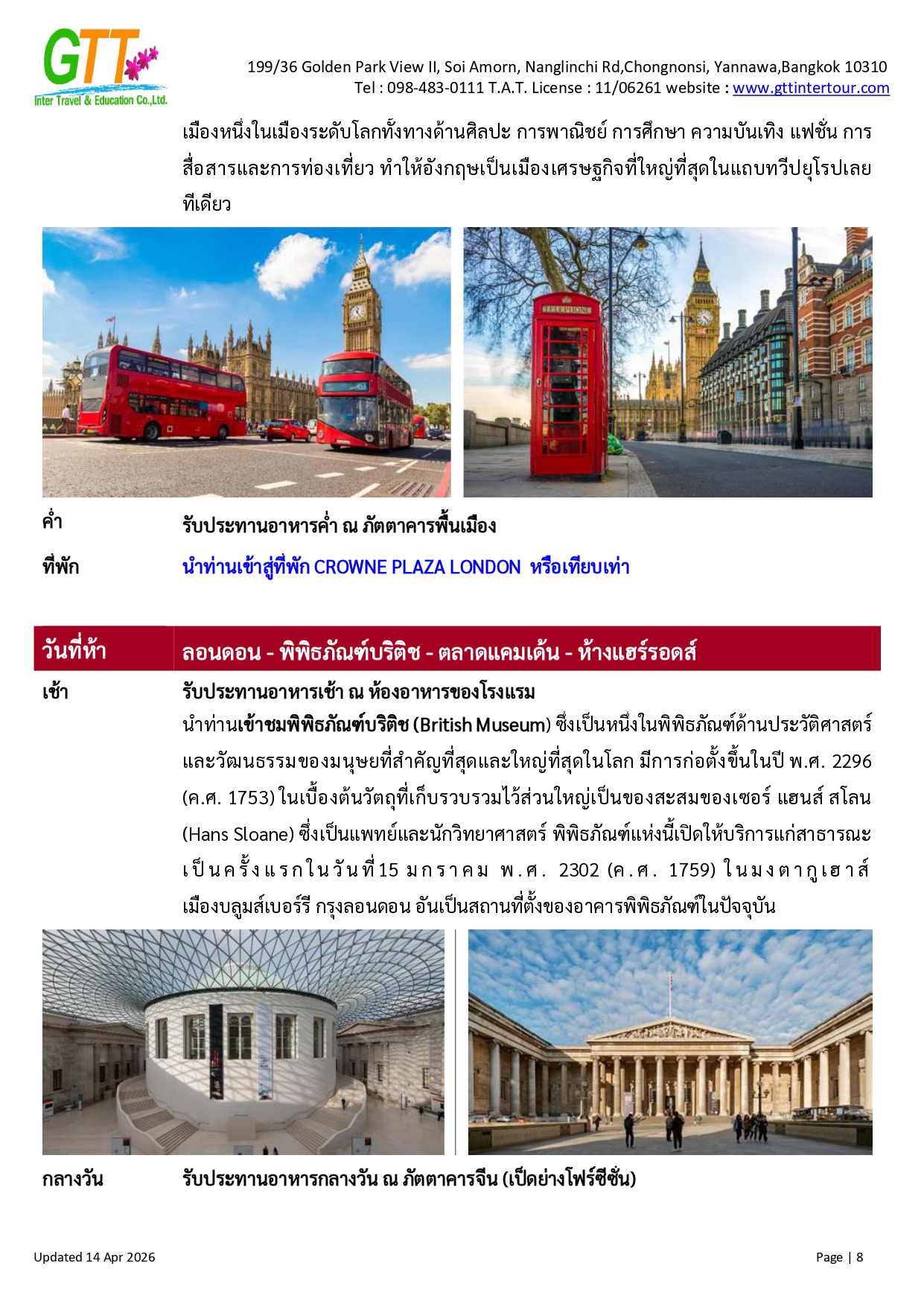 แมนเชสเตอร์ - ลิเวอร์พูล - สแตรทฟอร์ด - บ้านเชคสเปียร์ - บิสเตอร์เอ้าเลท - บาธ - สโตนเฮ้นจ์ - ลอนดอน - พิพิธภัณฑ์บริติช - ตลาดแคมเด้น - ห้างแฮร์รอดส์ - ชมมหานครลอนดอน - มหาวิหารเวสต์มินสเตอร์ - หอนาฬิกาบิ๊กเบน - พระราชวังบักกิ้งแฮม - เข้าชมพิพิธภัณฑ์ประวัติศาสตร์โลกทางธรรมชาติ - ลอนดอน - ถนนอ๊อกซ์ฟอร์ด