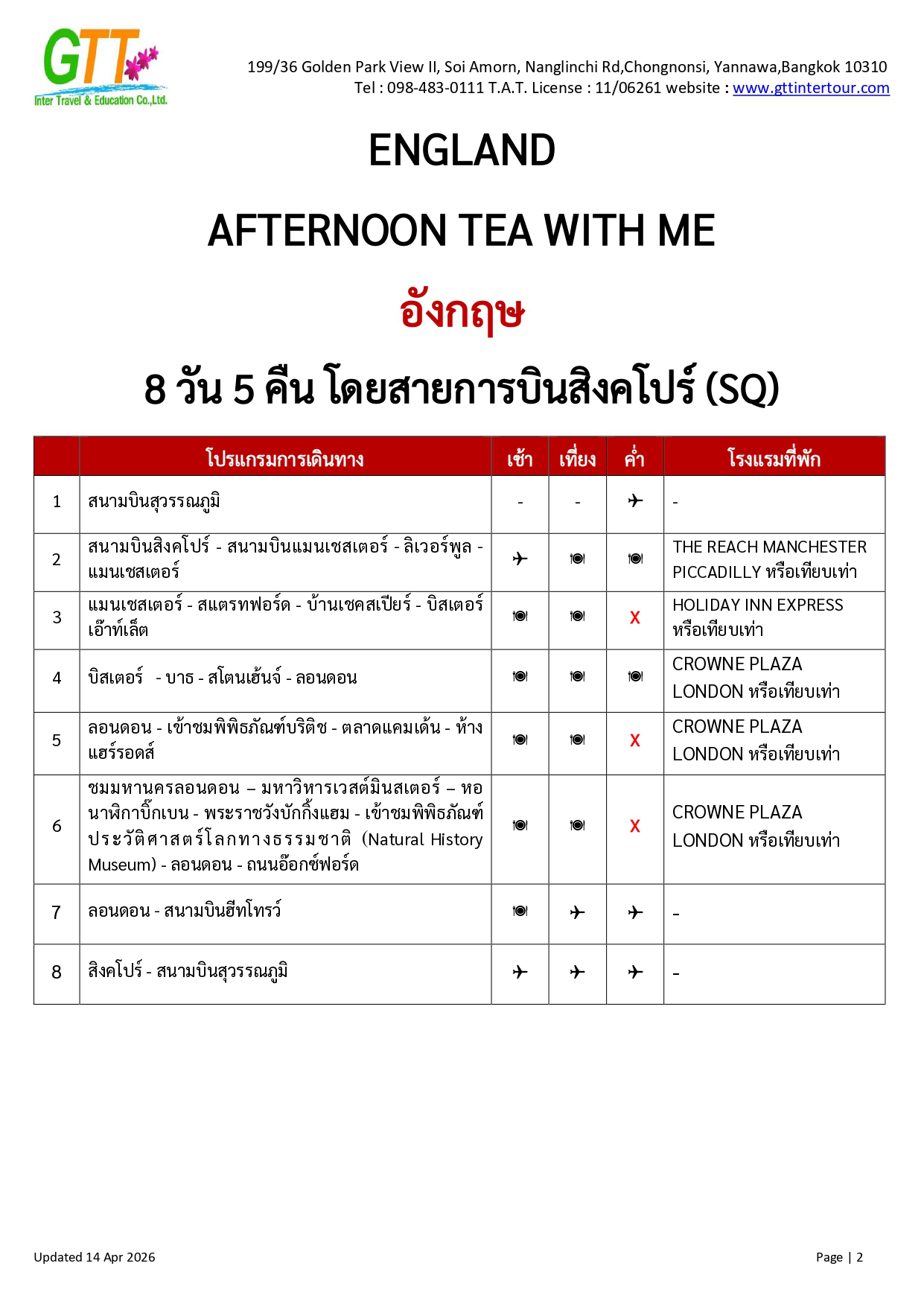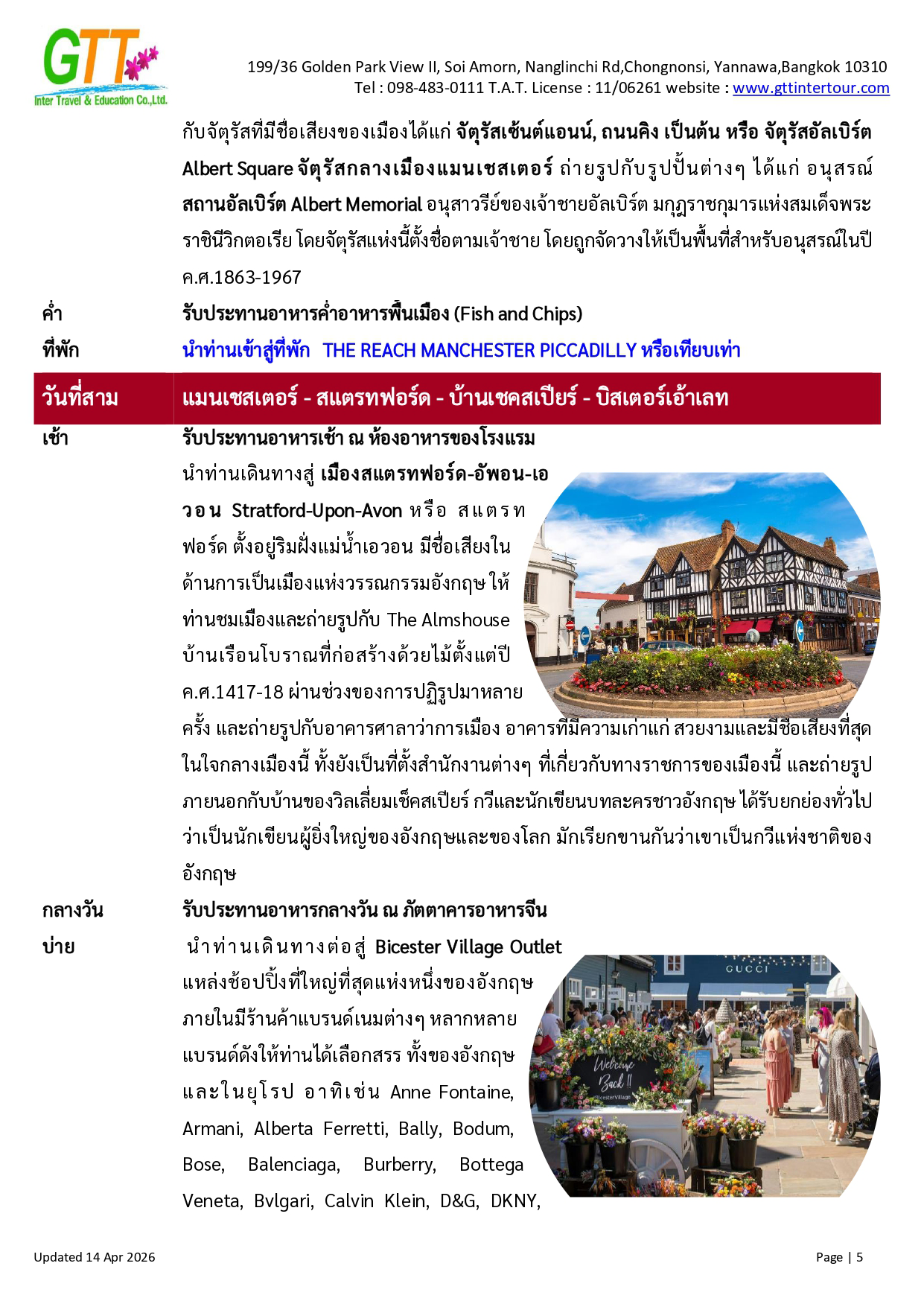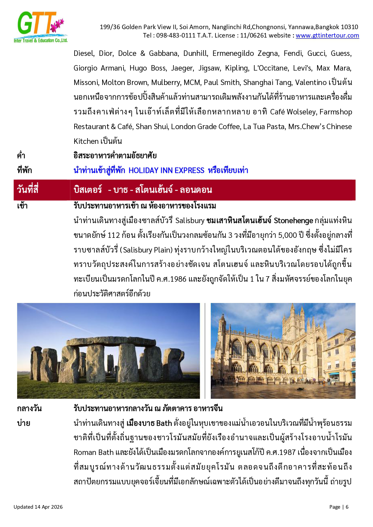 แมนเชสเตอร์ - ลิเวอร์พูล - สแตรทฟอร์ด - บ้านเชคสเปียร์ - บิสเตอร์เอ้าเลท - บาธ - สโตนเฮ้นจ์ - ลอนดอน - พิพิธภัณฑ์บริติช - ตลาดแคมเด้น - ห้างแฮร์รอดส์ - ชมมหานครลอนดอน - มหาวิหารเวสต์มินสเตอร์ - หอนาฬิกาบิ๊กเบน - พระราชวังบักกิ้งแฮม - เข้าชมพิพิธภัณฑ์ประวัติศาสตร์โลกทางธรรมชาติ - ลอนดอน - ถนนอ๊อกซ์ฟอร์ด