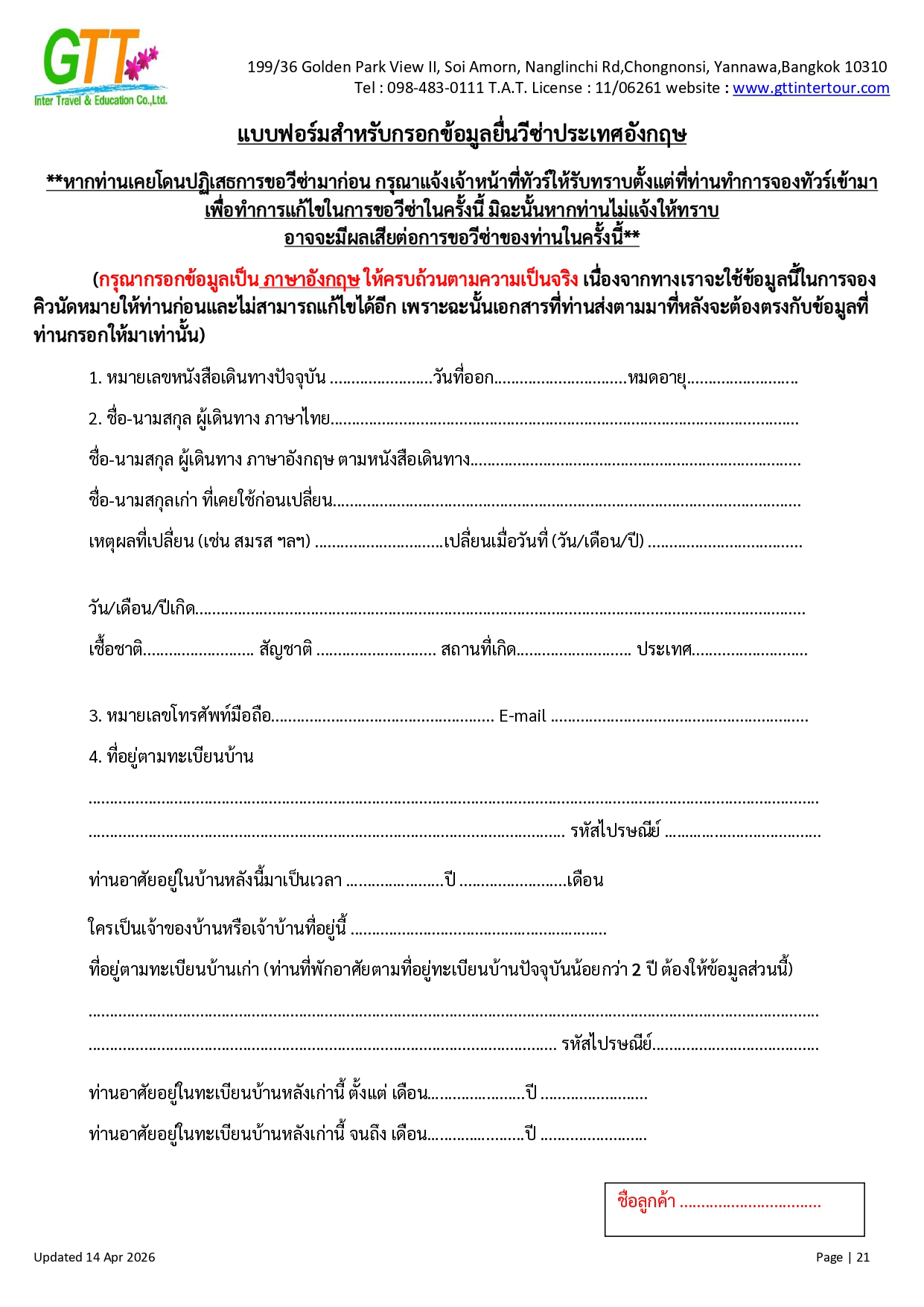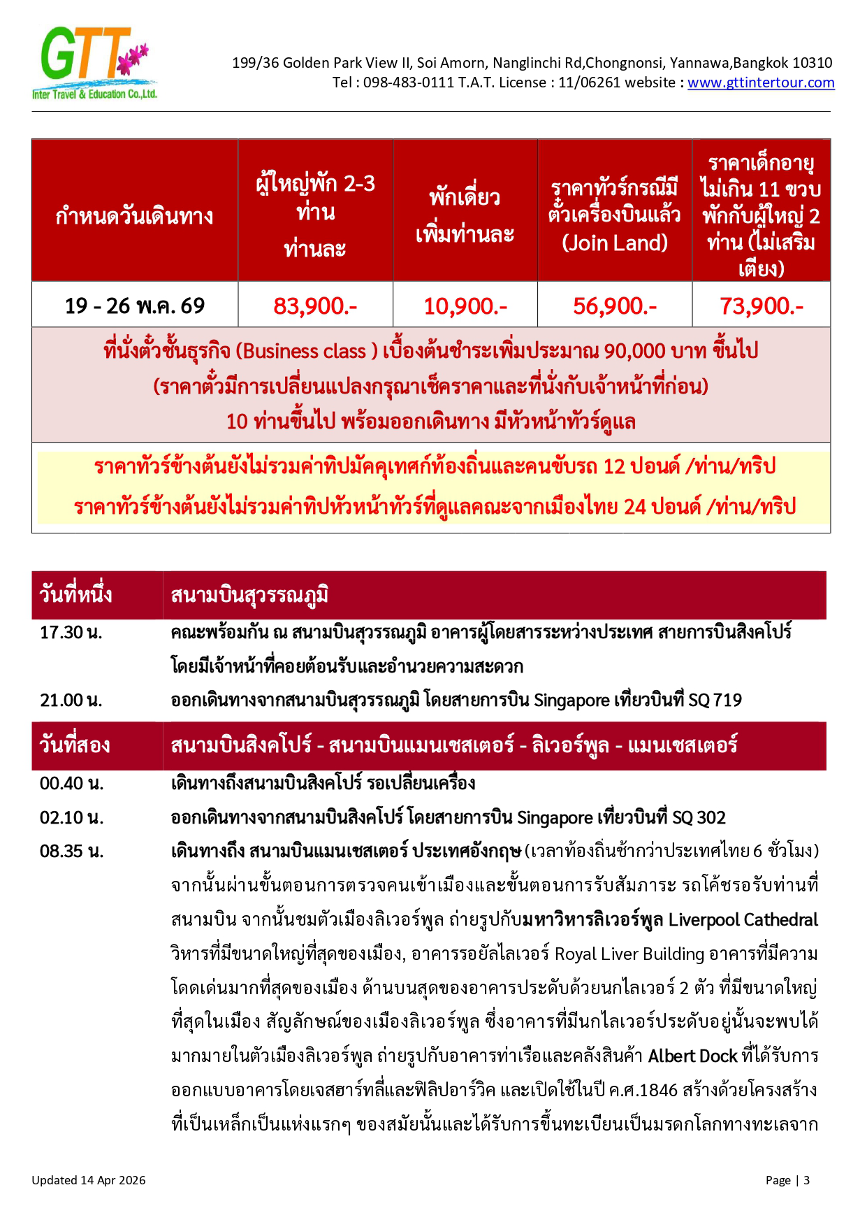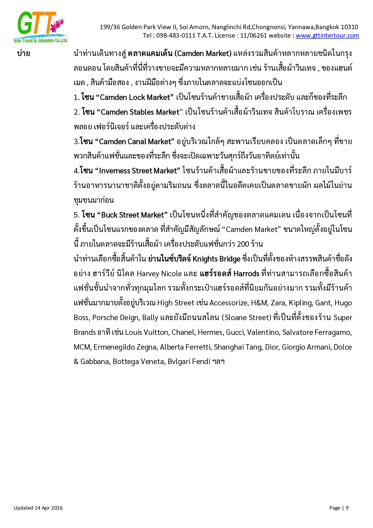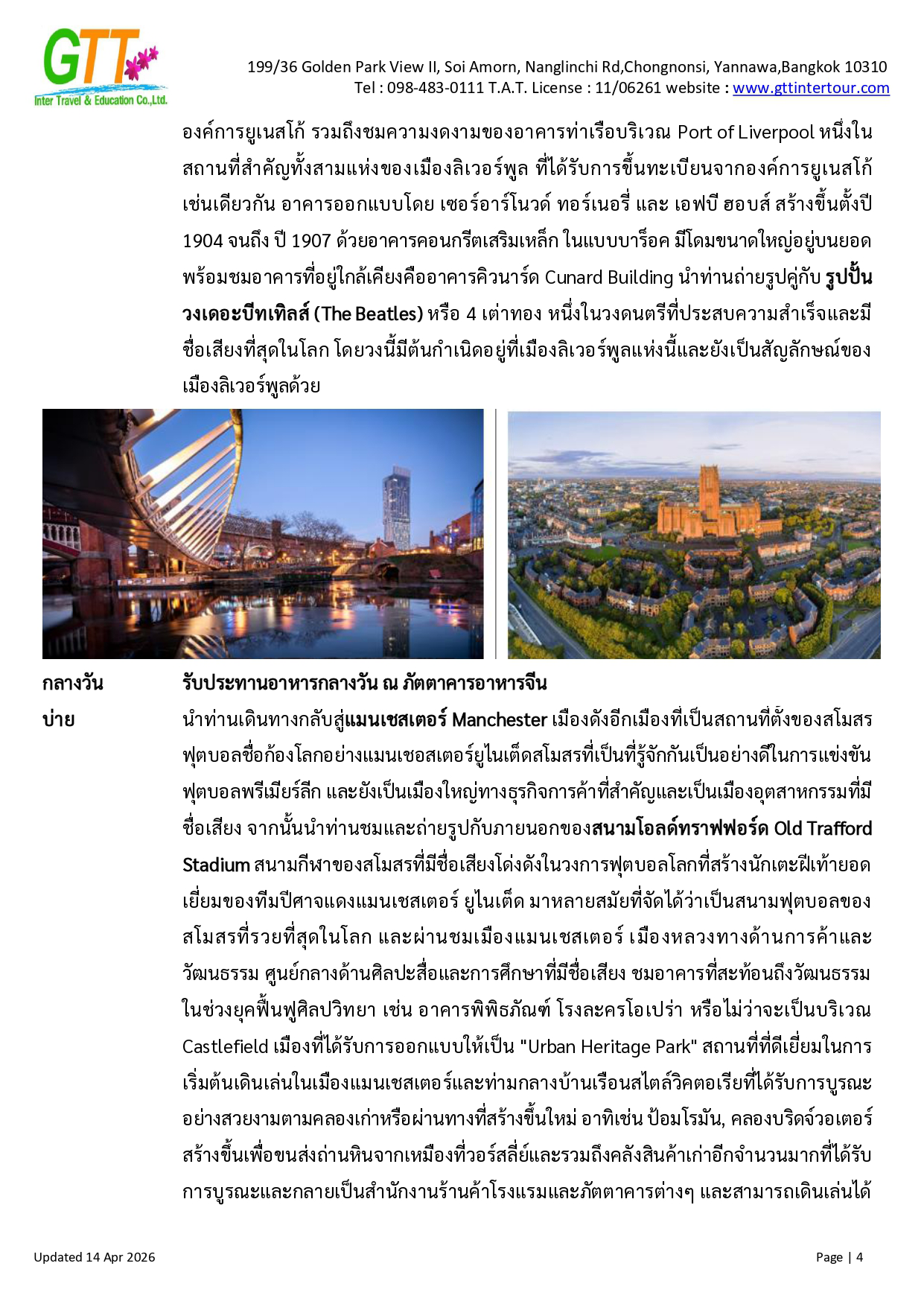แมนเชสเตอร์ - ลิเวอร์พูล - สแตรทฟอร์ด - บ้านเชคสเปียร์ - บิสเตอร์เอ้าเลท - บาธ - สโตนเฮ้นจ์ - ลอนดอน - พิพิธภัณฑ์บริติช - ตลาดแคมเด้น - ห้างแฮร์รอดส์ - ชมมหานครลอนดอน - มหาวิหารเวสต์มินสเตอร์ - หอนาฬิกาบิ๊กเบน - พระราชวังบักกิ้งแฮม - เข้าชมพิพิธภัณฑ์ประวัติศาสตร์โลกทางธรรมชาติ - ลอนดอน - ถนนอ๊อกซ์ฟอร์ด