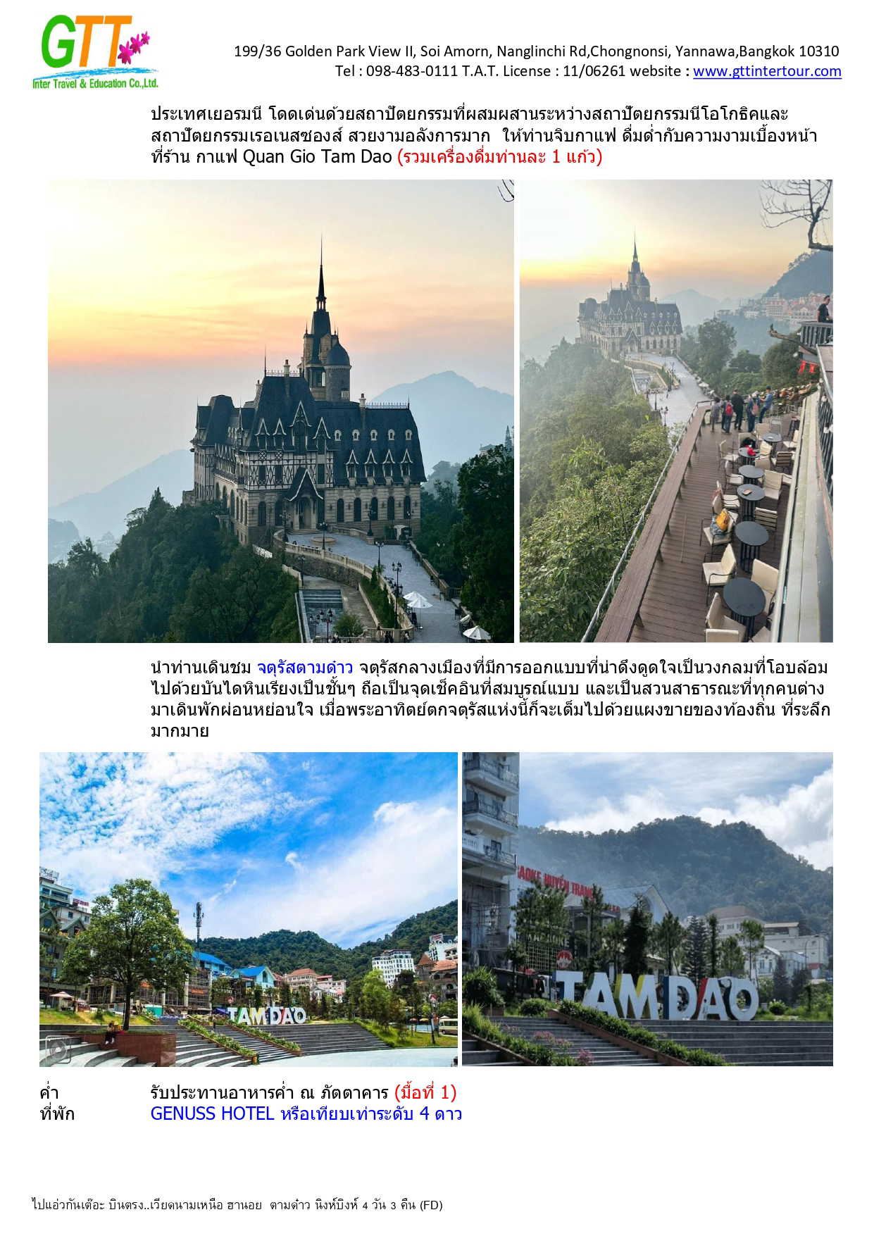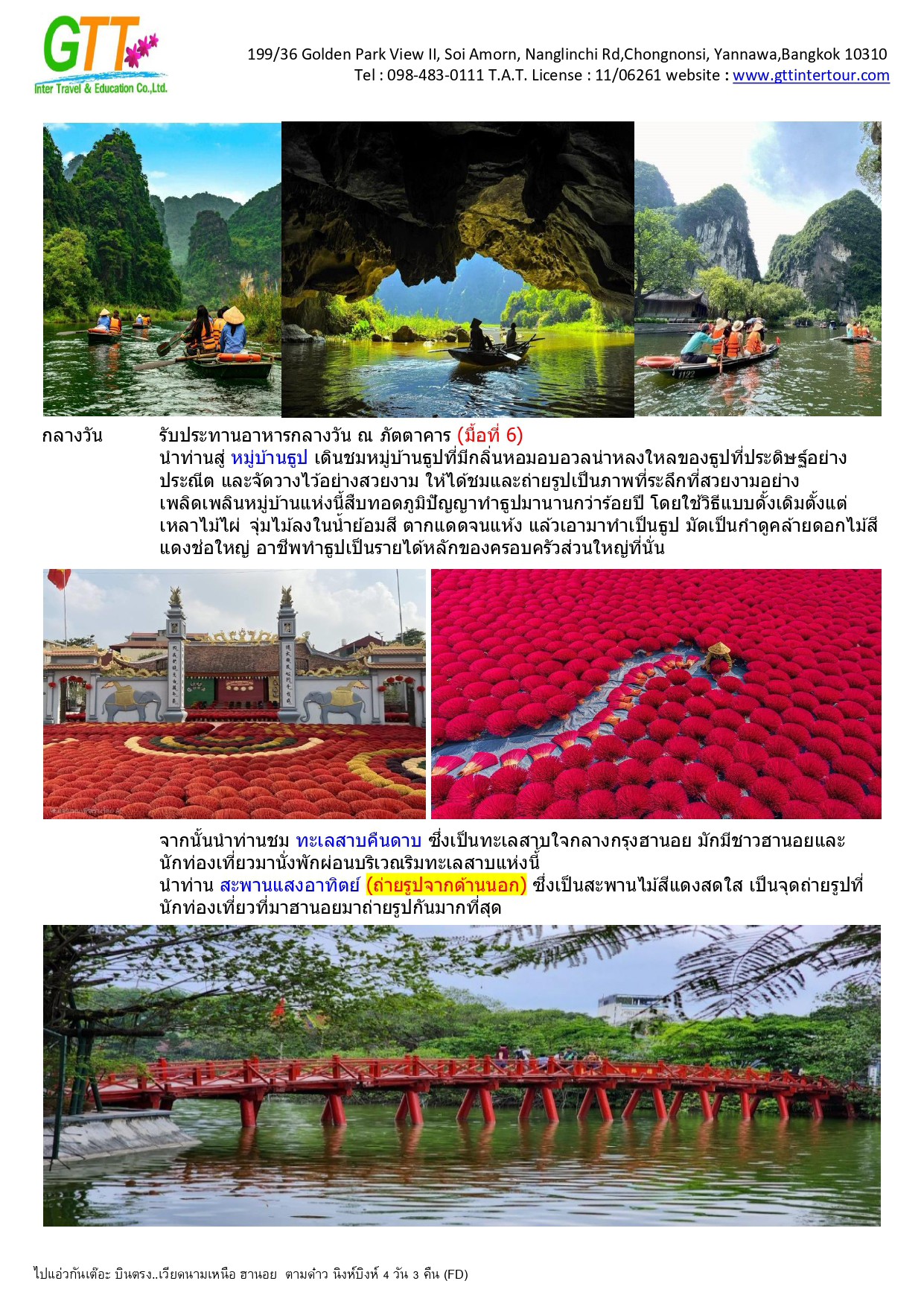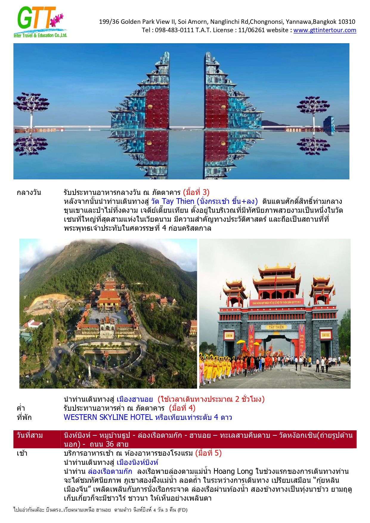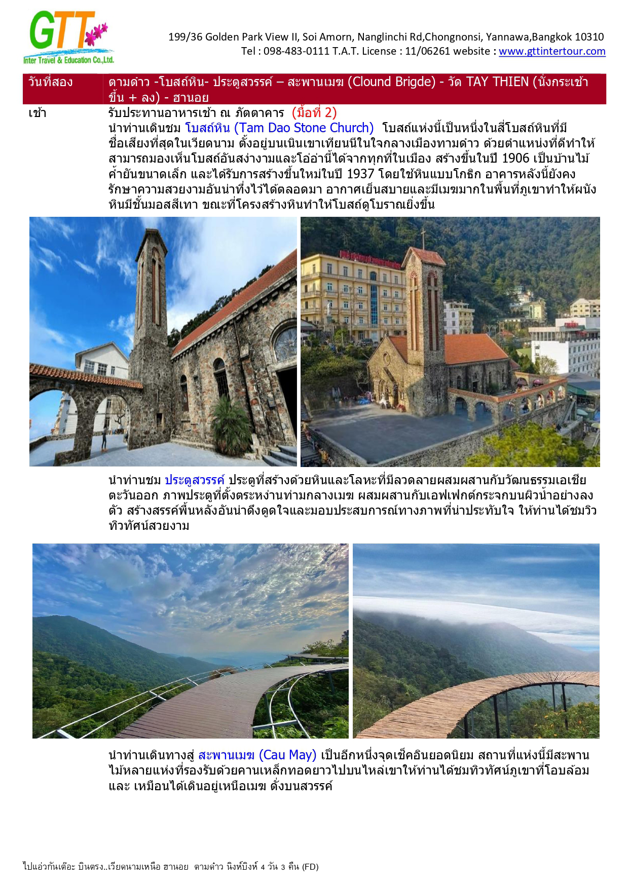 ฮานอย - เมืองตามด๋าว - ร้านกาแฟ Quan Gio Tam Dao (รวมเครื่องดื่มท่านละ 1 แก้ว) - ชมวิวปราสาทตามด๋าว - จตุรัสตามด๋าว - โบสถ์หิน - ประตูสวรรค์ - สะพานเมฆ (Clound Brigde) - วัด TAY THIEN (นั่งกระเช้า ขึ้น+ลง) - นิงห์บิงห์ - หมูบ้านธูป - ล่องเรือตามก๊ก - ทะเลสาบคืนดาบ - วัดหง๊อกเซิน(ถ่ายรูปด้านนอก) - ถนน 36 สาย - กาแฟรถไฟ - โบสถ์เซนต์โจเซฟ - จตุรัสบาดิงห์ (ถ่ายรูปด้านนอก)