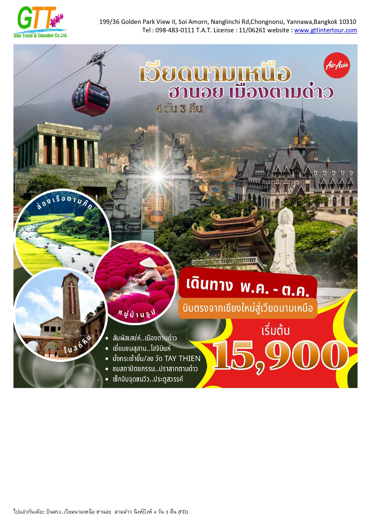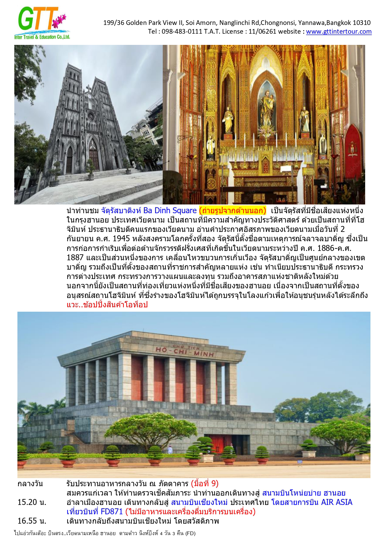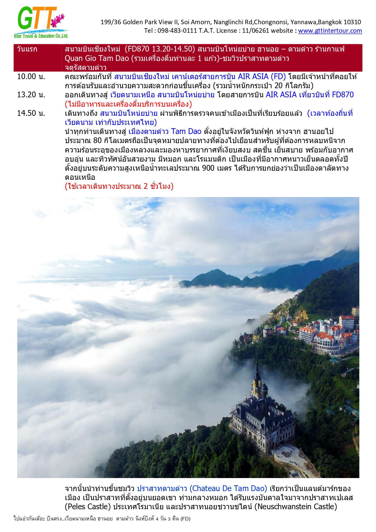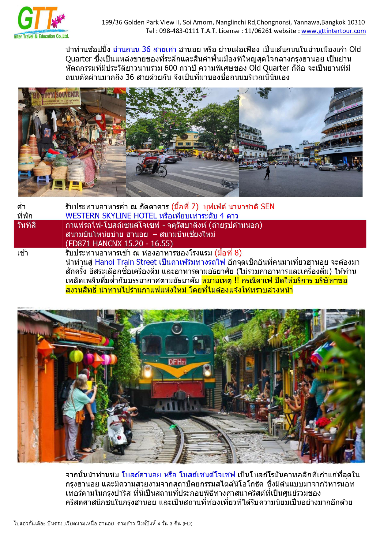 ฮานอย - เมืองตามด๋าว - ร้านกาแฟ Quan Gio Tam Dao (รวมเครื่องดื่มท่านละ 1 แก้ว) - ชมวิวปราสาทตามด๋าว - จตุรัสตามด๋าว - โบสถ์หิน - ประตูสวรรค์ - สะพานเมฆ (Clound Brigde) - วัด TAY THIEN (นั่งกระเช้า ขึ้น+ลง) - นิงห์บิงห์ - หมูบ้านธูป - ล่องเรือตามก๊ก - ทะเลสาบคืนดาบ - วัดหง๊อกเซิน(ถ่ายรูปด้านนอก) - ถนน 36 สาย - กาแฟรถไฟ - โบสถ์เซนต์โจเซฟ - จตุรัสบาดิงห์ (ถ่ายรูปด้านนอก)