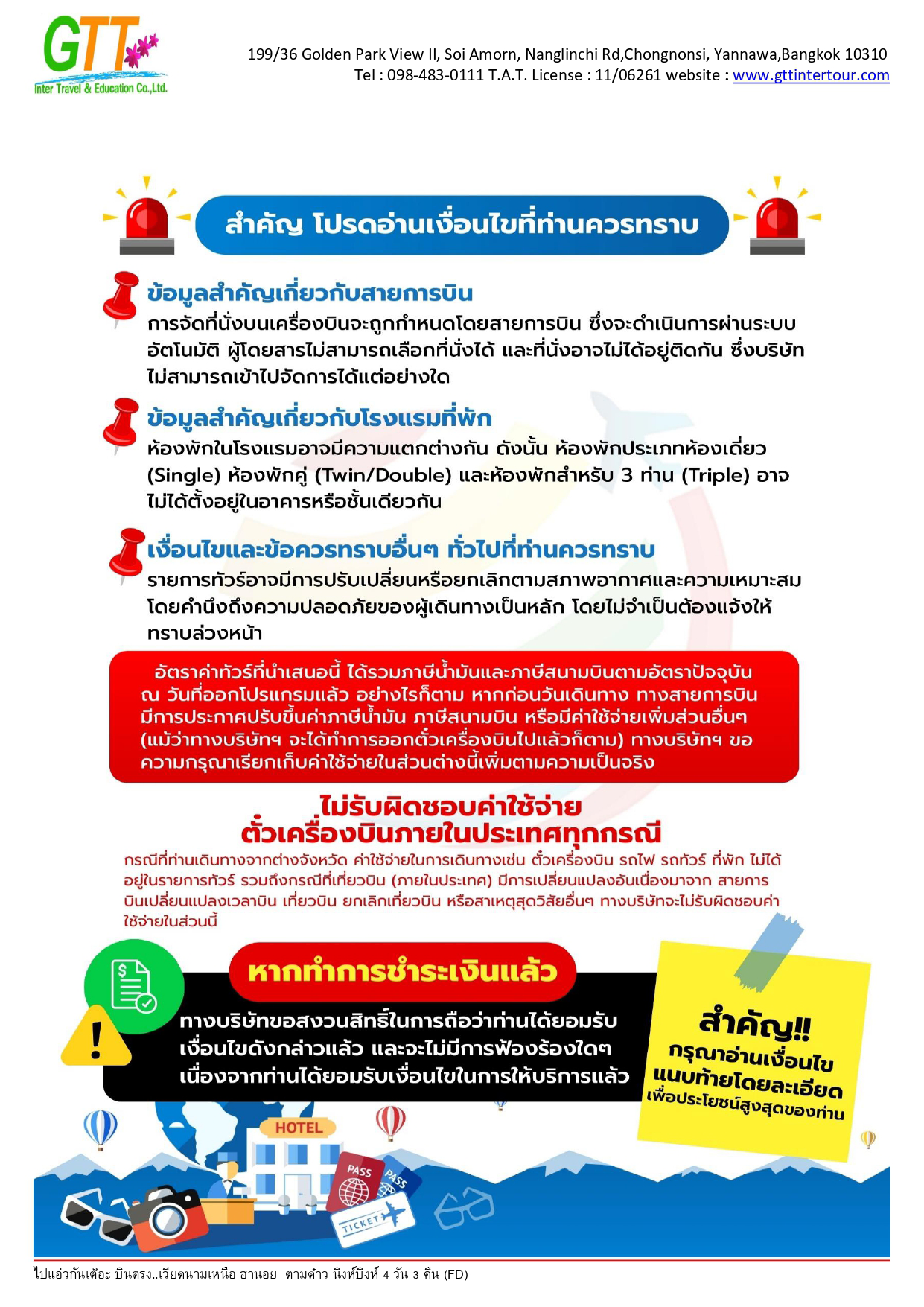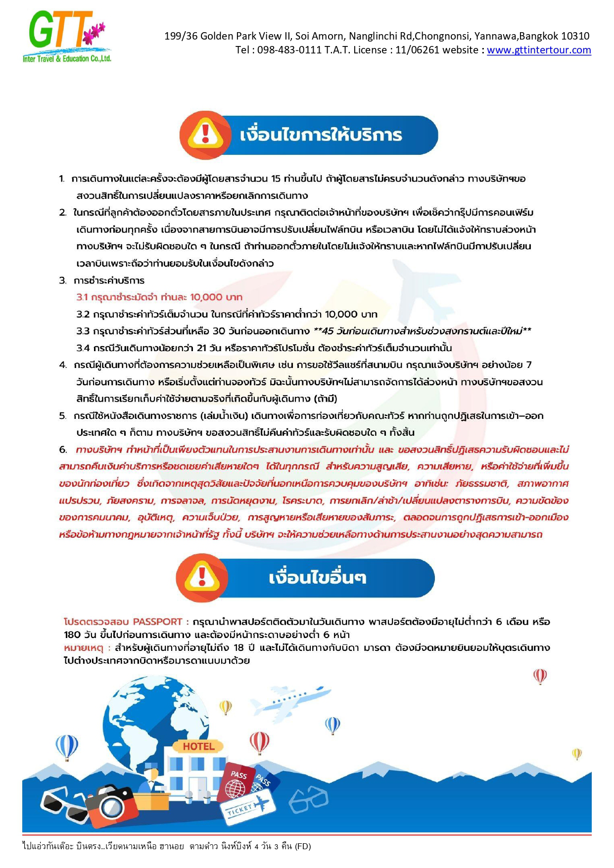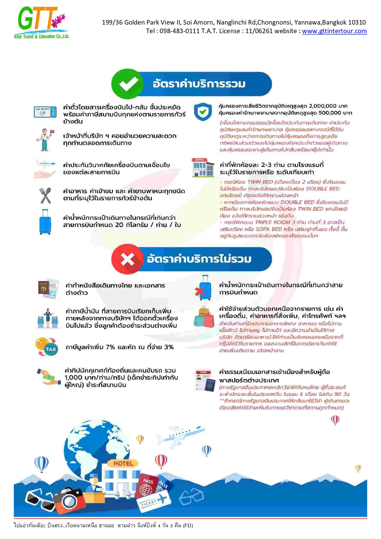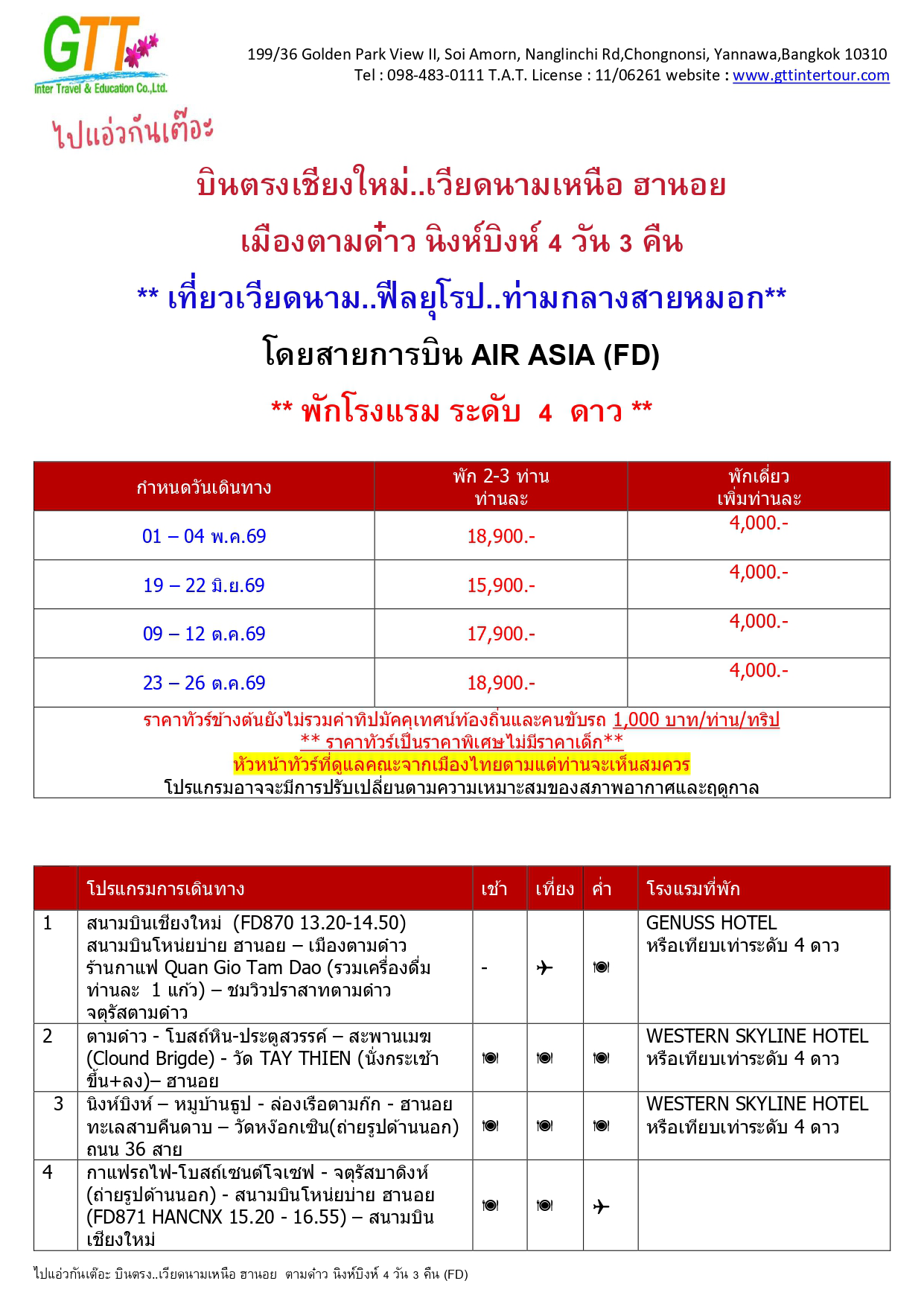 ฮานอย - เมืองตามด๋าว - ร้านกาแฟ Quan Gio Tam Dao (รวมเครื่องดื่มท่านละ 1 แก้ว) - ชมวิวปราสาทตามด๋าว - จตุรัสตามด๋าว - โบสถ์หิน - ประตูสวรรค์ - สะพานเมฆ (Clound Brigde) - วัด TAY THIEN (นั่งกระเช้า ขึ้น+ลง) - นิงห์บิงห์ - หมูบ้านธูป - ล่องเรือตามก๊ก - ทะเลสาบคืนดาบ - วัดหง๊อกเซิน(ถ่ายรูปด้านนอก) - ถนน 36 สาย - กาแฟรถไฟ - โบสถ์เซนต์โจเซฟ - จตุรัสบาดิงห์ (ถ่ายรูปด้านนอก)