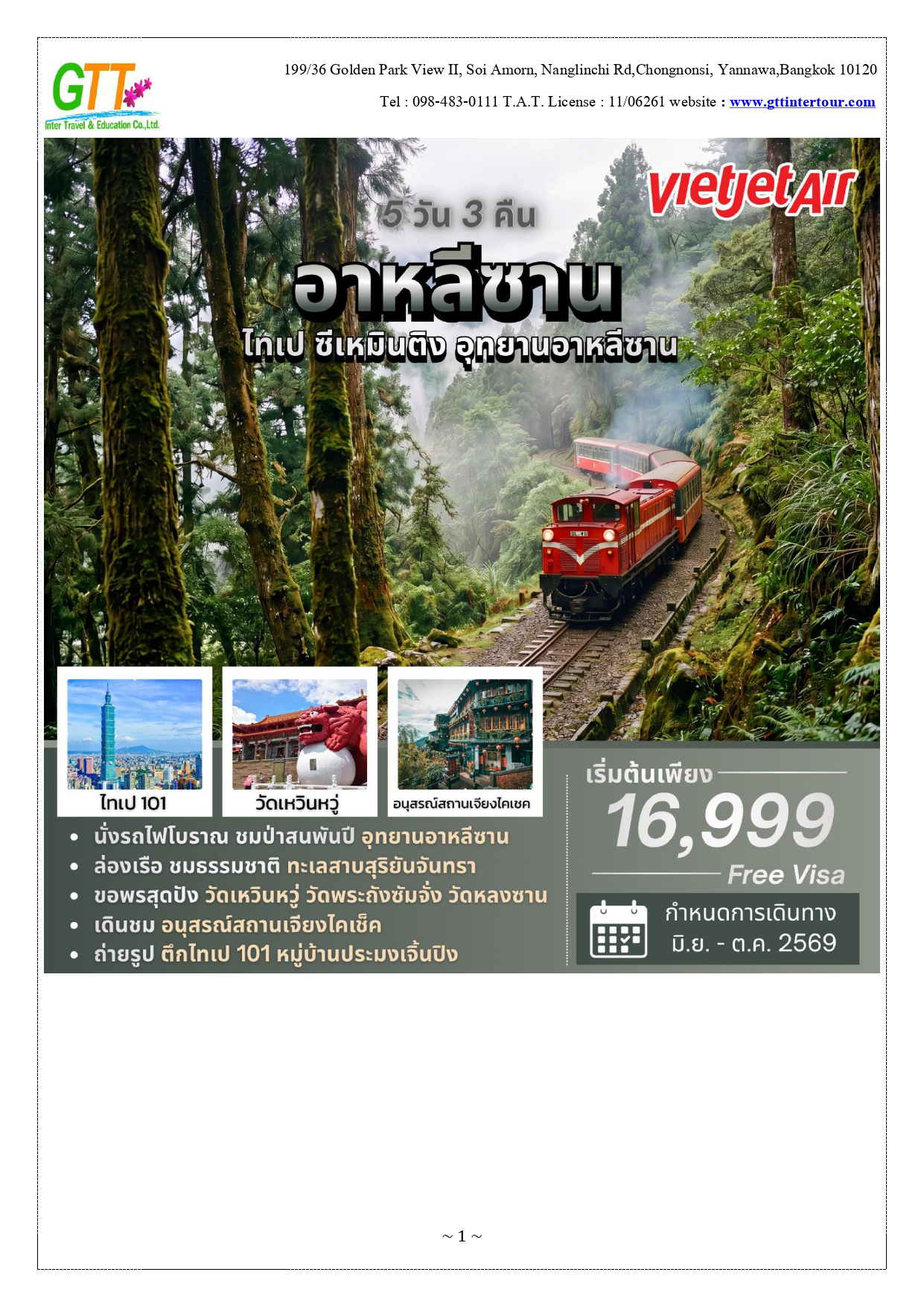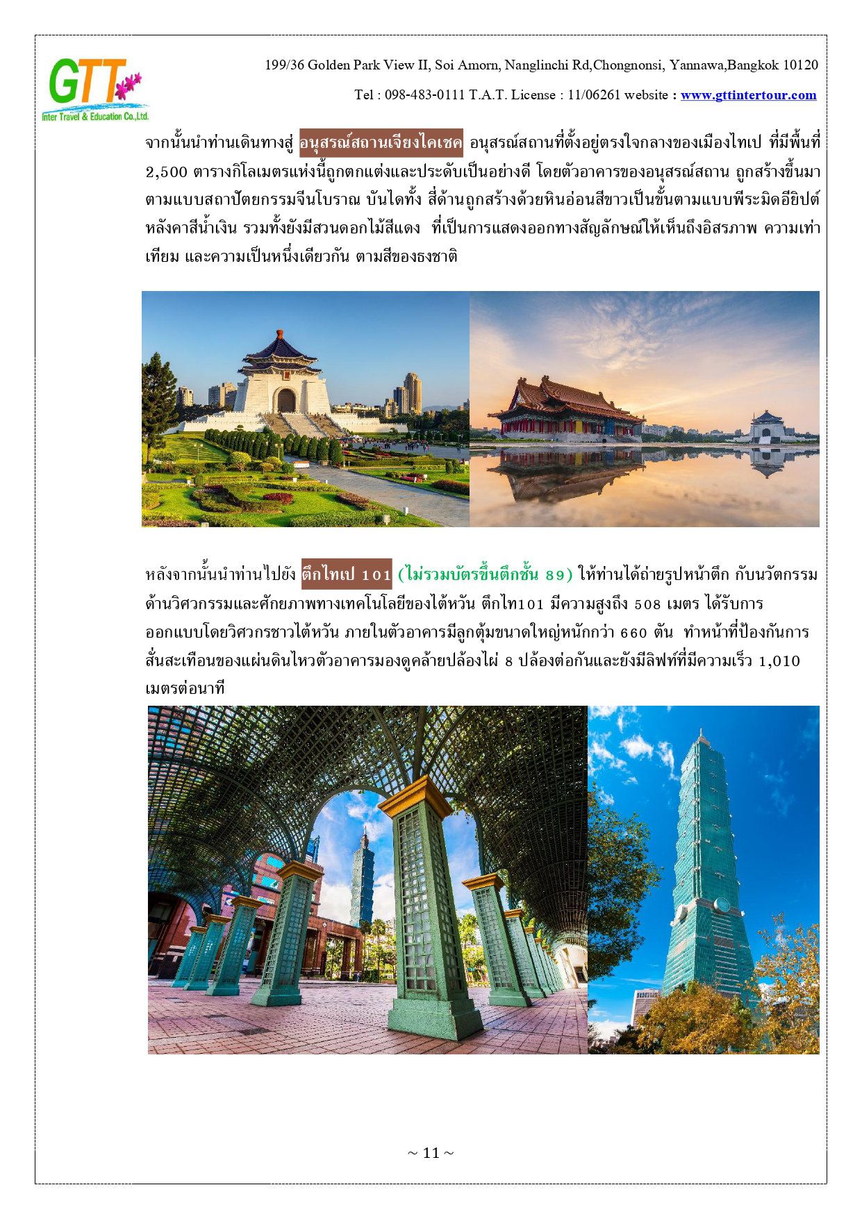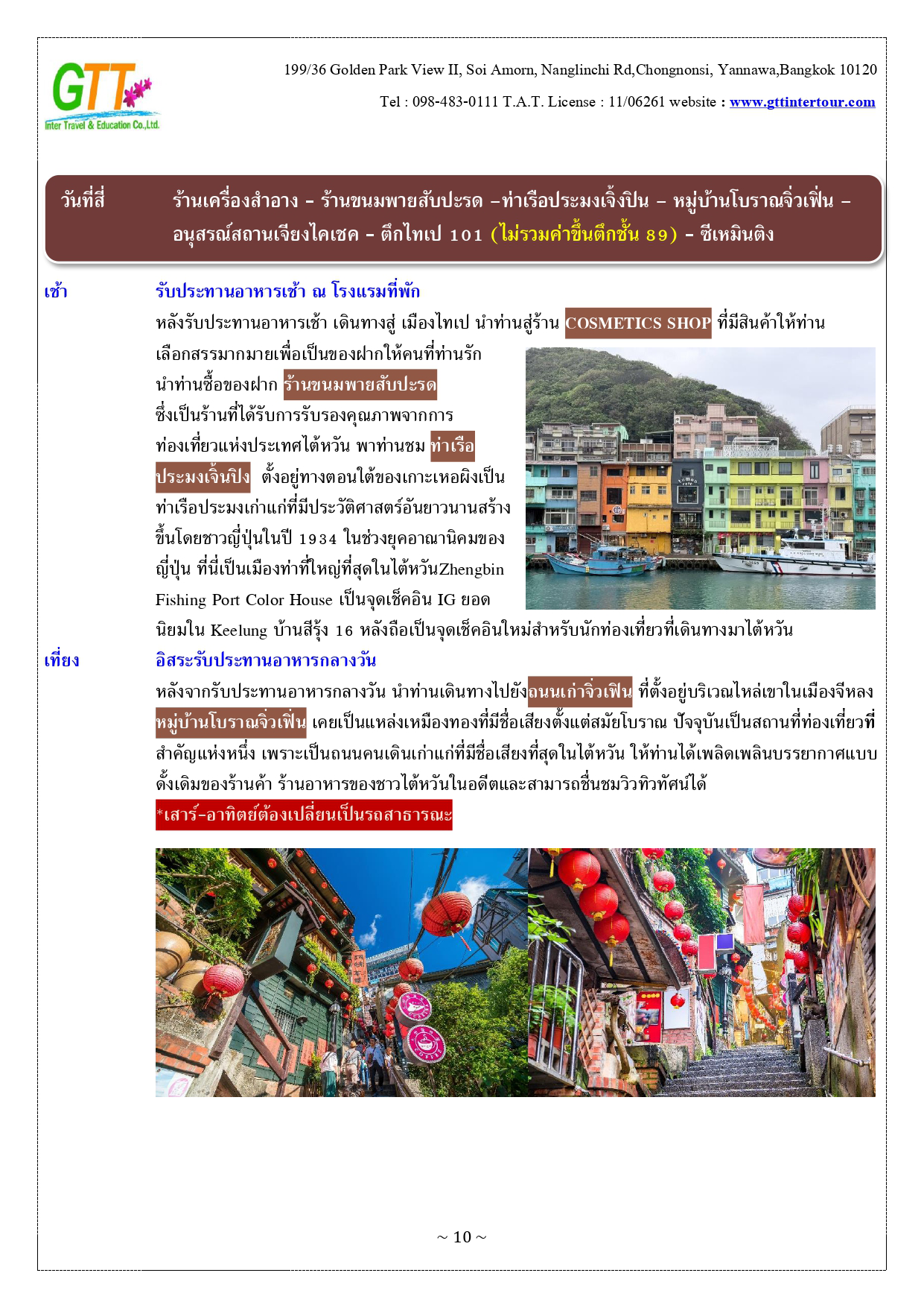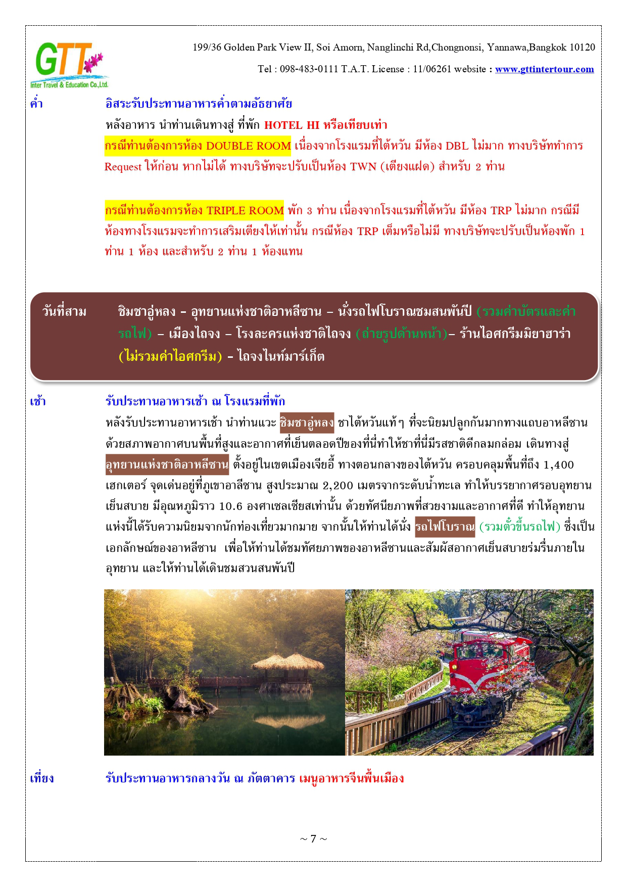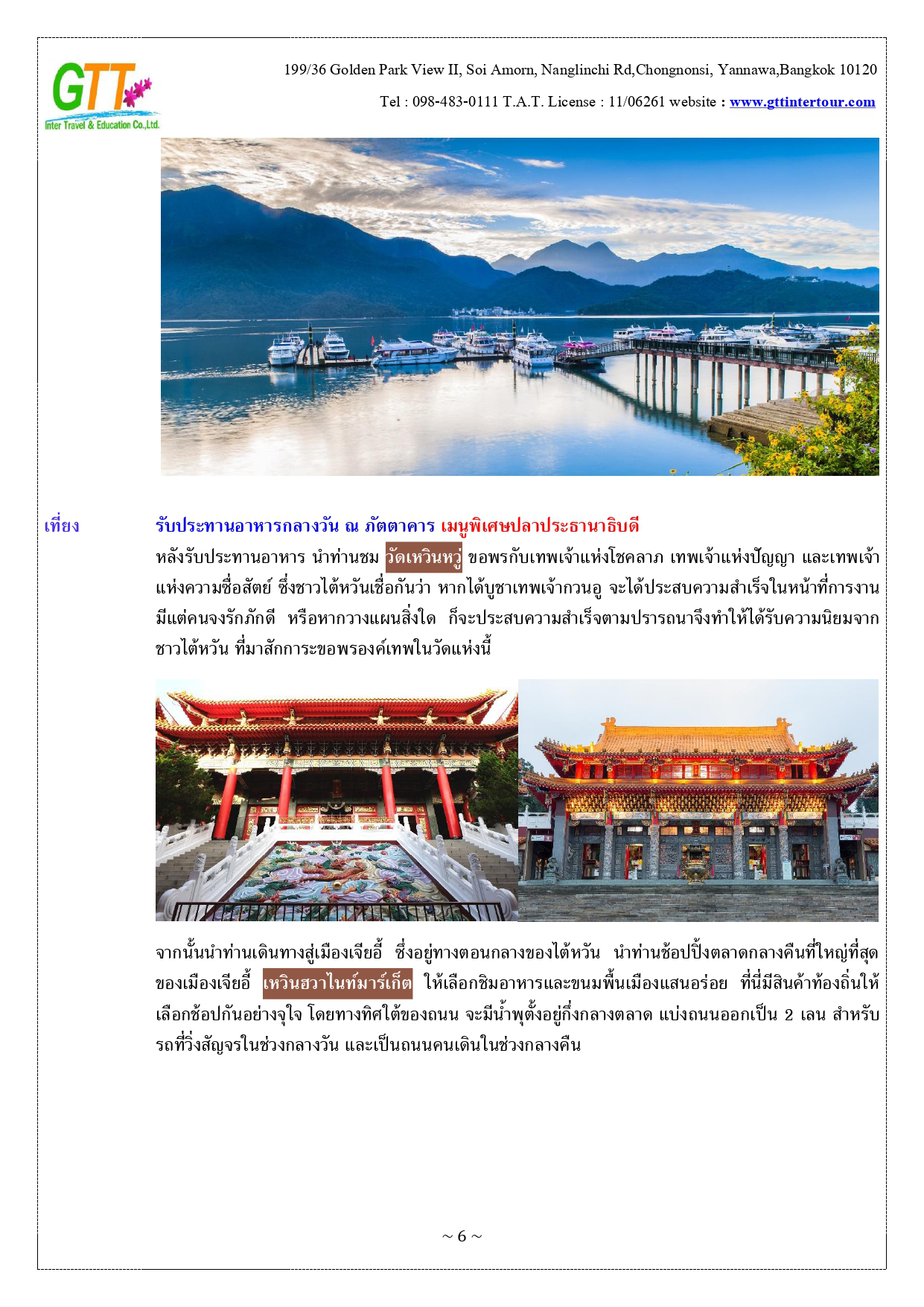 หนานโถว - ล่องเรือทะเลสาบสุริยันจันทรา (รวมค่าล่องเรือ) - วัดพระถังซัมจั๋ง - วัดเหวินหวู่ - เมืองเจียอี้ - เหวินฮวาไนท์มาร์เก็ต - อุทยานแห่งชาติอาหลีซาน - นั่งรถไฟโบราณชมสนพันปี (รวมค่าบัตรและค่ารถไฟ) - เมืองไถจง - โรงละครแห่งชาติไถจง (ถ่ายรูปด้านหน้า) - ไถจงไนท์มาร์เก็ต - ท่าเรือประมงเจิ้งปิน - หมู่บ้านโบราณจิ่วเฟิ่น - อนุสรณ์สถานเจียงไคเชค - ตึกไทเป 101 - ซีเหมินติง - วัดหลงซาน