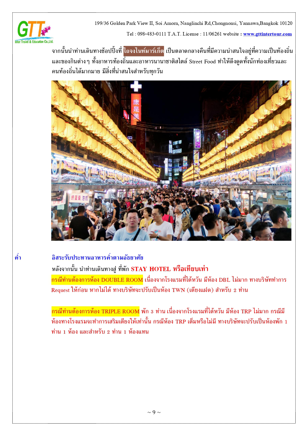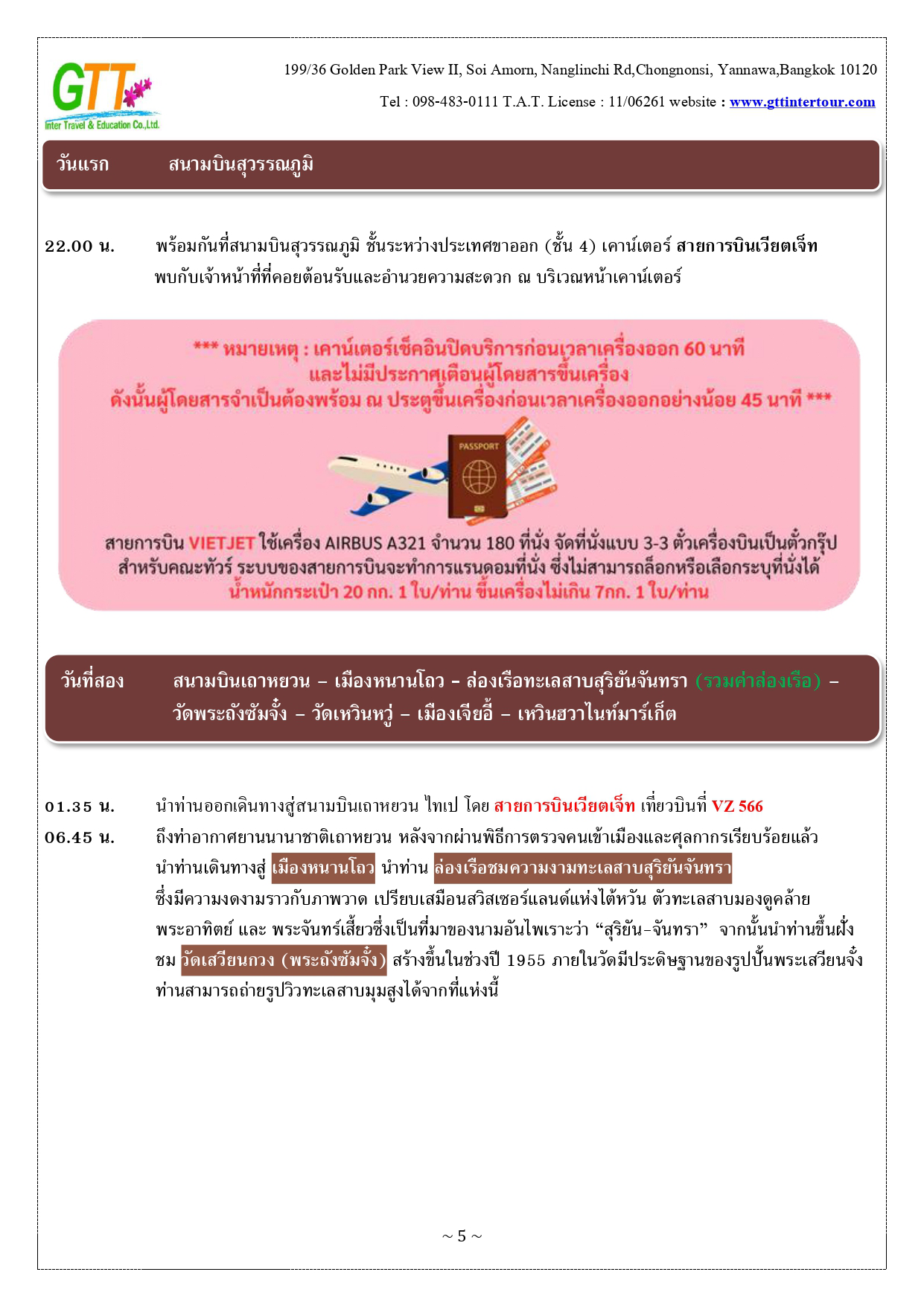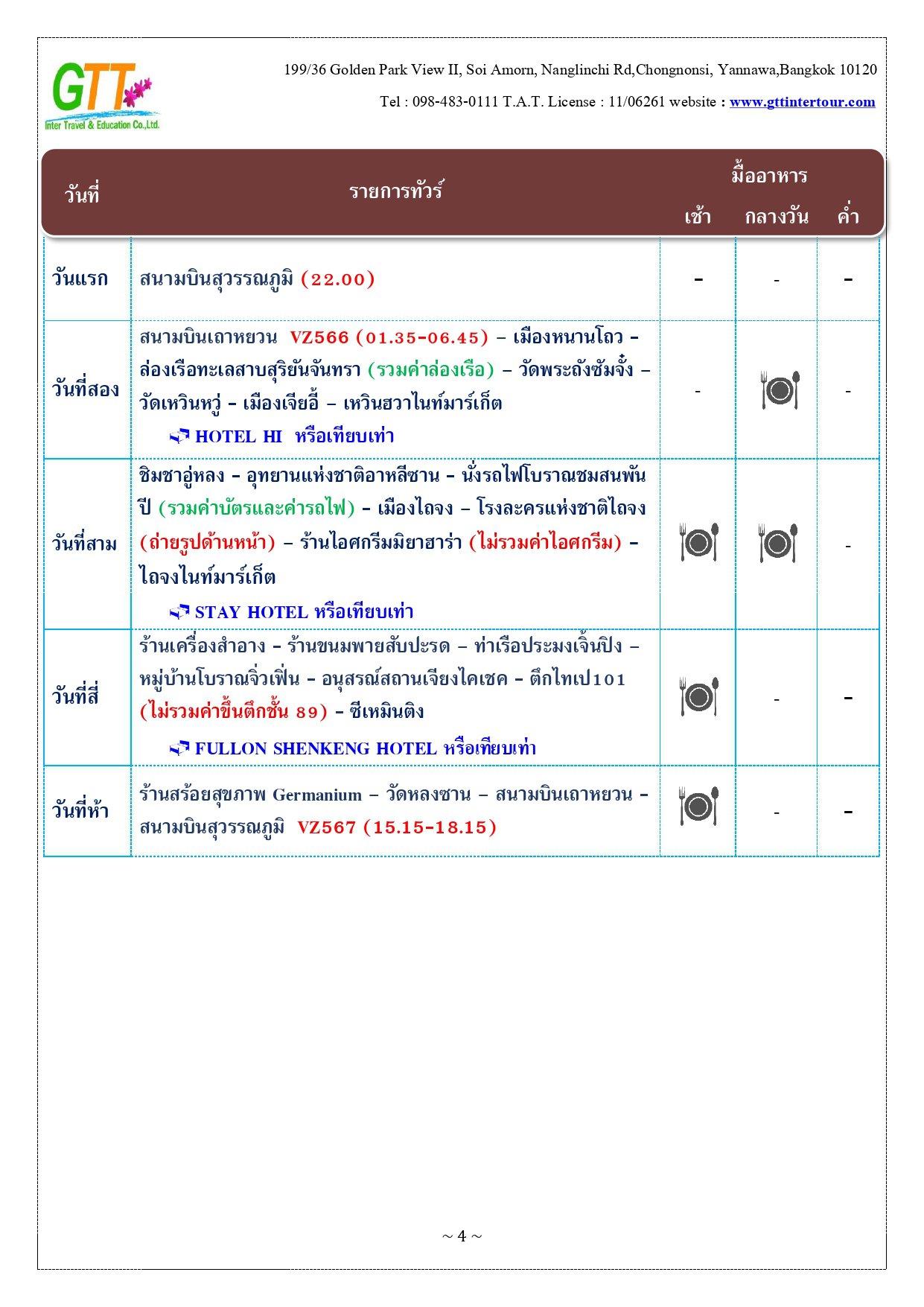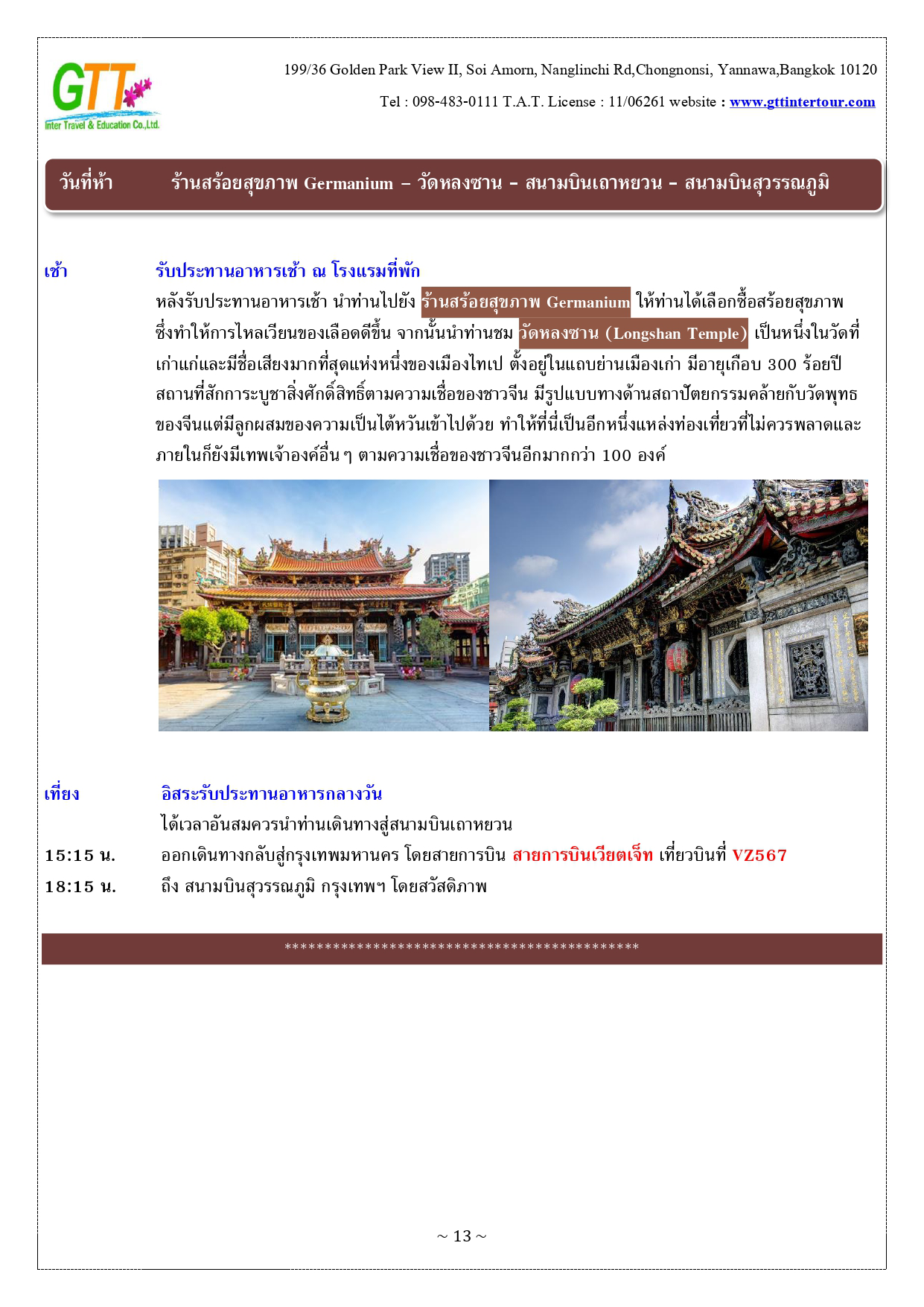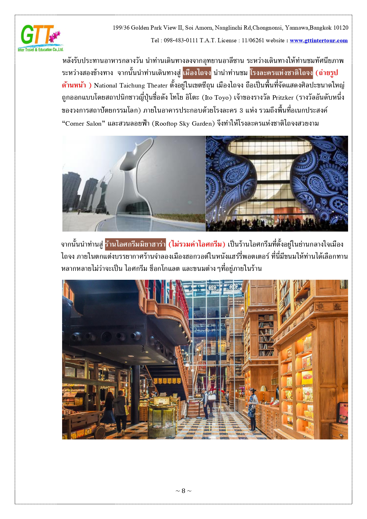 หนานโถว - ล่องเรือทะเลสาบสุริยันจันทรา (รวมค่าล่องเรือ) - วัดพระถังซัมจั๋ง - วัดเหวินหวู่ - เมืองเจียอี้ - เหวินฮวาไนท์มาร์เก็ต - อุทยานแห่งชาติอาหลีซาน - นั่งรถไฟโบราณชมสนพันปี (รวมค่าบัตรและค่ารถไฟ) - เมืองไถจง - โรงละครแห่งชาติไถจง (ถ่ายรูปด้านหน้า) - ไถจงไนท์มาร์เก็ต - ท่าเรือประมงเจิ้งปิน - หมู่บ้านโบราณจิ่วเฟิ่น - อนุสรณ์สถานเจียงไคเชค - ตึกไทเป 101 - ซีเหมินติง - วัดหลงซาน