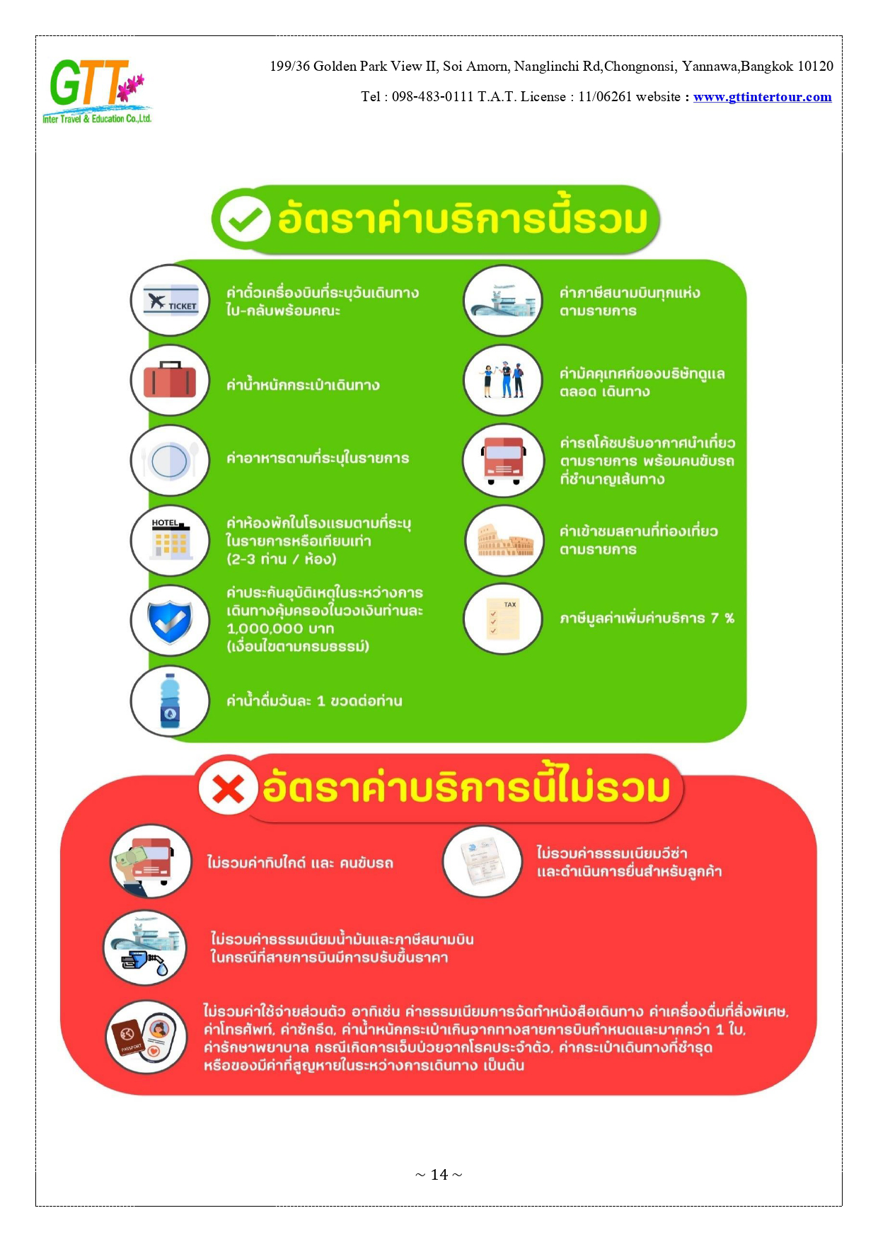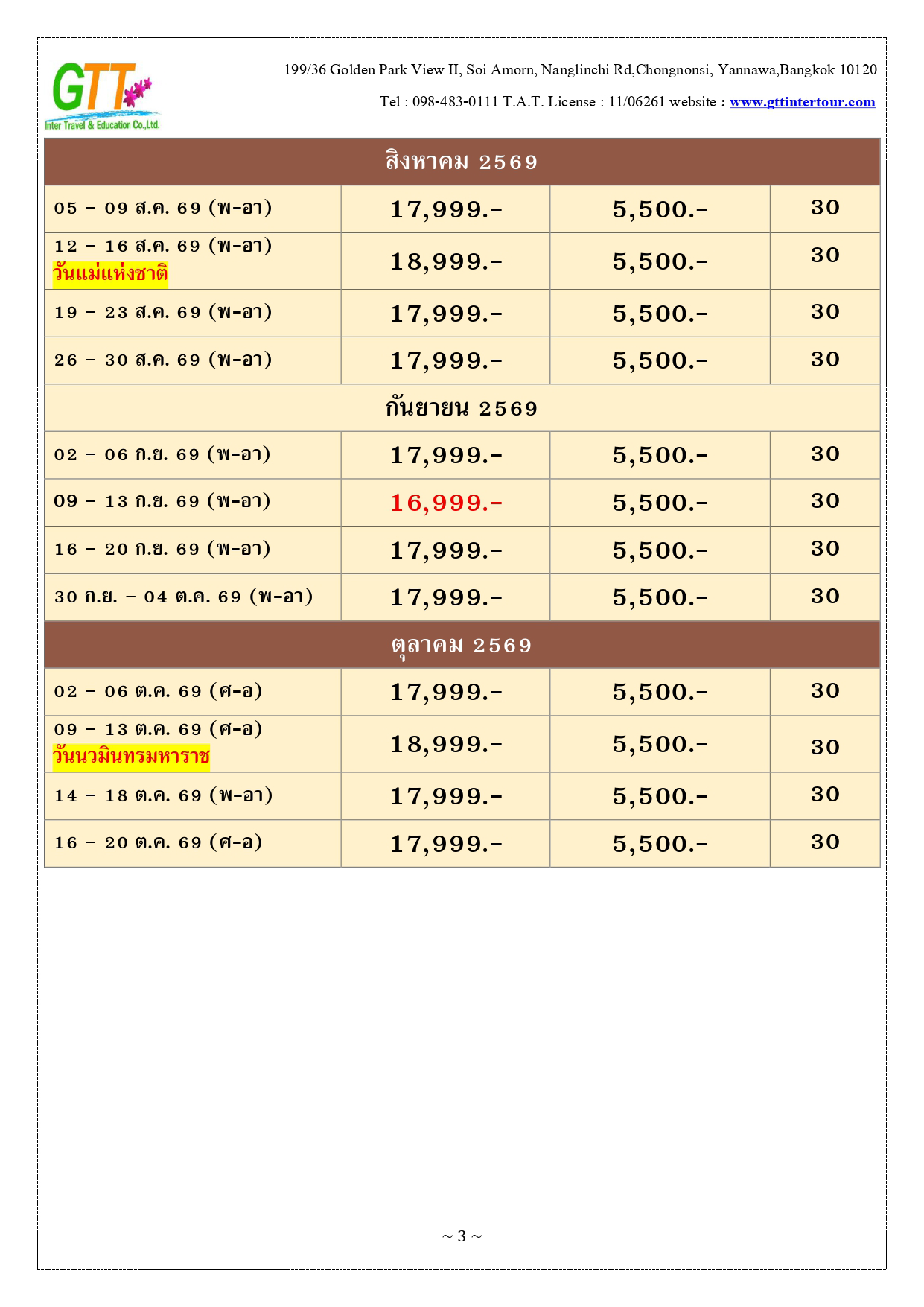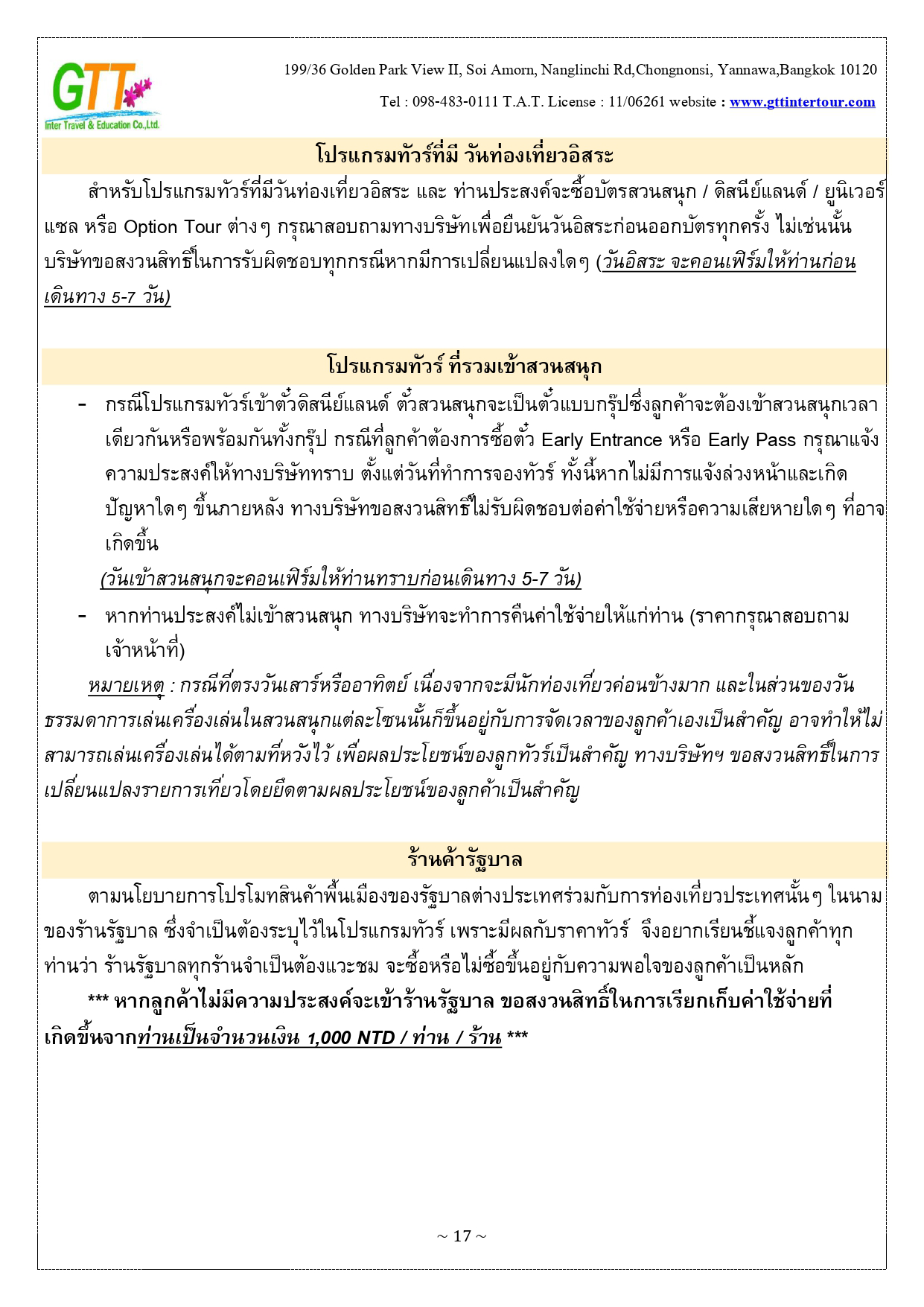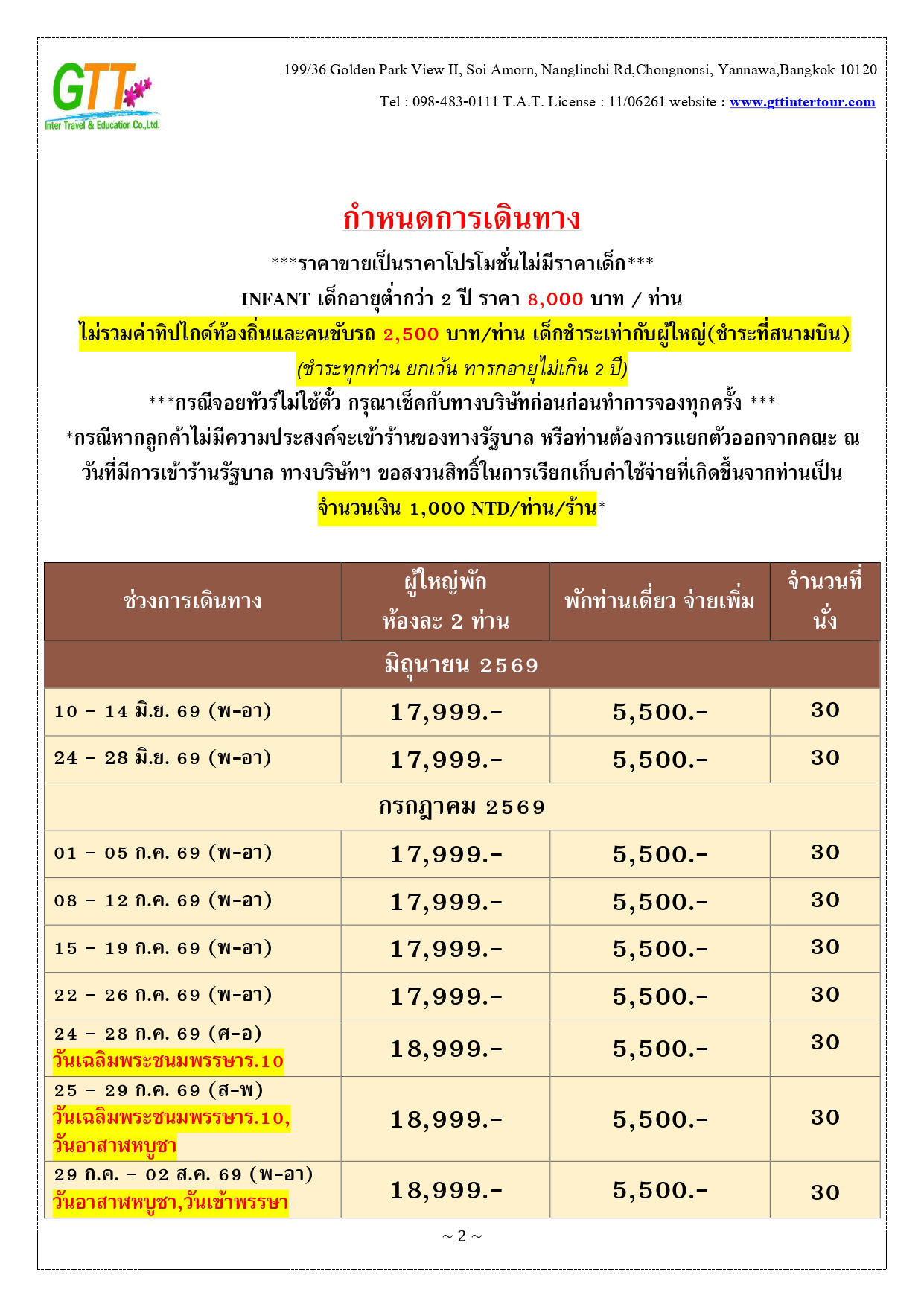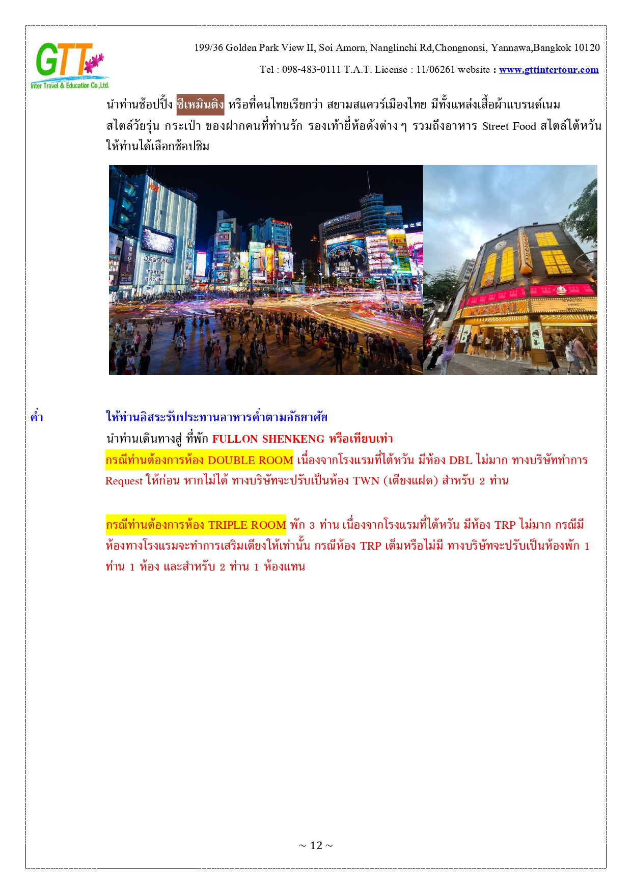 หนานโถว - ล่องเรือทะเลสาบสุริยันจันทรา (รวมค่าล่องเรือ) - วัดพระถังซัมจั๋ง - วัดเหวินหวู่ - เมืองเจียอี้ - เหวินฮวาไนท์มาร์เก็ต - อุทยานแห่งชาติอาหลีซาน - นั่งรถไฟโบราณชมสนพันปี (รวมค่าบัตรและค่ารถไฟ) - เมืองไถจง - โรงละครแห่งชาติไถจง (ถ่ายรูปด้านหน้า) - ไถจงไนท์มาร์เก็ต - ท่าเรือประมงเจิ้งปิน - หมู่บ้านโบราณจิ่วเฟิ่น - อนุสรณ์สถานเจียงไคเชค - ตึกไทเป 101 - ซีเหมินติง - วัดหลงซาน